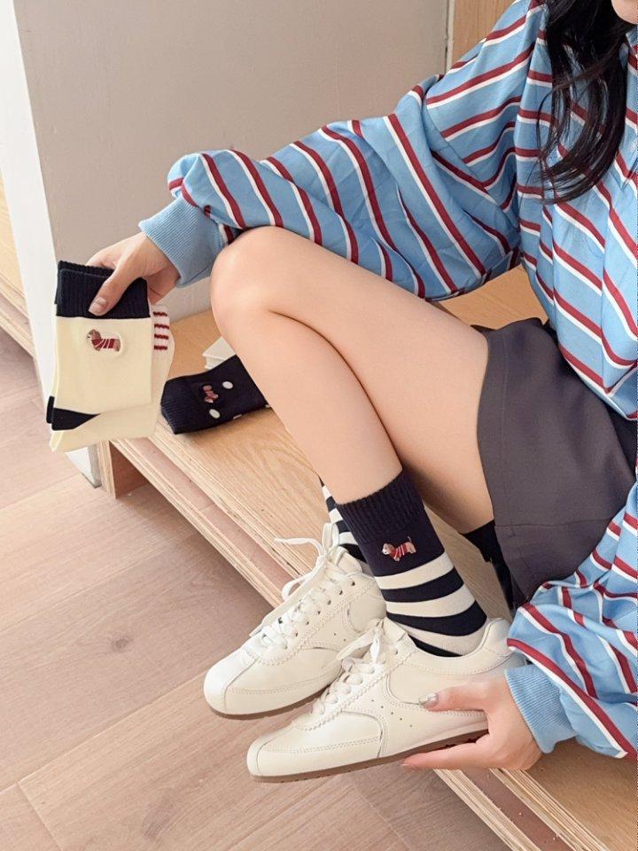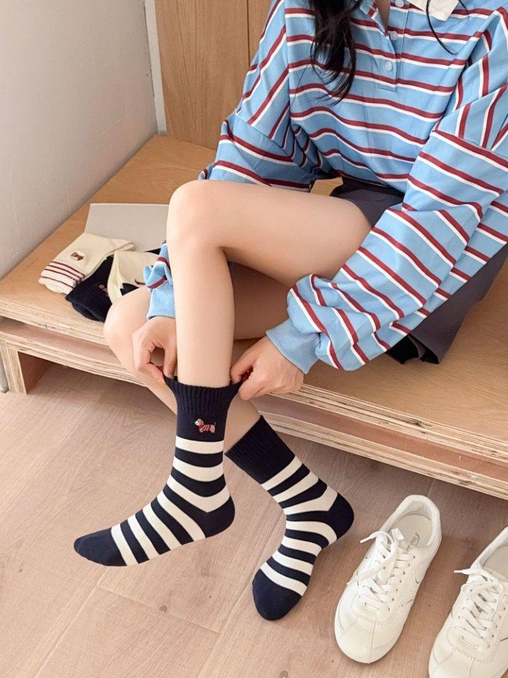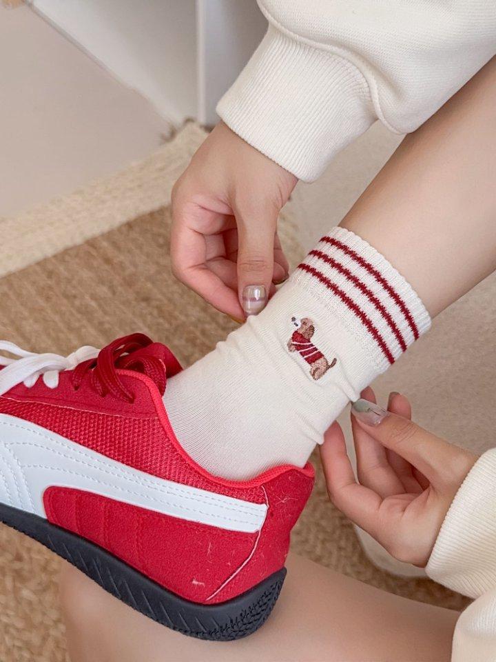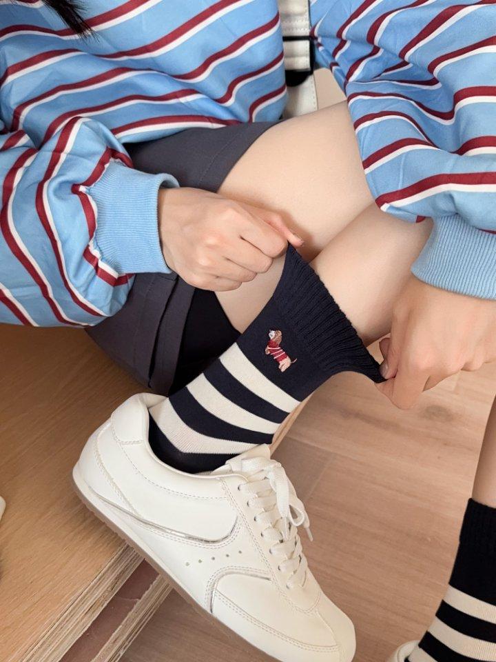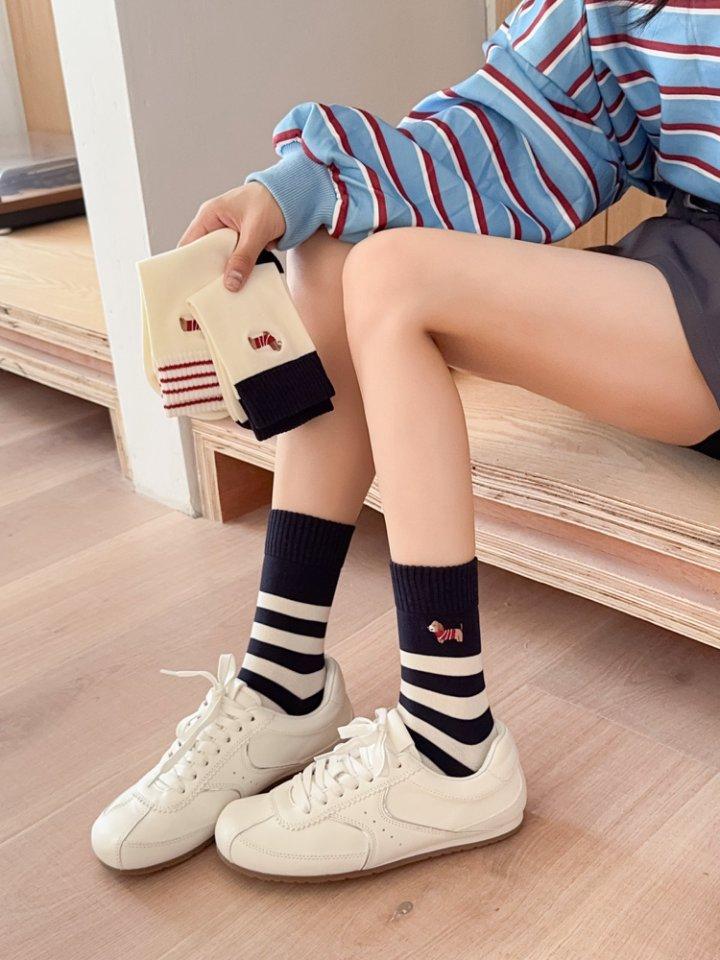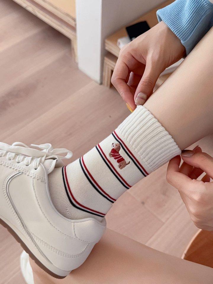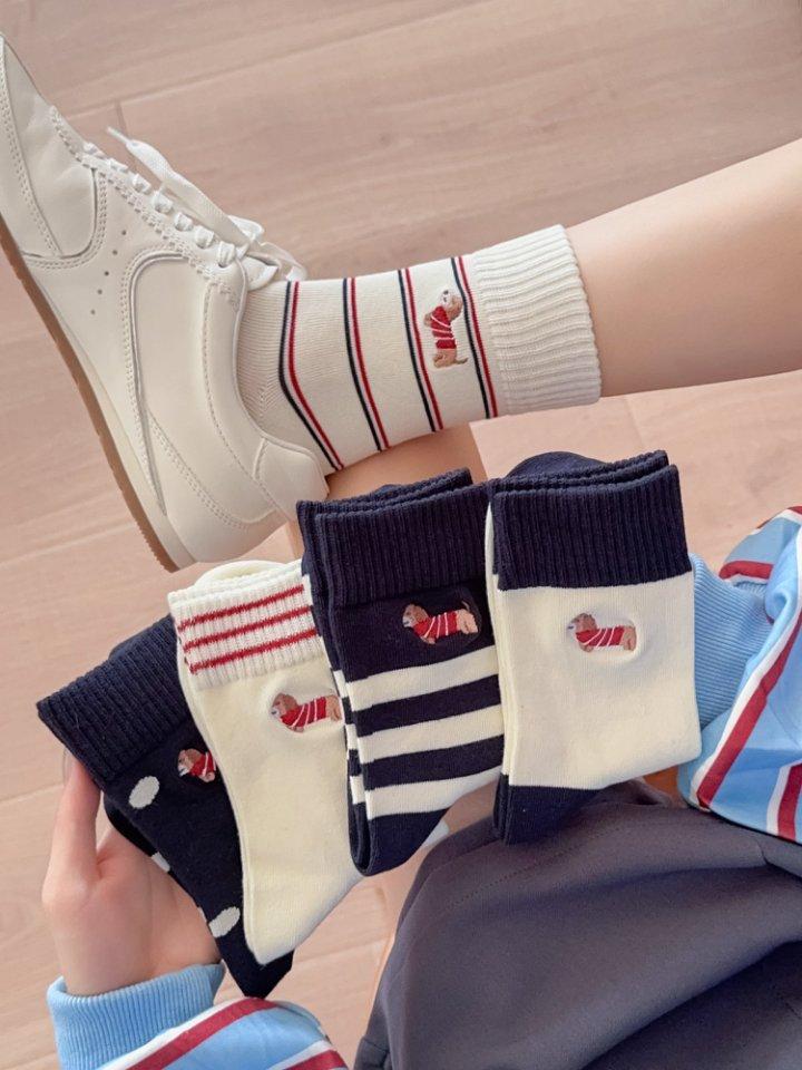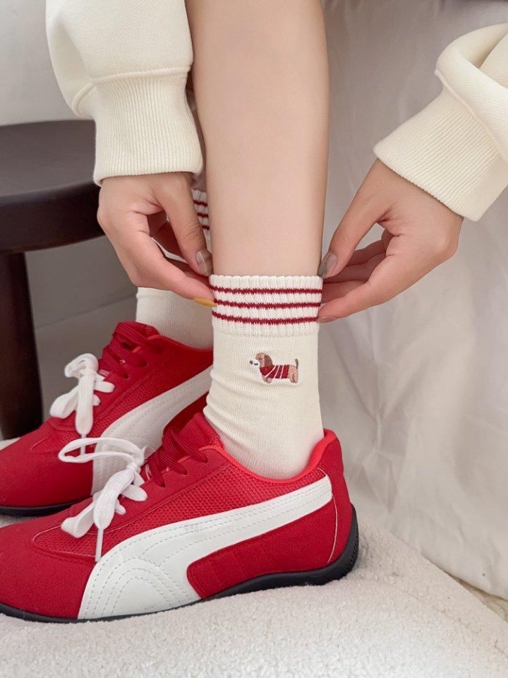 Calcetines de media pantorrilla a rayas de estilo coreano ins de moda para otoño e invierno con bordado de dibujos animados de cachorro de teckel lindo, calcetines largos holgados estilo universitario
