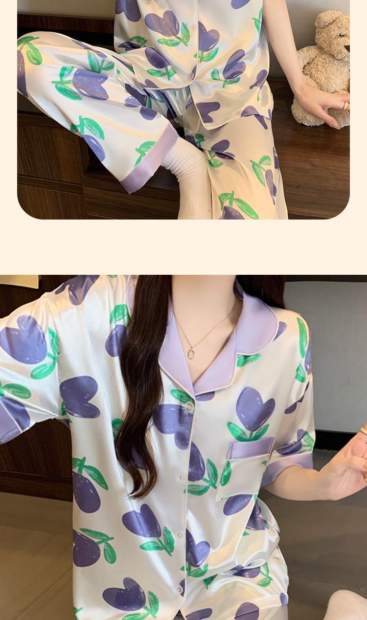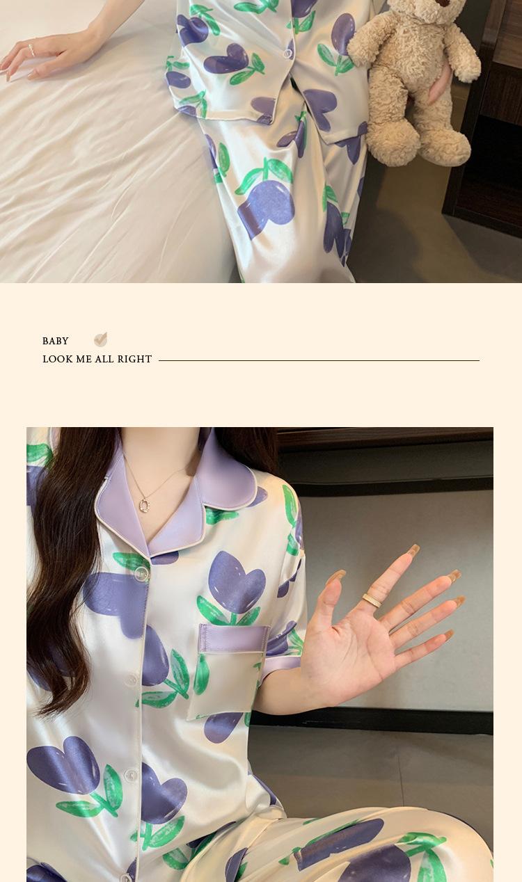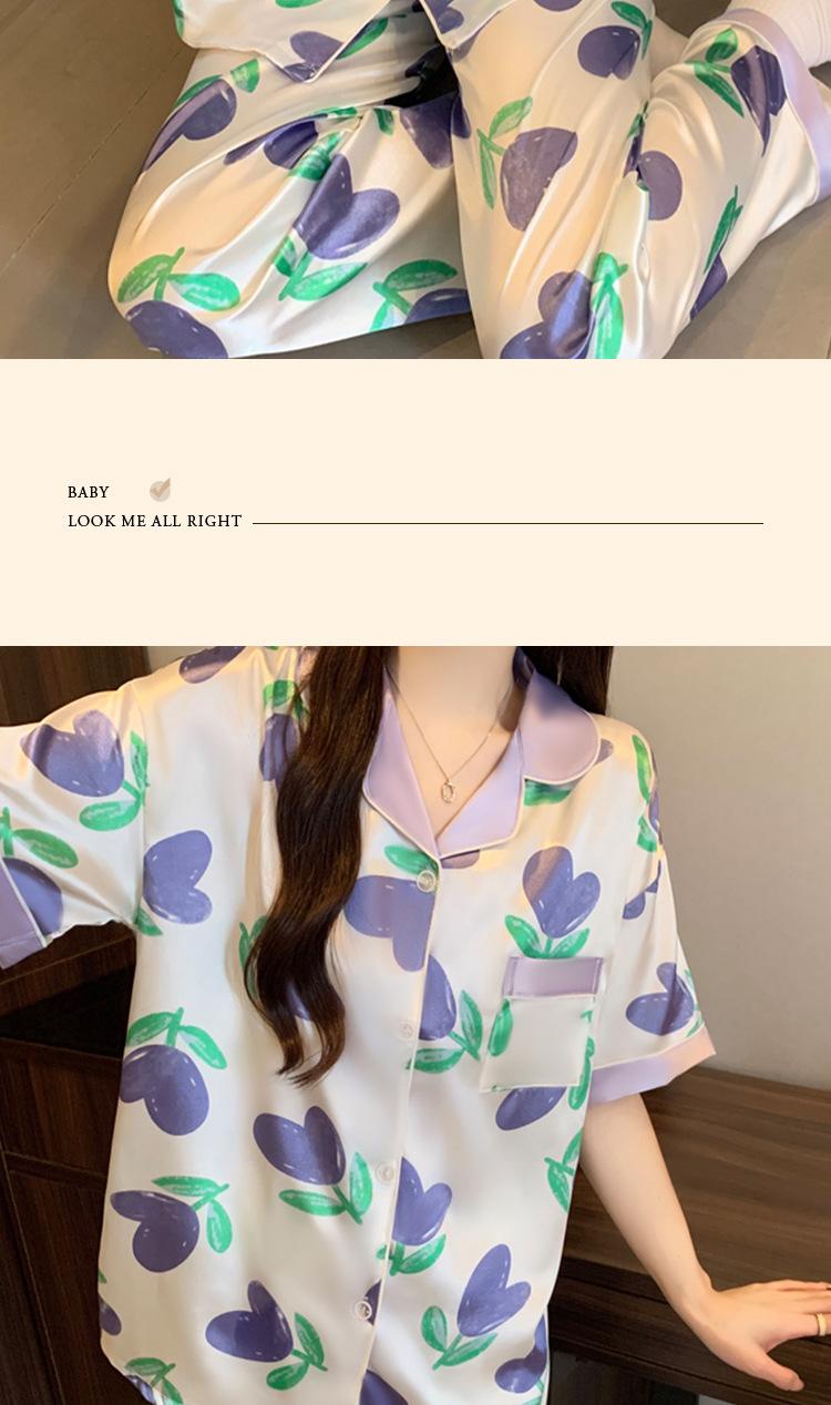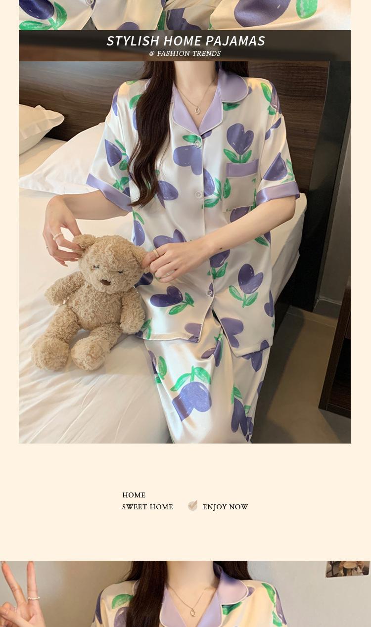 Pijama de Seda de Hielo de Estilo Coreano Tulipán Dulce Color Contrastante para Mujer Temperamento Verano Manga Corta Traje Casual Se Puede Usar Afuera Venta al por Mayor