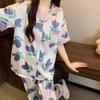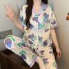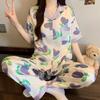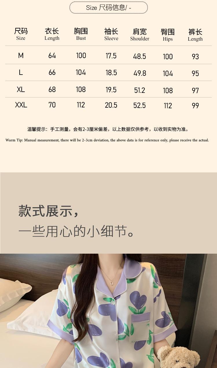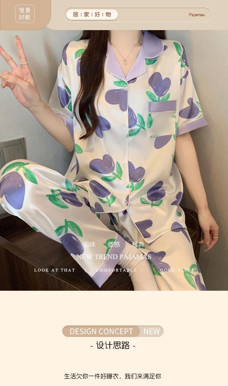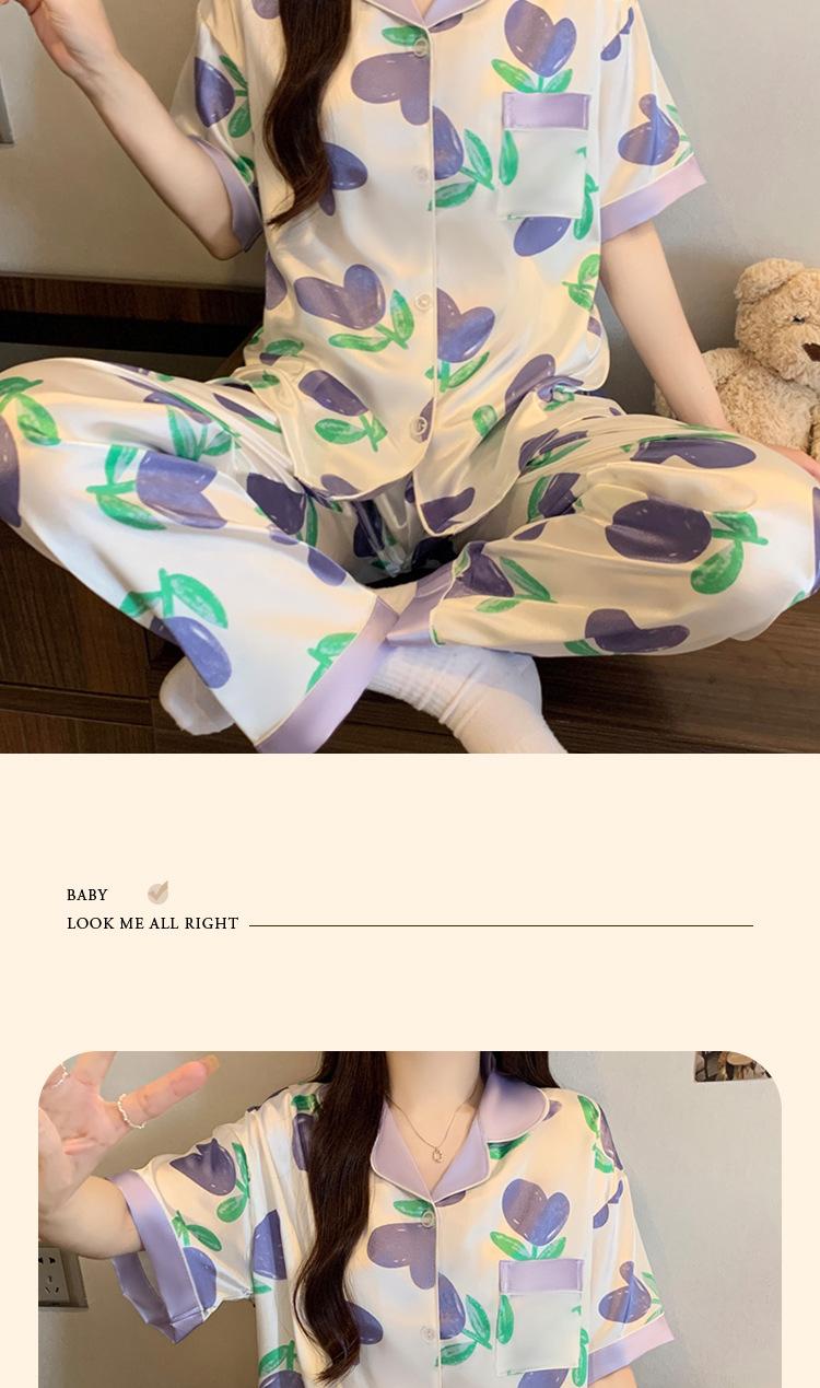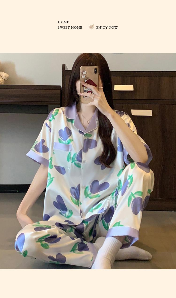 Pijama de Seda de Hielo de Estilo Coreano Tulipán Dulce Color Contrastante para Mujer Temperamento Verano Manga Corta Traje Casual Se Puede Usar Afuera Venta al por Mayor