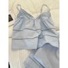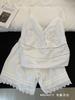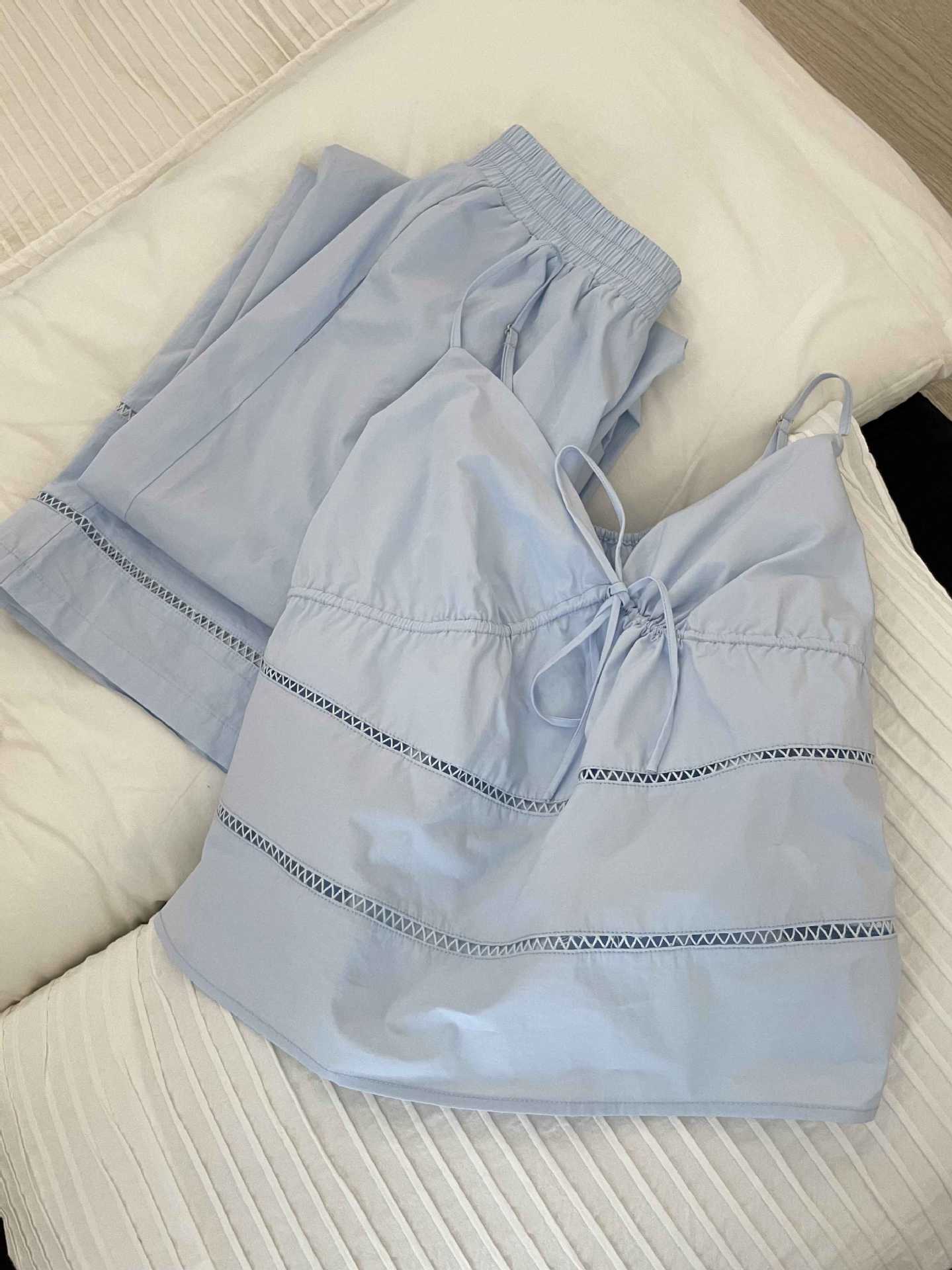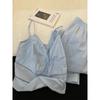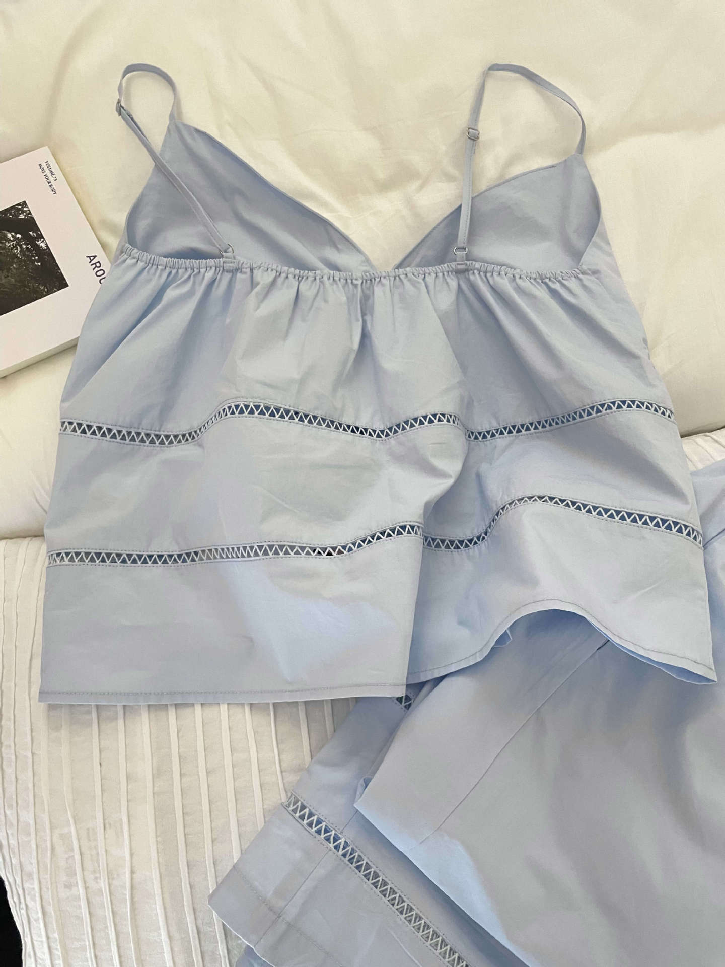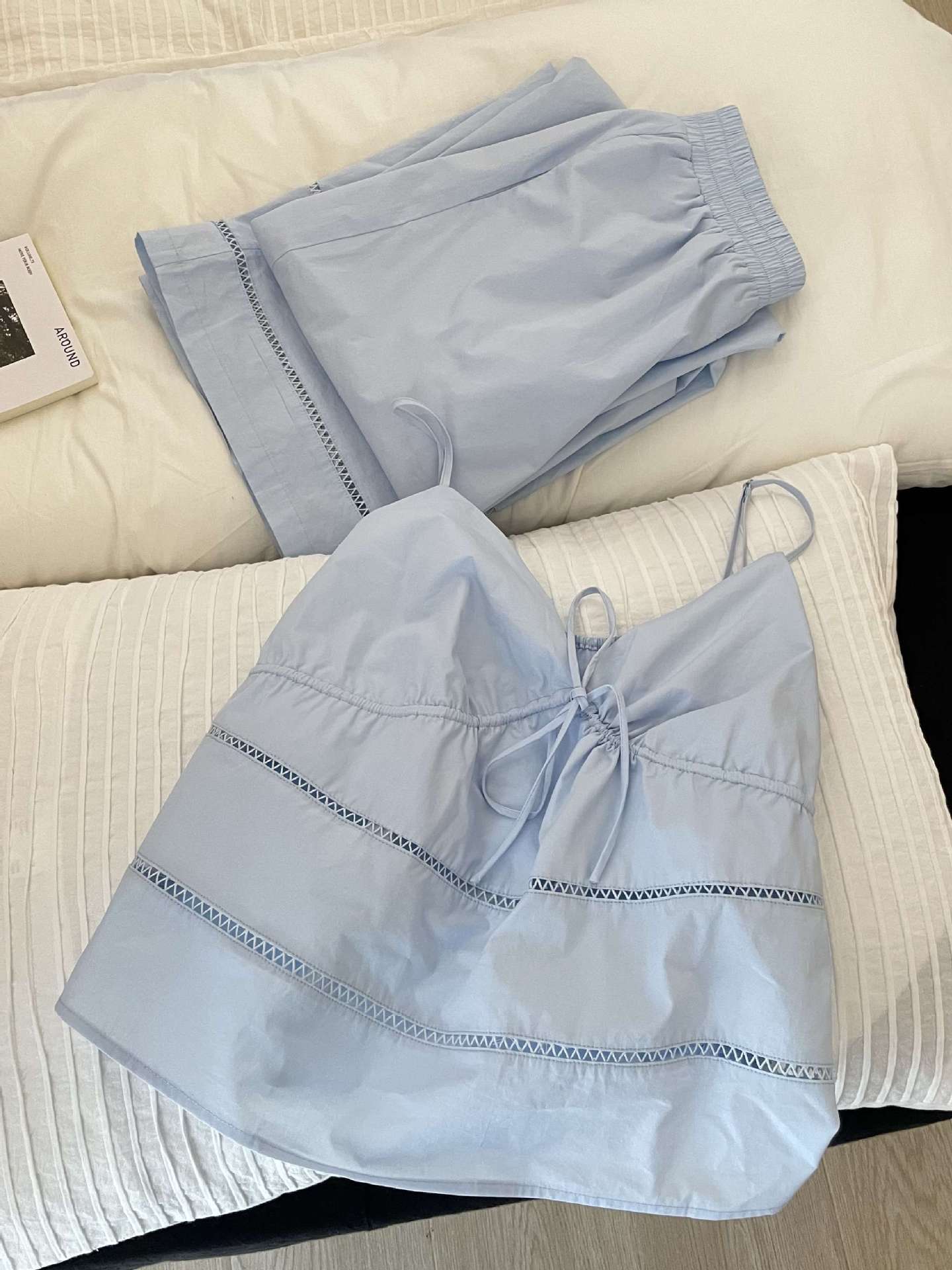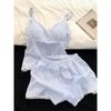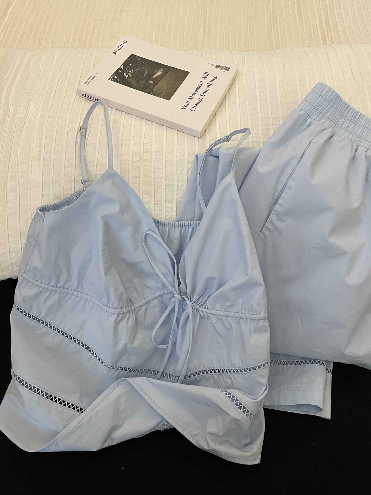 Pijama Coreano de Encaje Azul con Cordones y Cuello en V para Mujer, Verano, Deseo Puro de Niña, Chaleco Calado, Shorts, Traje de Ropa para el Hogar