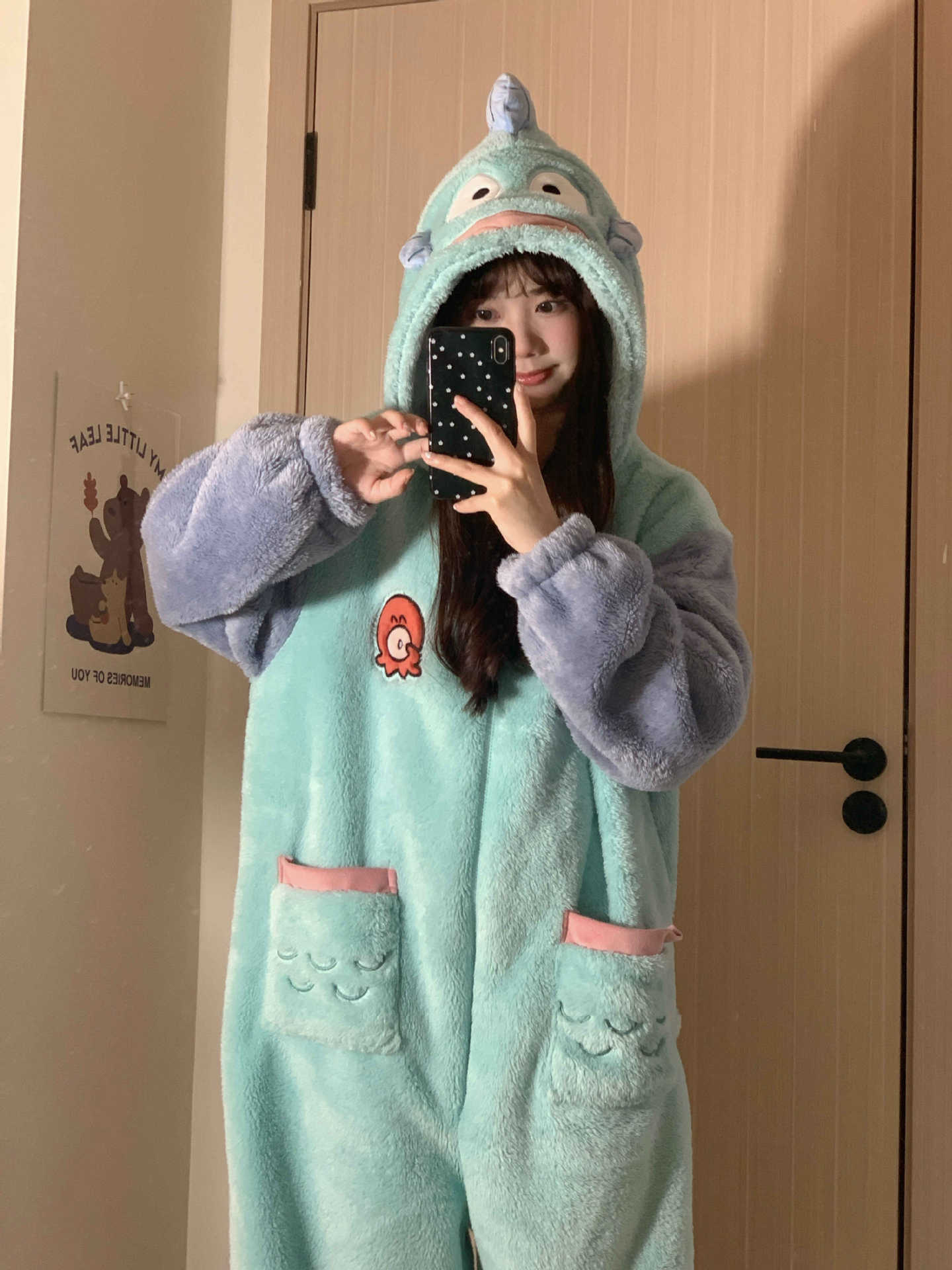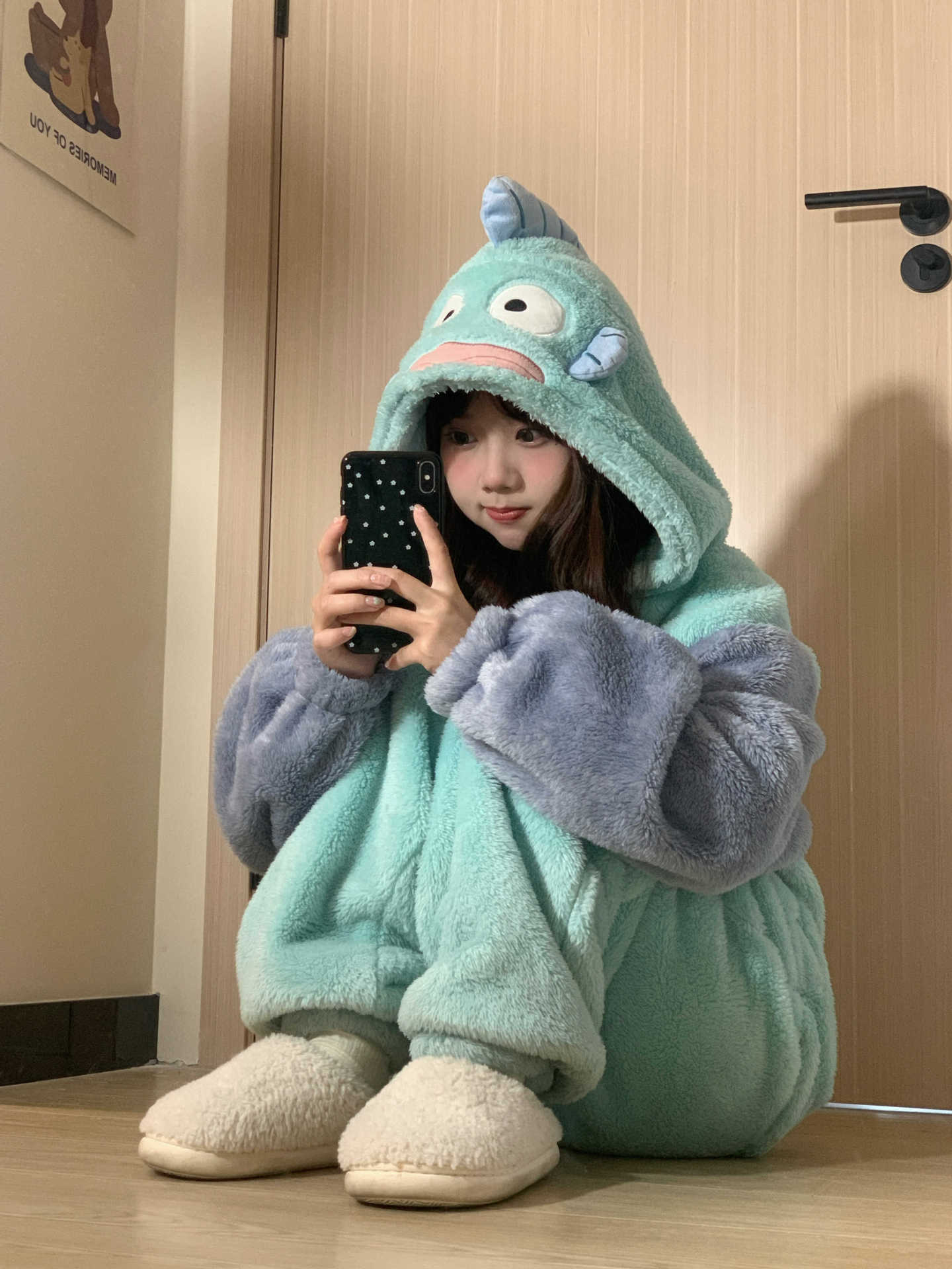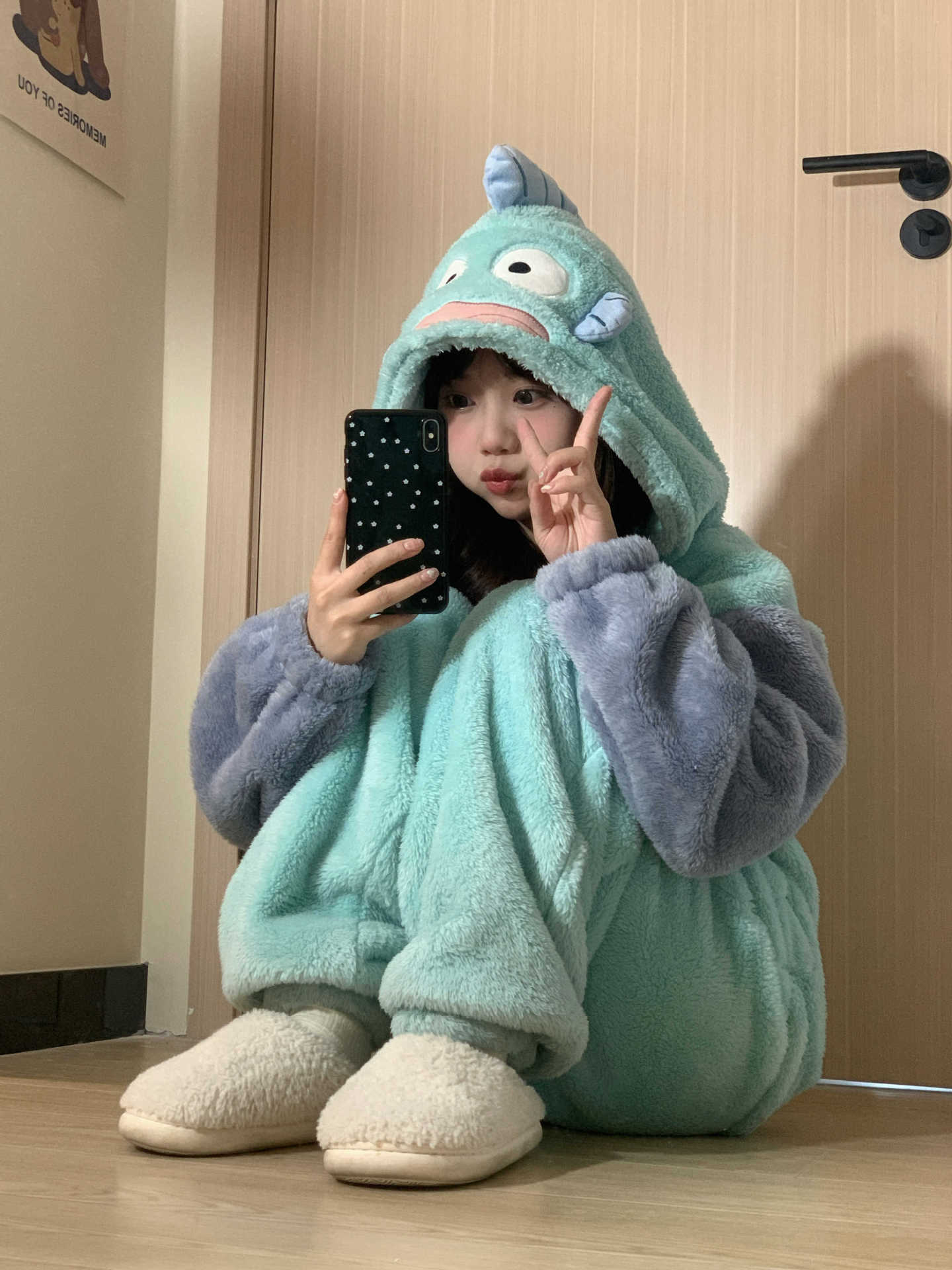 Pijama de forro polar coral con diseño de pez feo de dibujos animados para mujer, pijama de invierno grueso de terciopelo con diseño de sirena divertido, conjunto para el hogar