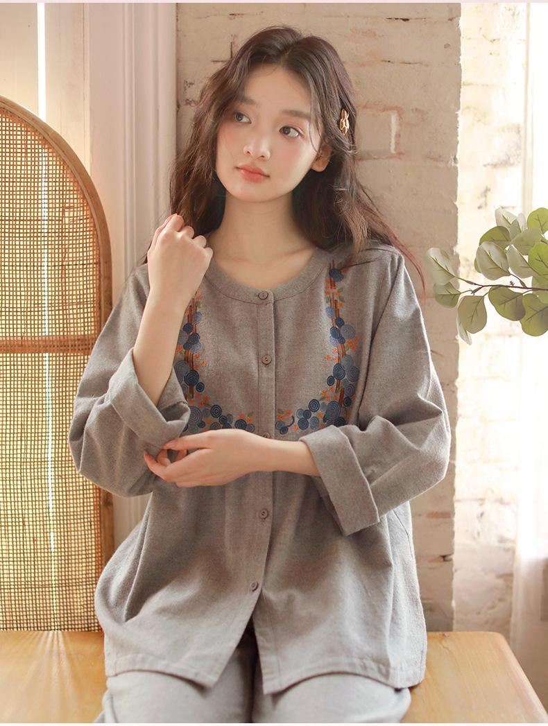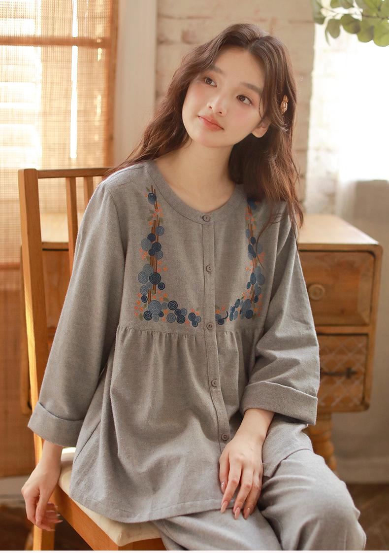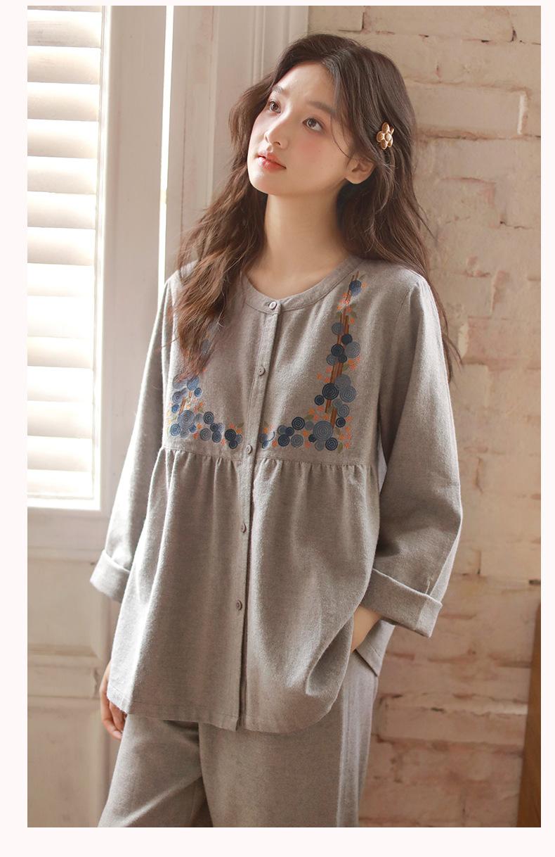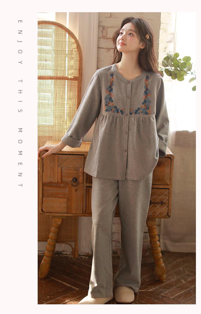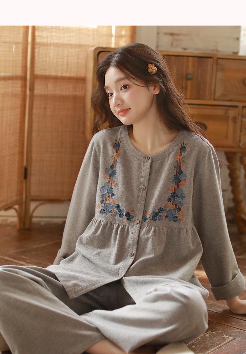 Otoño Nuevo Pijama de Mujer Algodón Franela Bordado de Alta Gama Manga Larga Ropa de Casa Set de Cuello Redondo