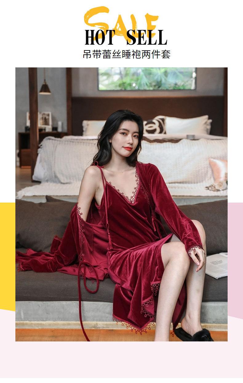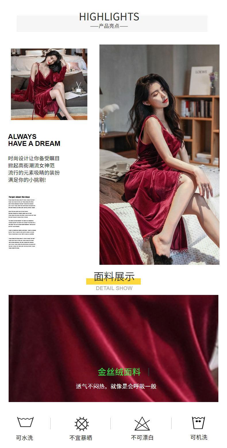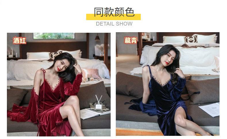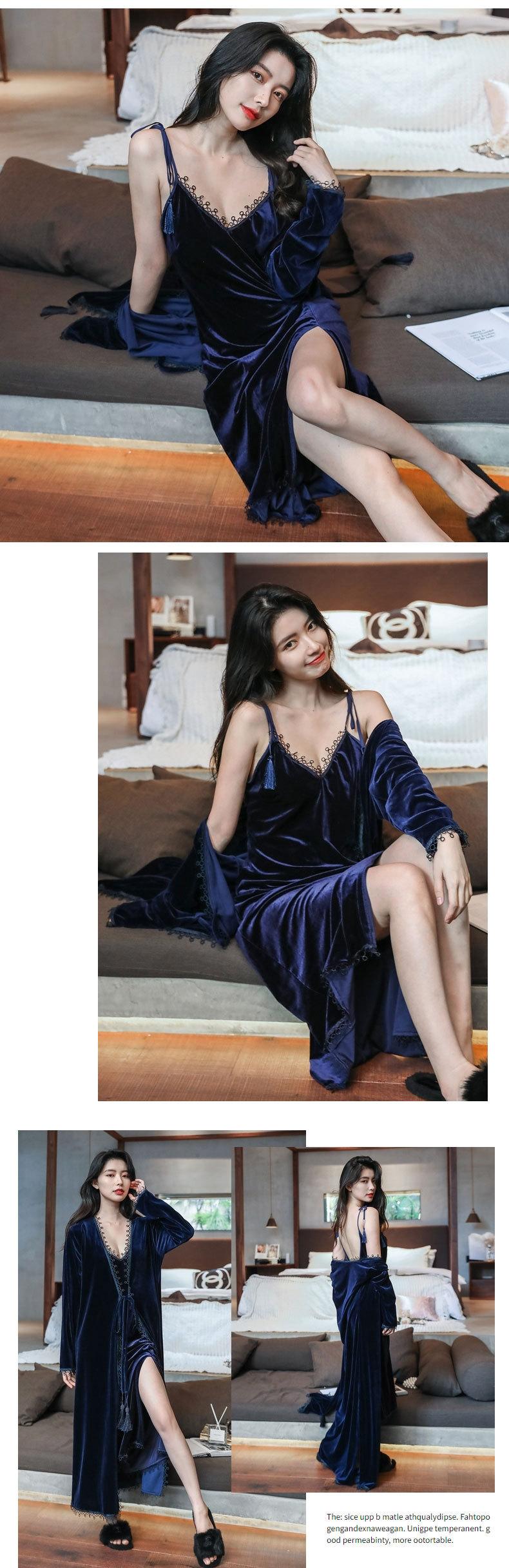 Pijama de Terciopelo Dorado para Mujer Otoño e Invierno Nuevo Sexy Camisola Profunda con Cuello en V Vestido de Noche Largo hasta la Rodilla Bata Conjunto de Dos Piezas Ropa para el Hogar