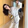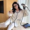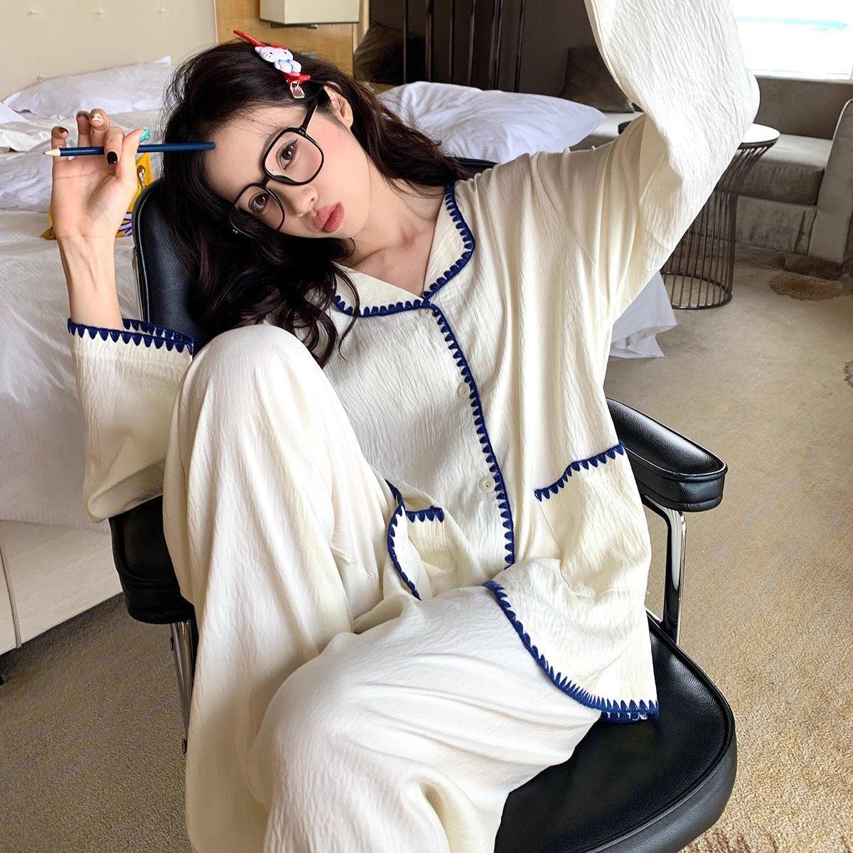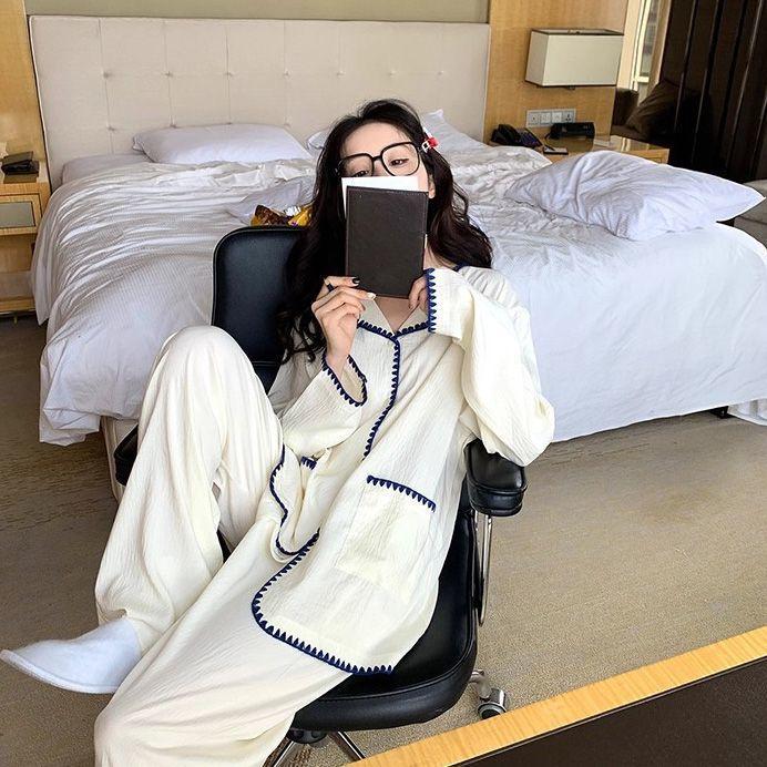 Pijama de encaje de bloque de color estilo ins coreano de manga larga delgada para mujer primavera otoño dulce cómodo se puede usar fuera conjunto de ropa de casa