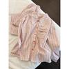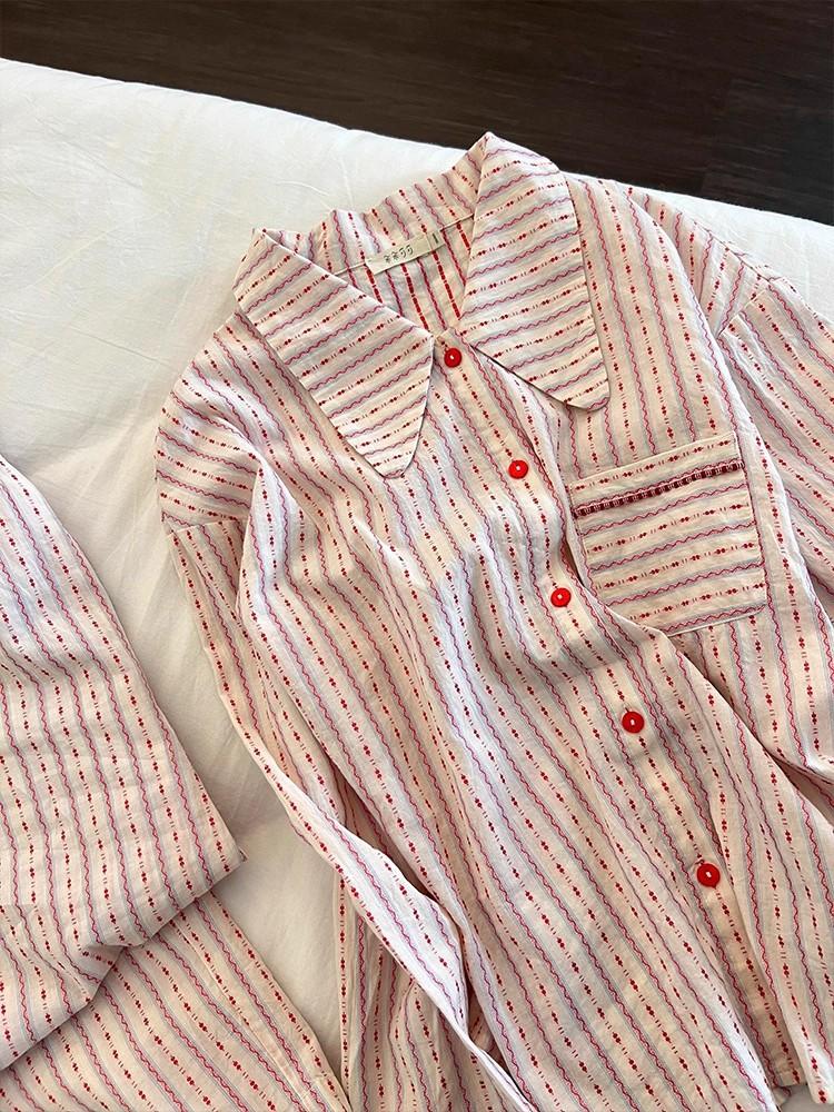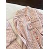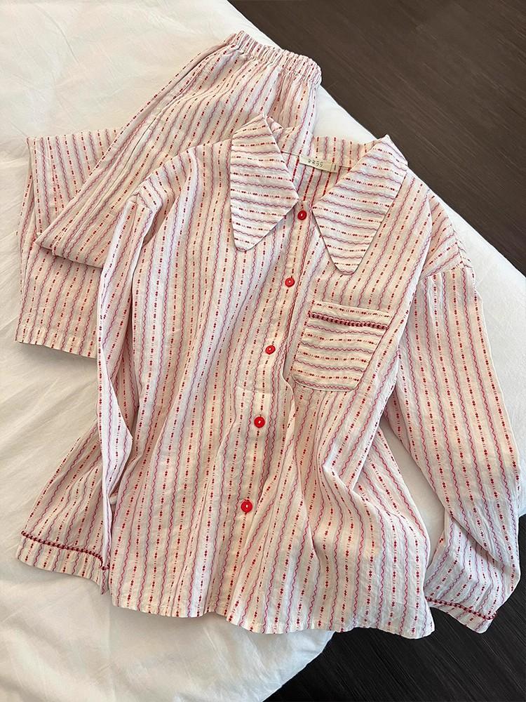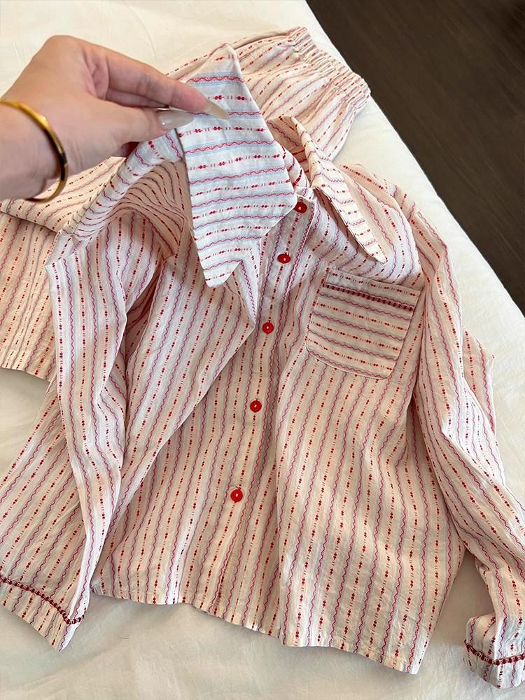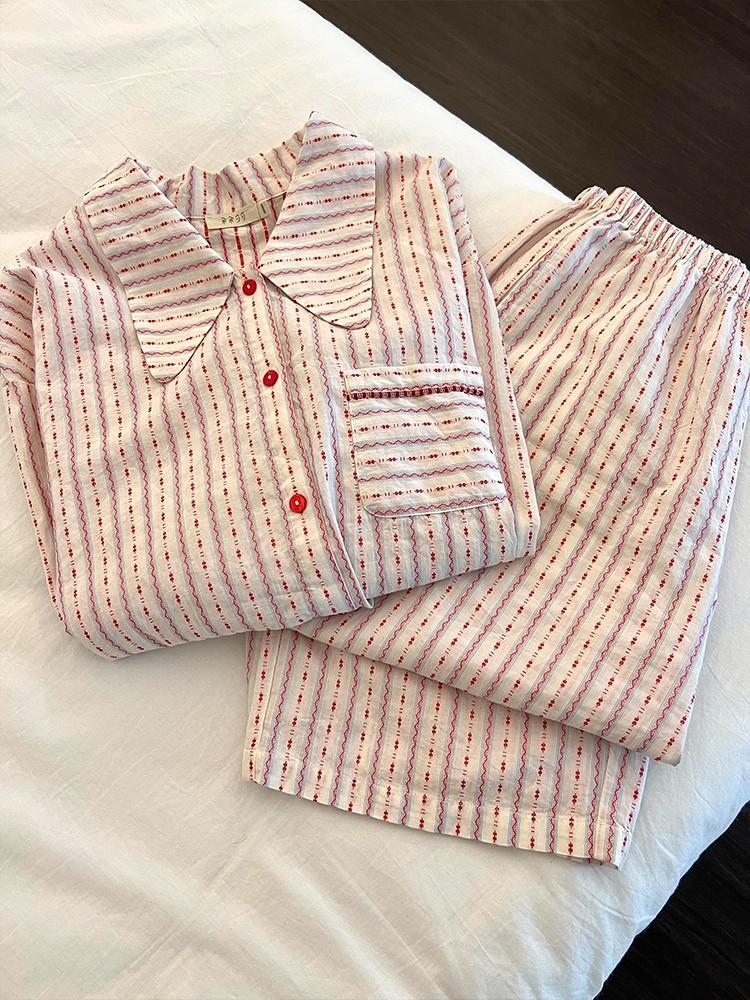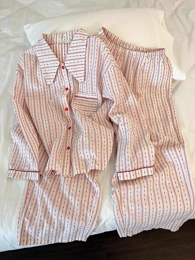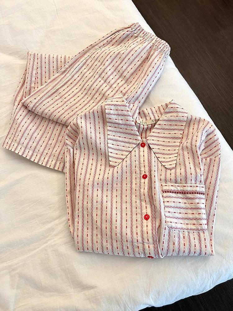 Pijama de rayas francesas para mujer, conjunto de manga larga para primavera y otoño, ropa de casa de algodón nube de alta gama que se puede usar en el exterior, venta al por mayor transfronteriza