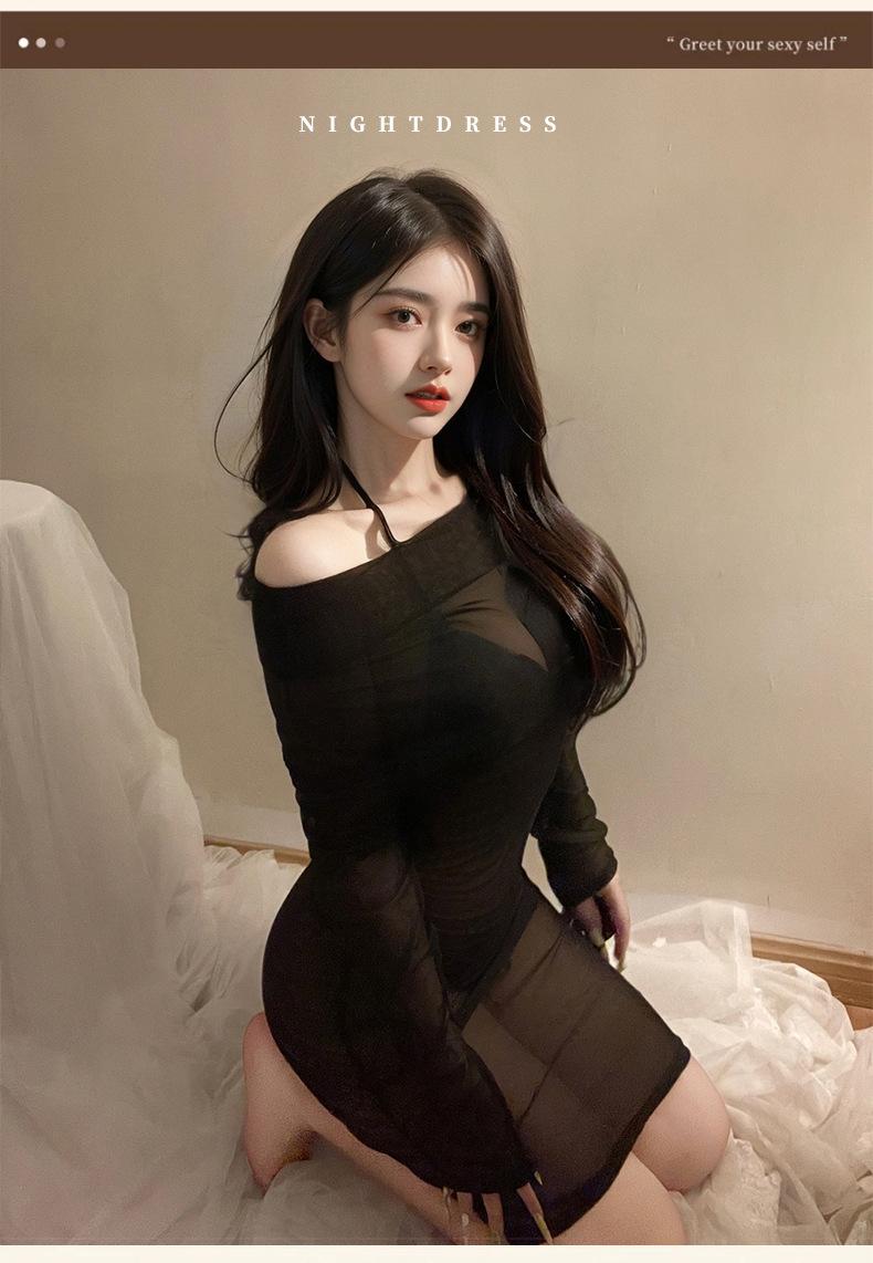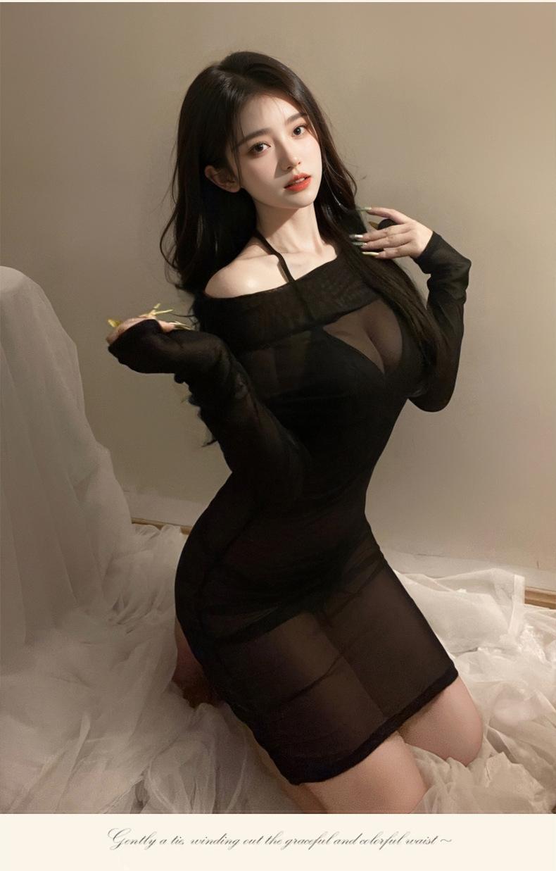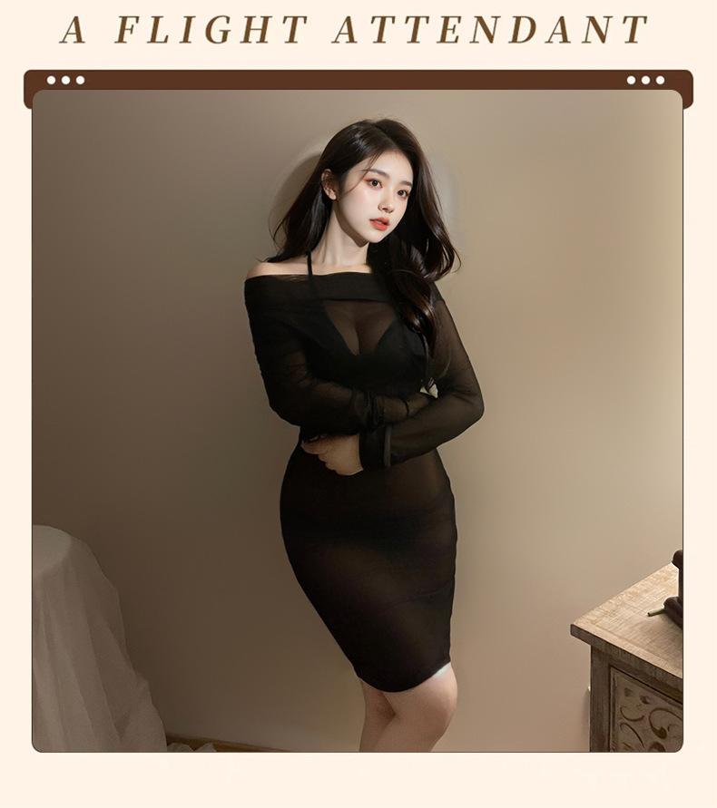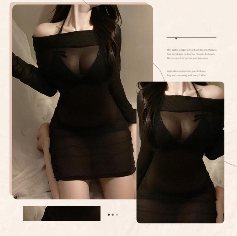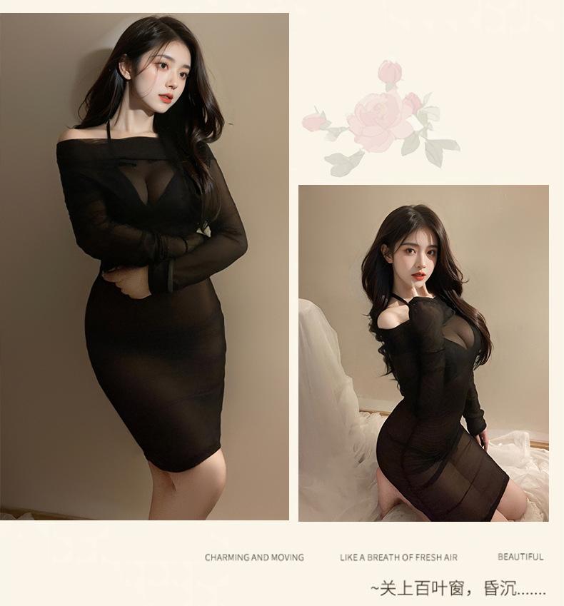 Lemon Story Lencería Erótica Sexy Malla Transparente Hombros Descubiertos Vestido de Noche Ajustado a las Caderas Conjunto de Lencería de Uniforme Caliente 8990