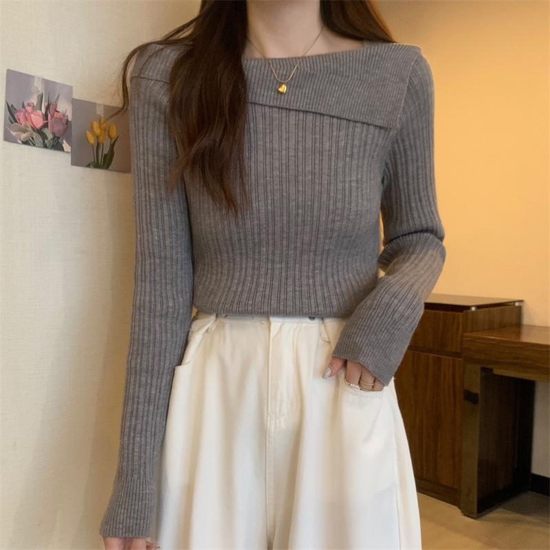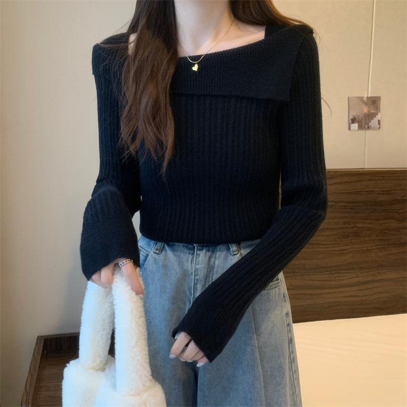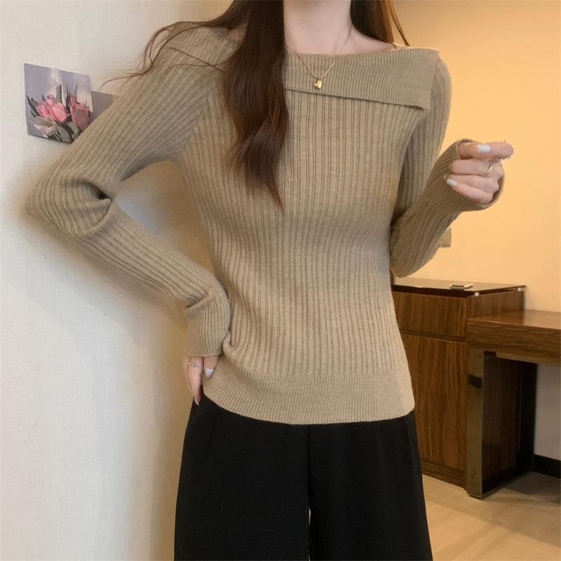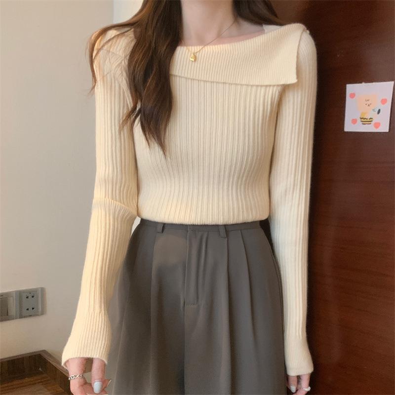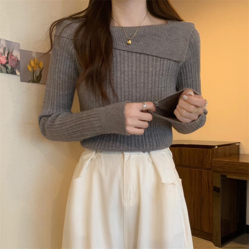 2023 Otoño e Invierno Nuevo Estilo Diseño con Hombros Descubiertos Niche Suéter de Punto para Mujer Color Sólido Dulce Camisa Base Interior para Mujer