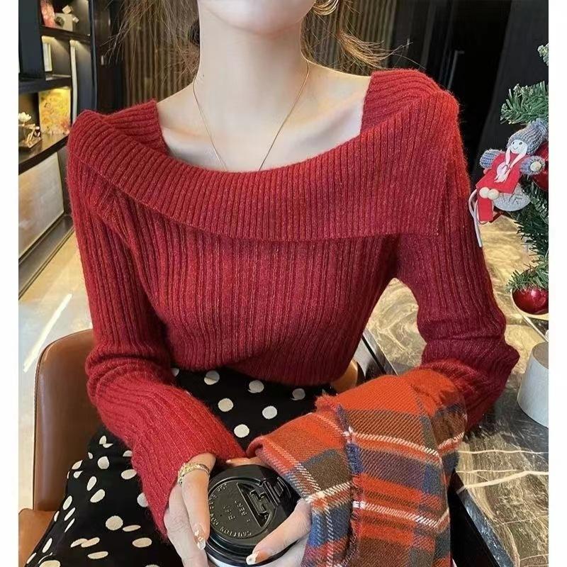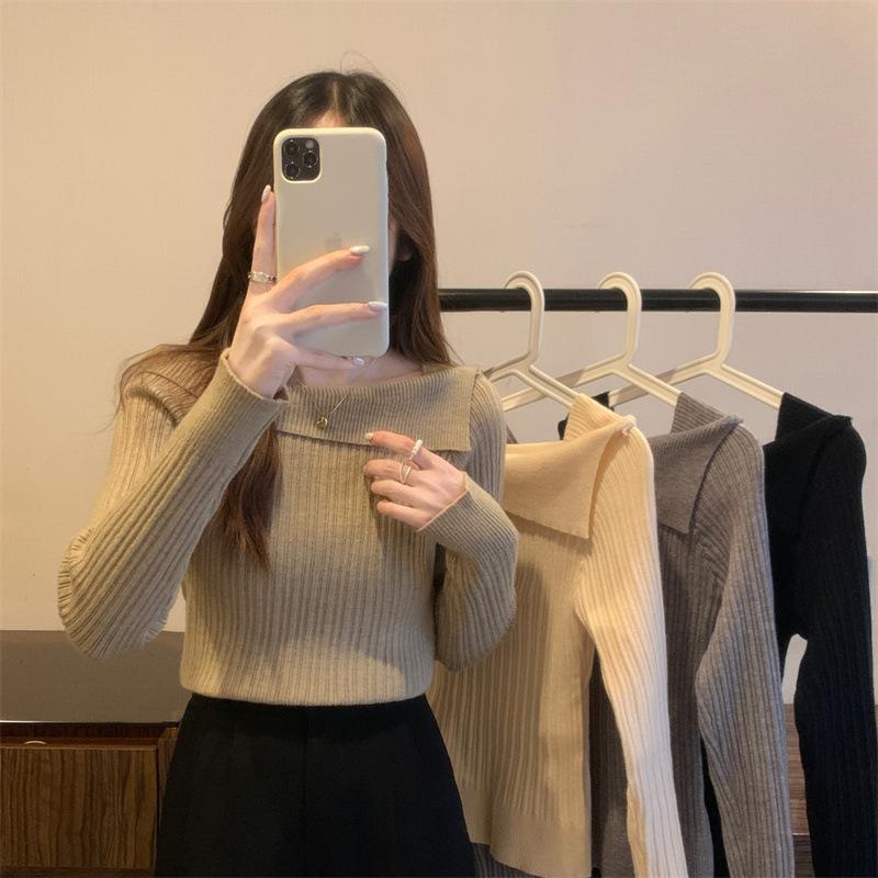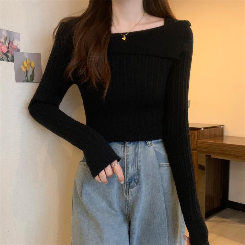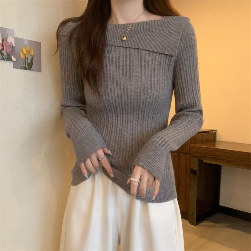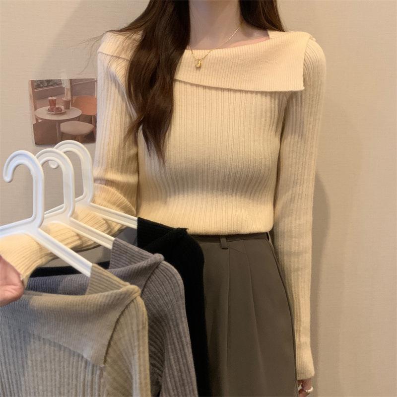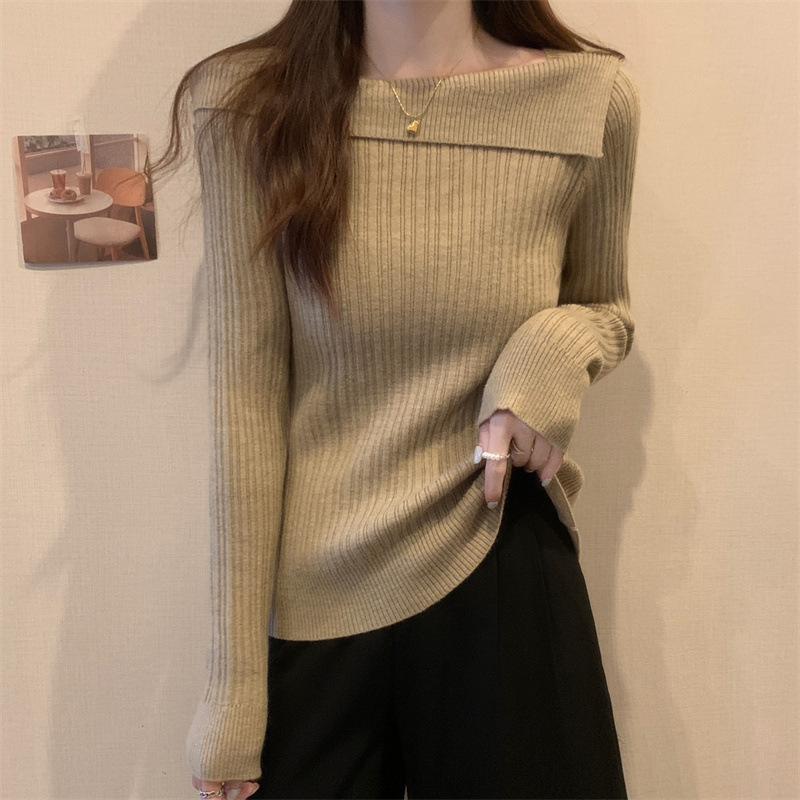 2023 Otoño e Invierno Nuevo Estilo Diseño con Hombros Descubiertos Niche Suéter de Punto para Mujer Color Sólido Dulce Camisa Base Interior para Mujer