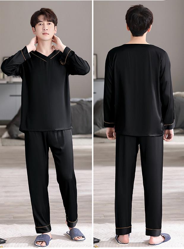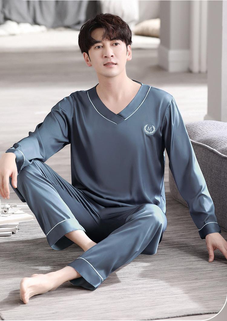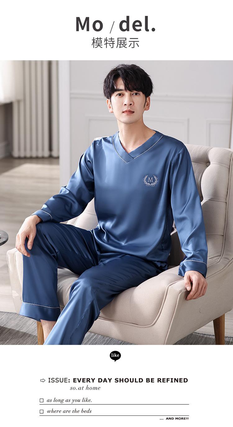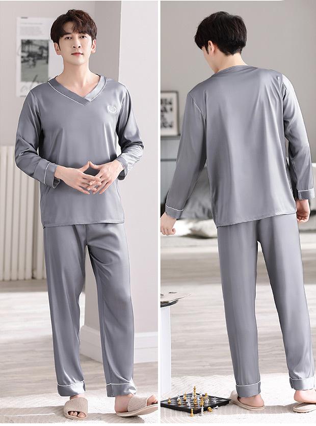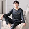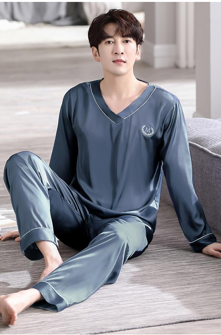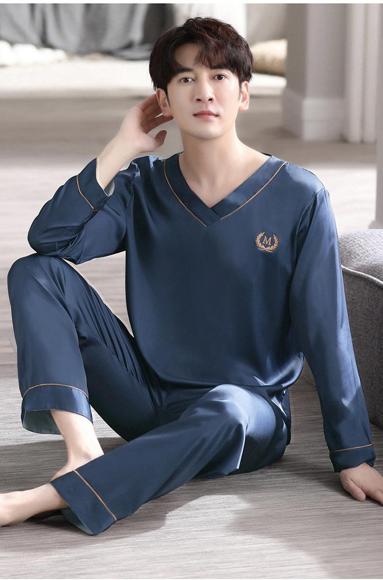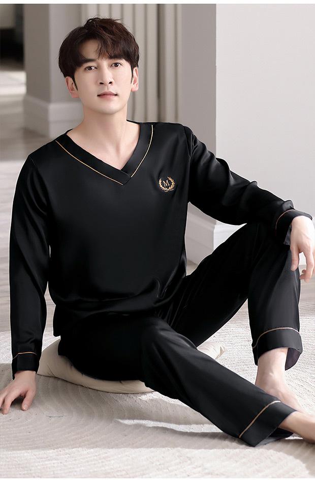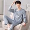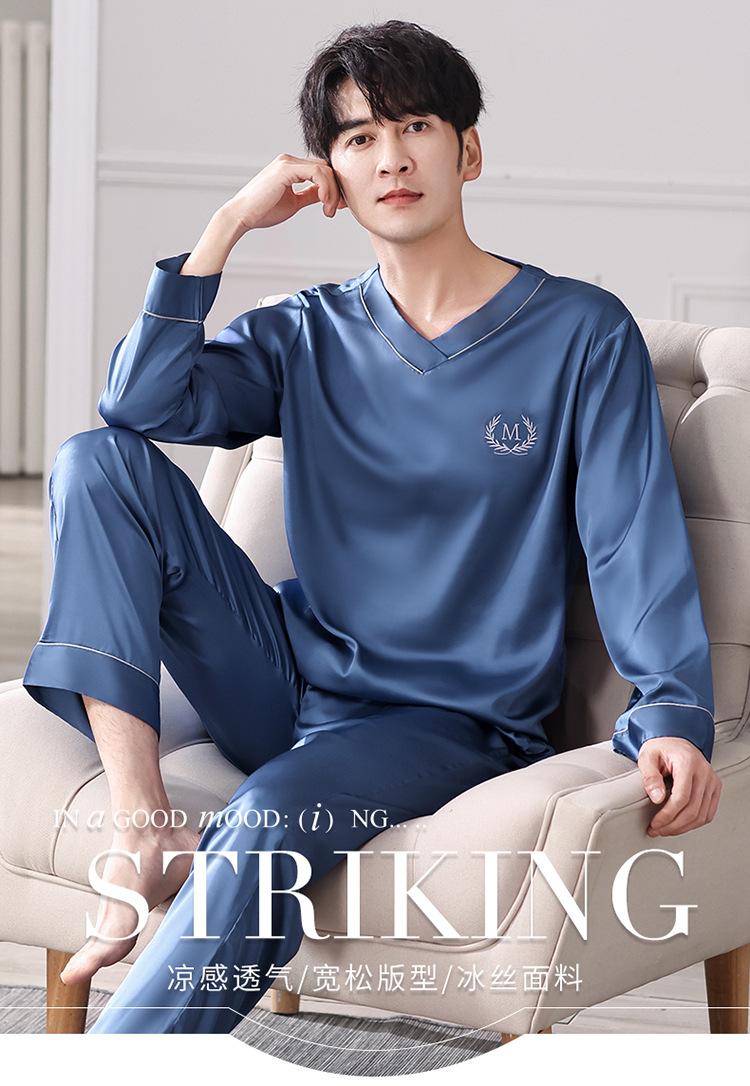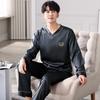 Pijama de Seda de Hielo de Verano de Alta Gama para Hombre de Manga Larga Fino Sencillo Talla Grande Suelto Simulación Seda Traje Ropa de Casa