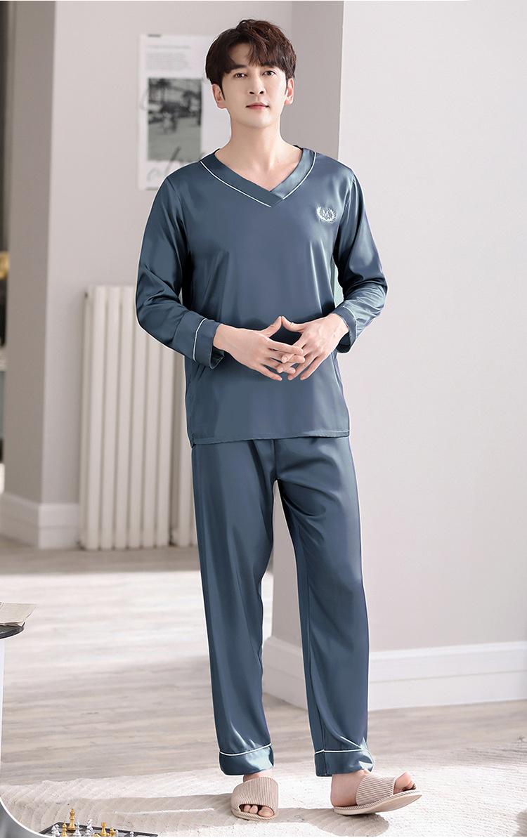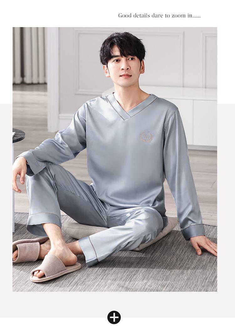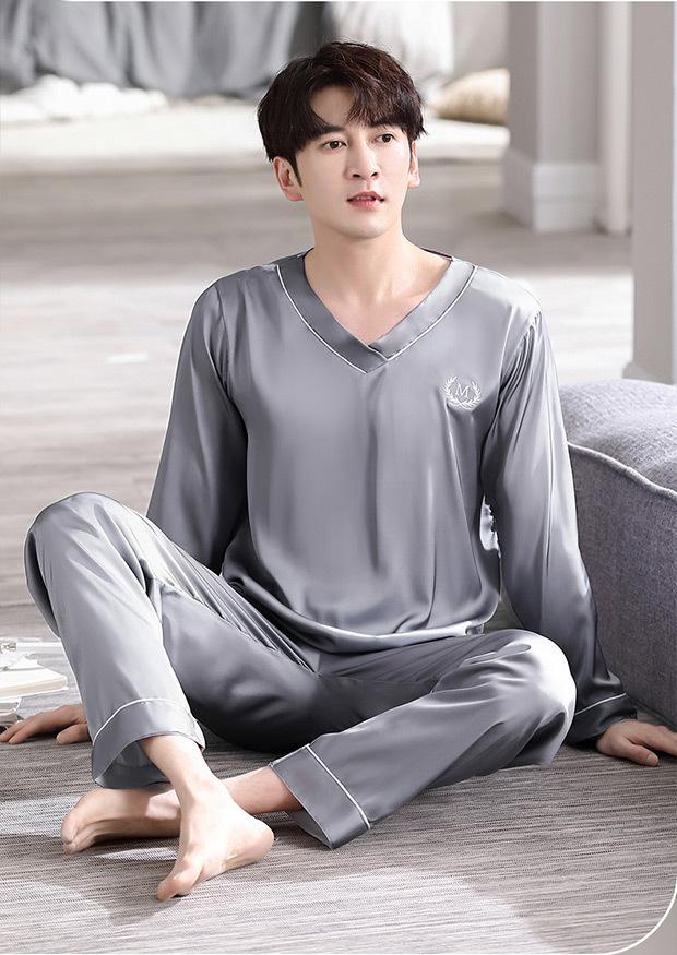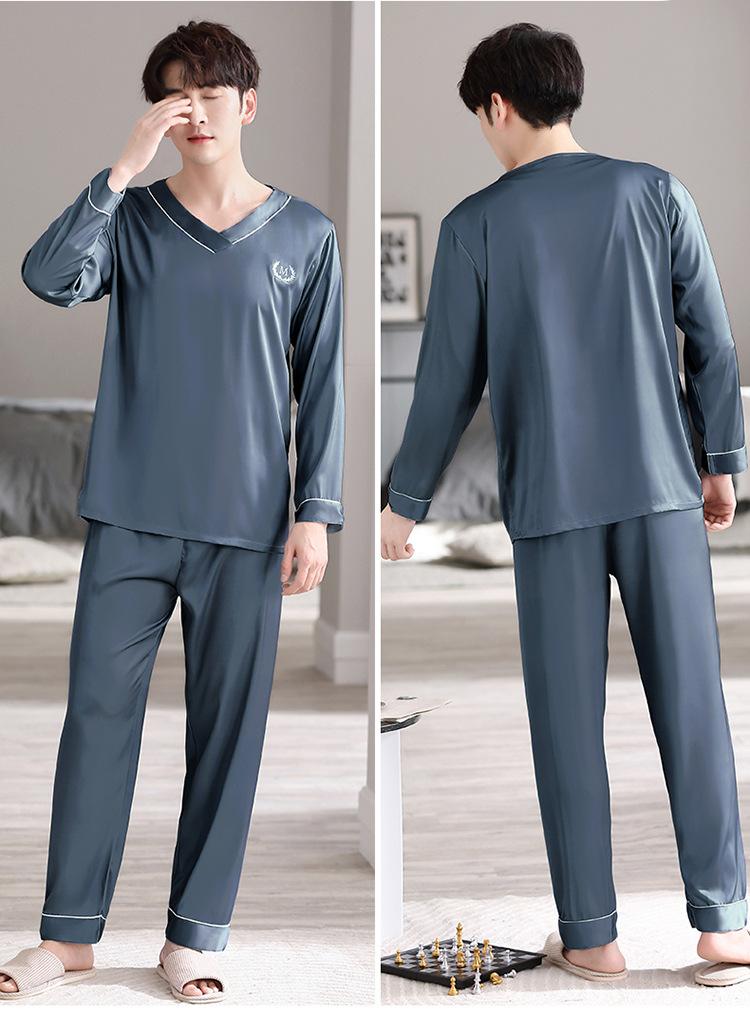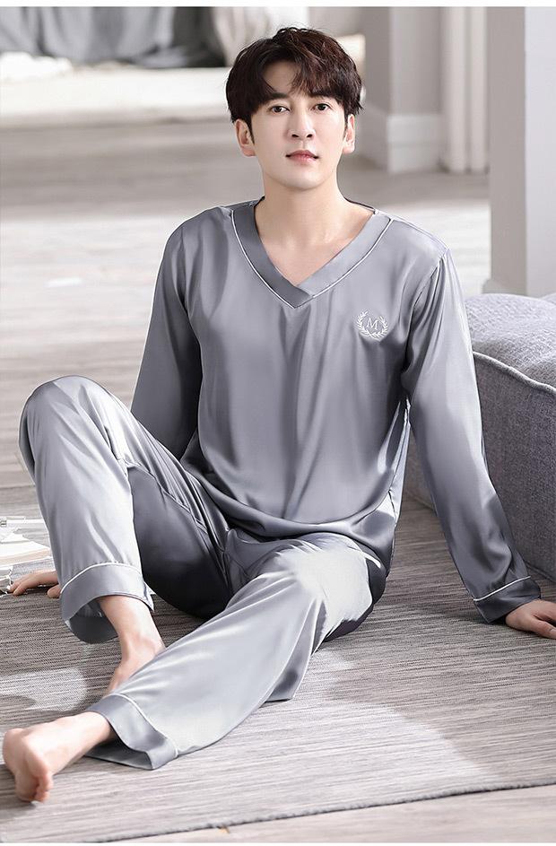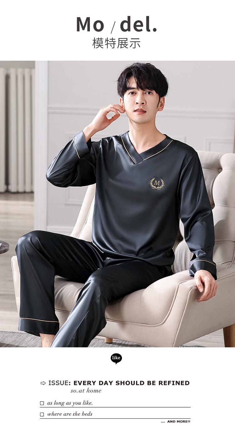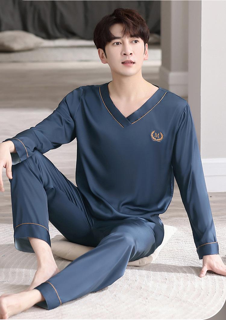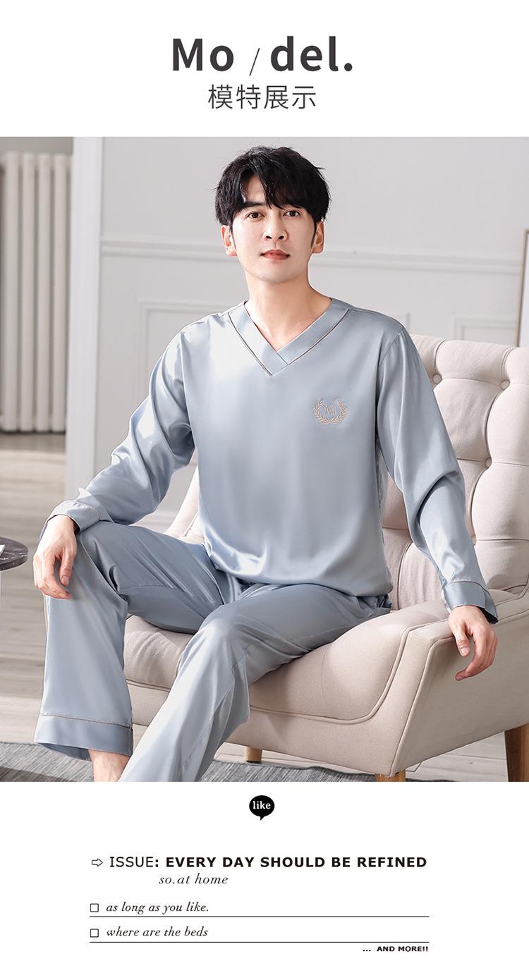 Pijama de Seda de Hielo de Verano de Alta Gama para Hombre de Manga Larga Fino Sencillo Talla Grande Suelto Simulación Seda Traje Ropa de Casa