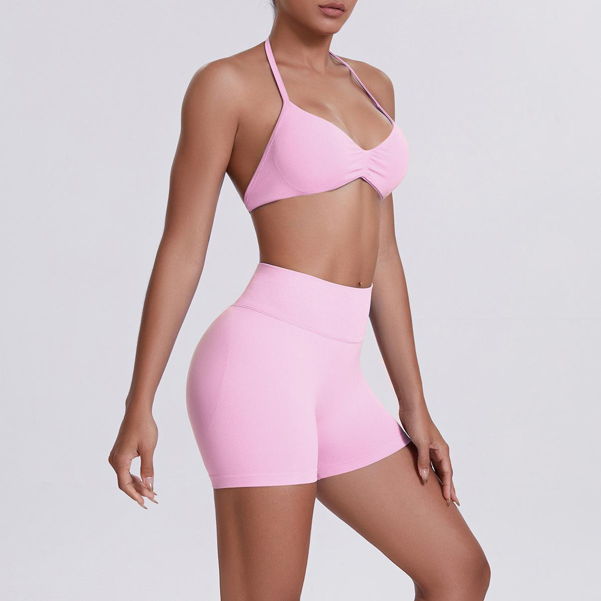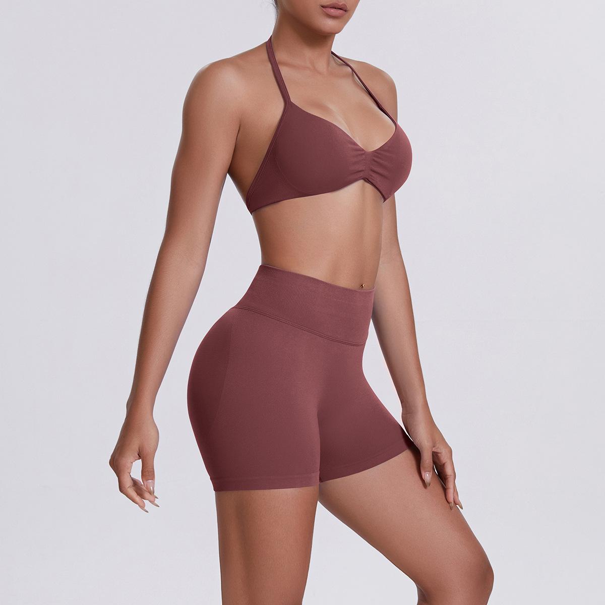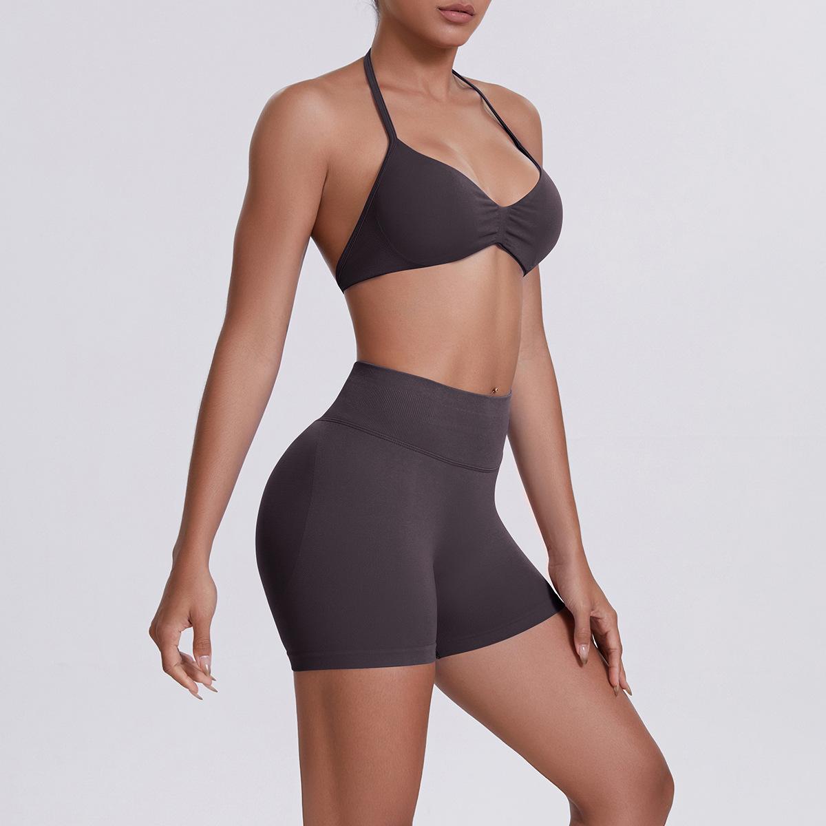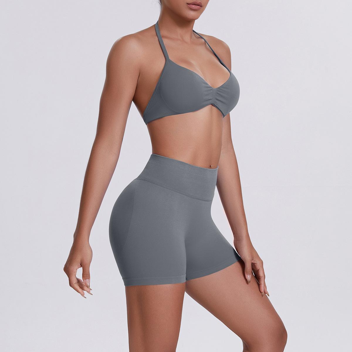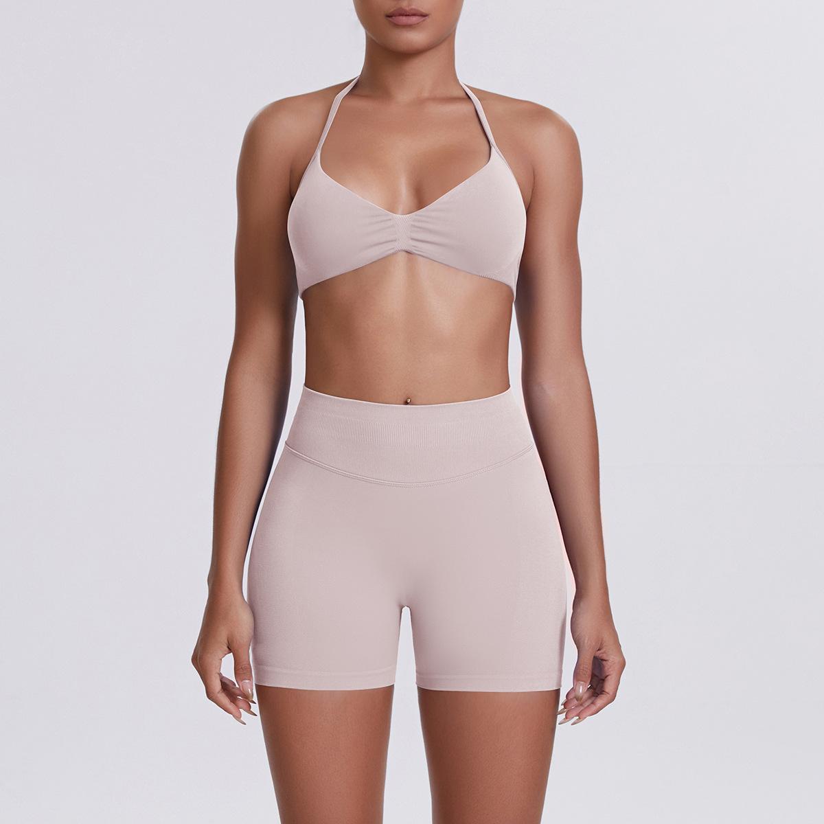 Compra Conjunto de dos piezas deportivo ajustado para correr y fitness, de color sólido sin costuras transfronterizo, con hermoso sujetador halter de espalda y shorts. al por mayor en Joom.pro