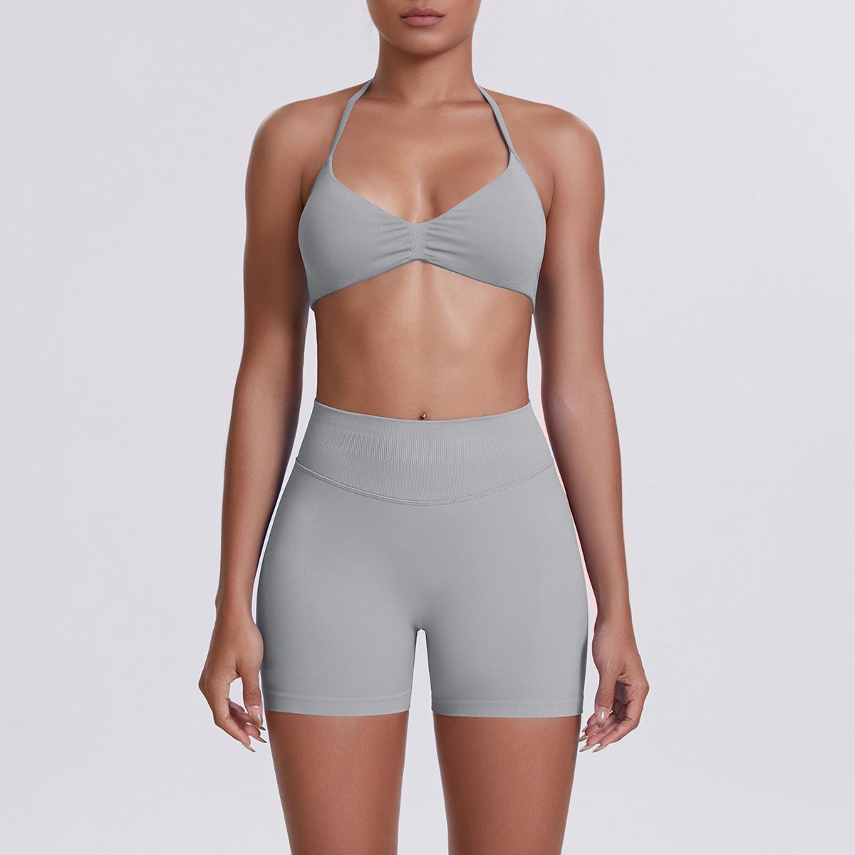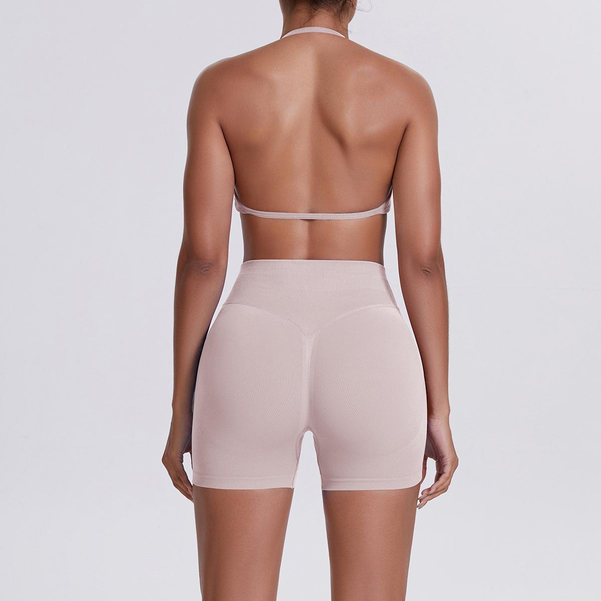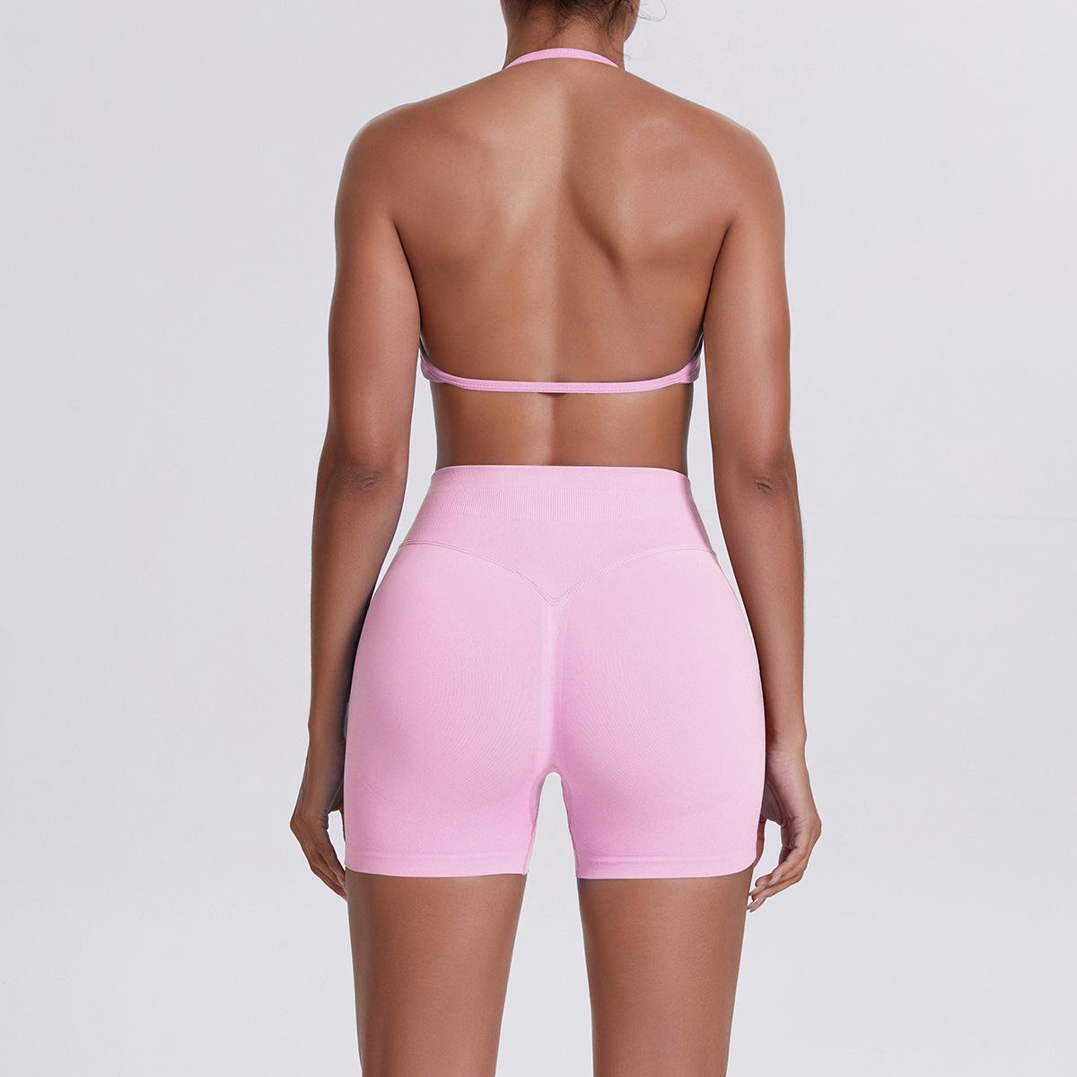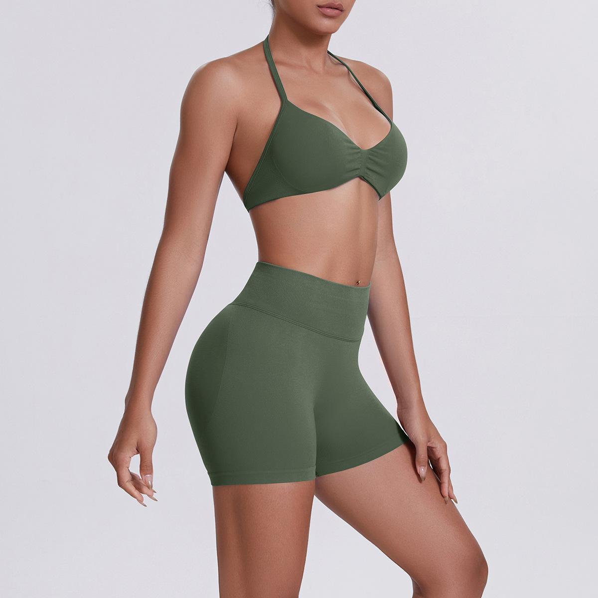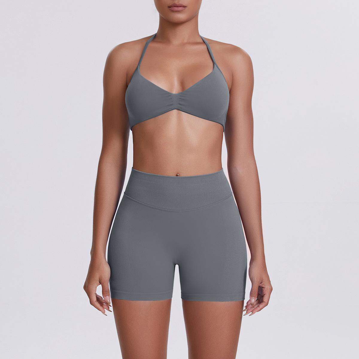Compra Conjunto de dos piezas deportivo ajustado para correr y fitness, de color sólido sin costuras transfronterizo, con hermoso sujetador halter de espalda y shorts. al por mayor en Joom.pro