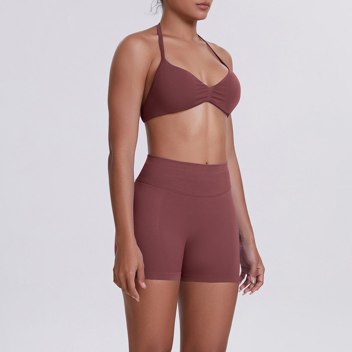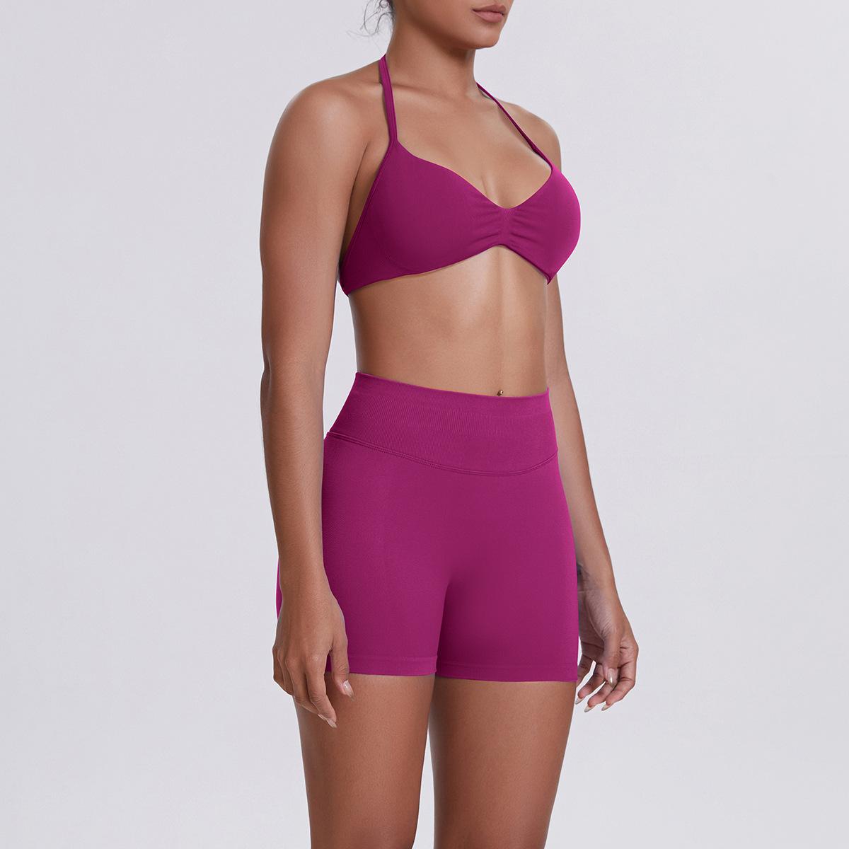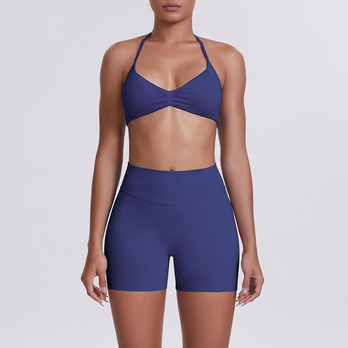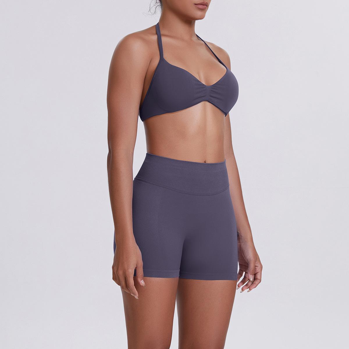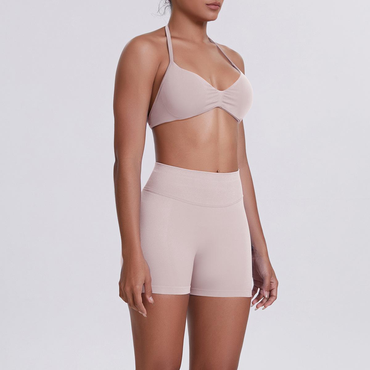 Compra Conjunto de dos piezas deportivo ajustado para correr y fitness, de color sólido sin costuras transfronterizo, con hermoso sujetador halter de espalda y shorts. al por mayor en Joom.pro
