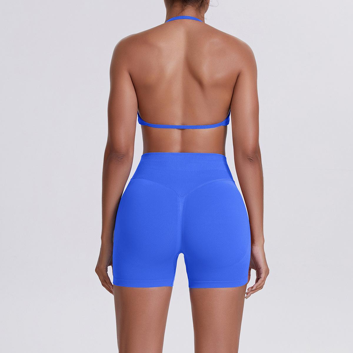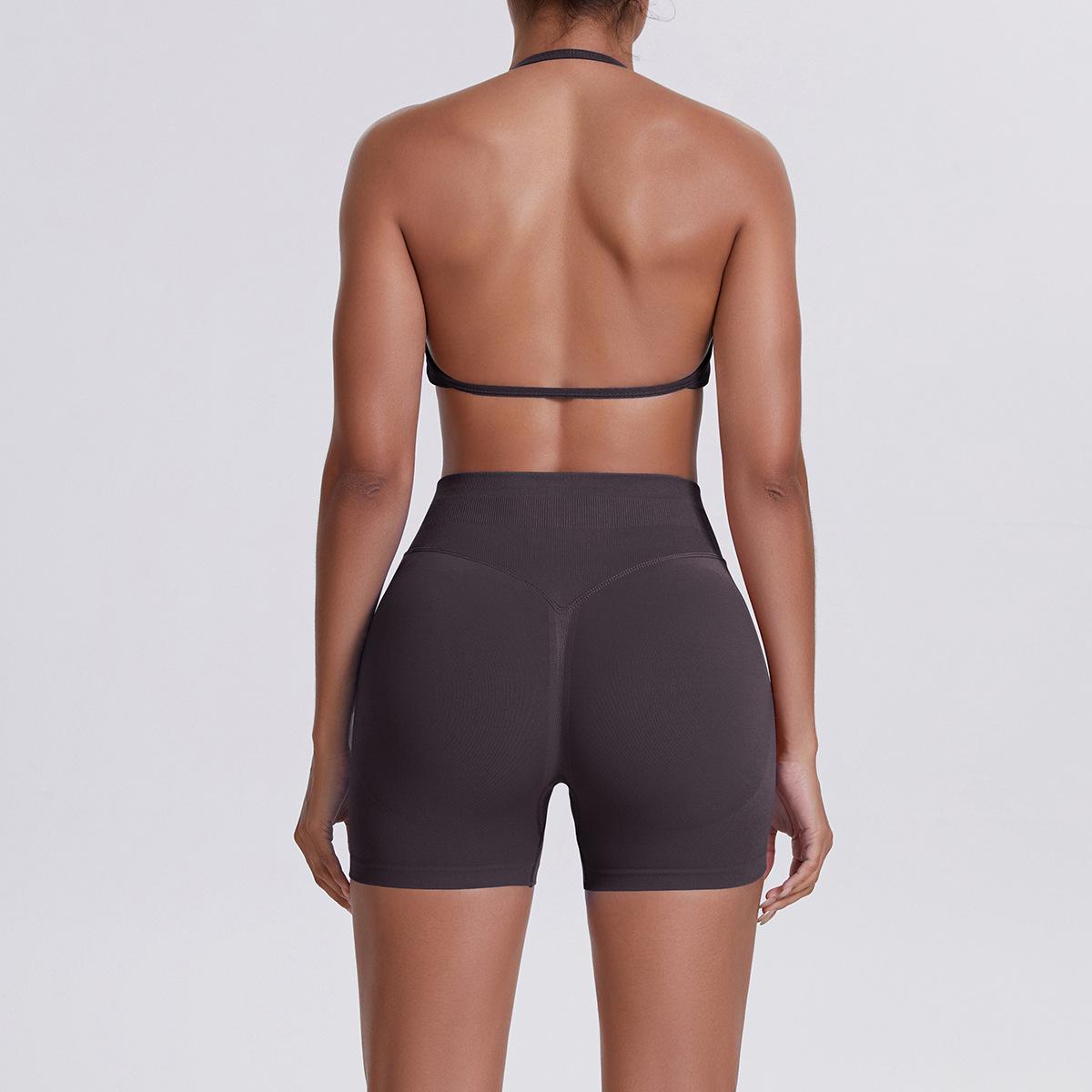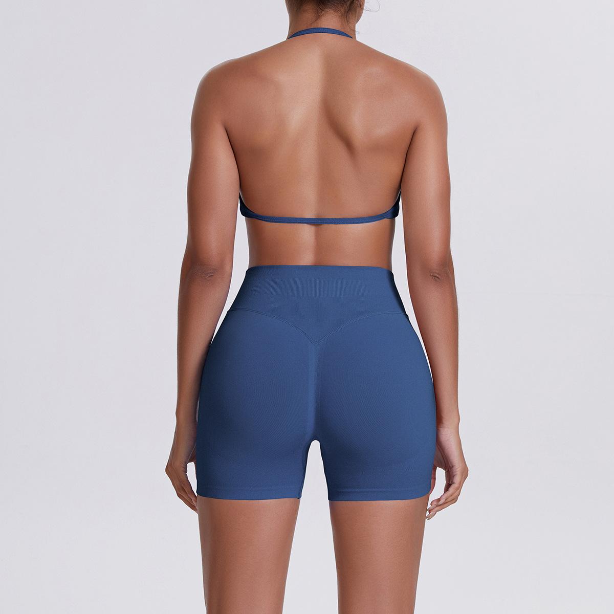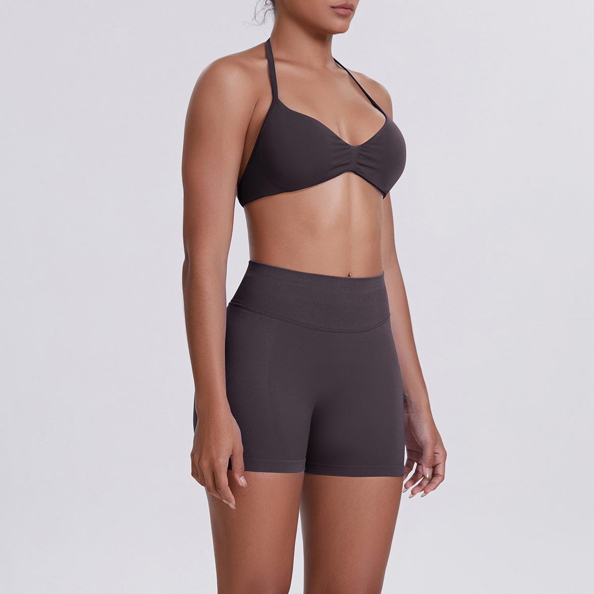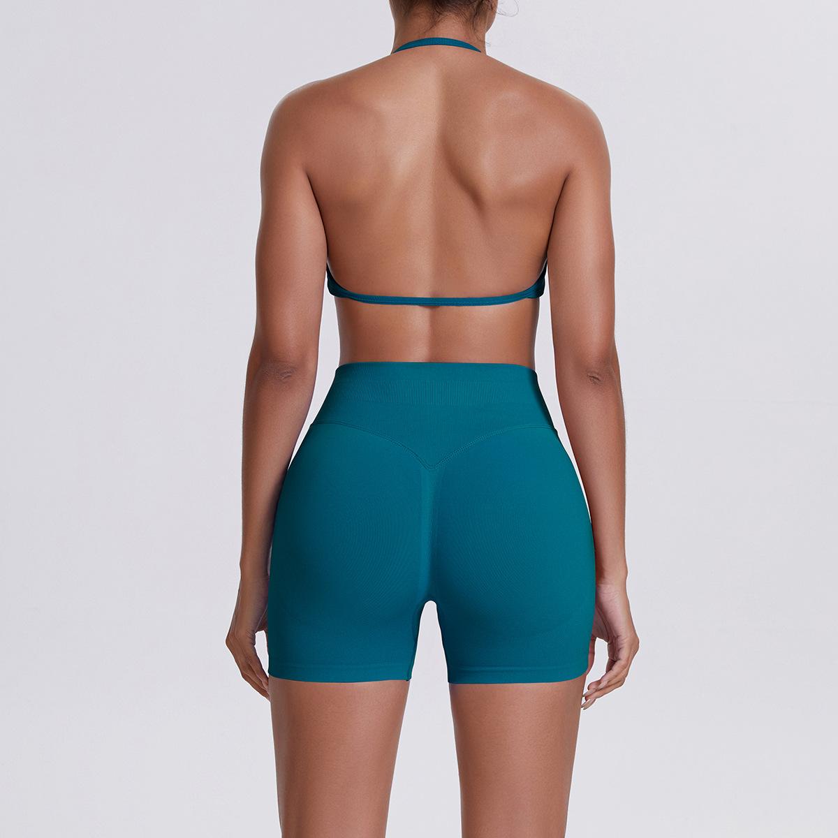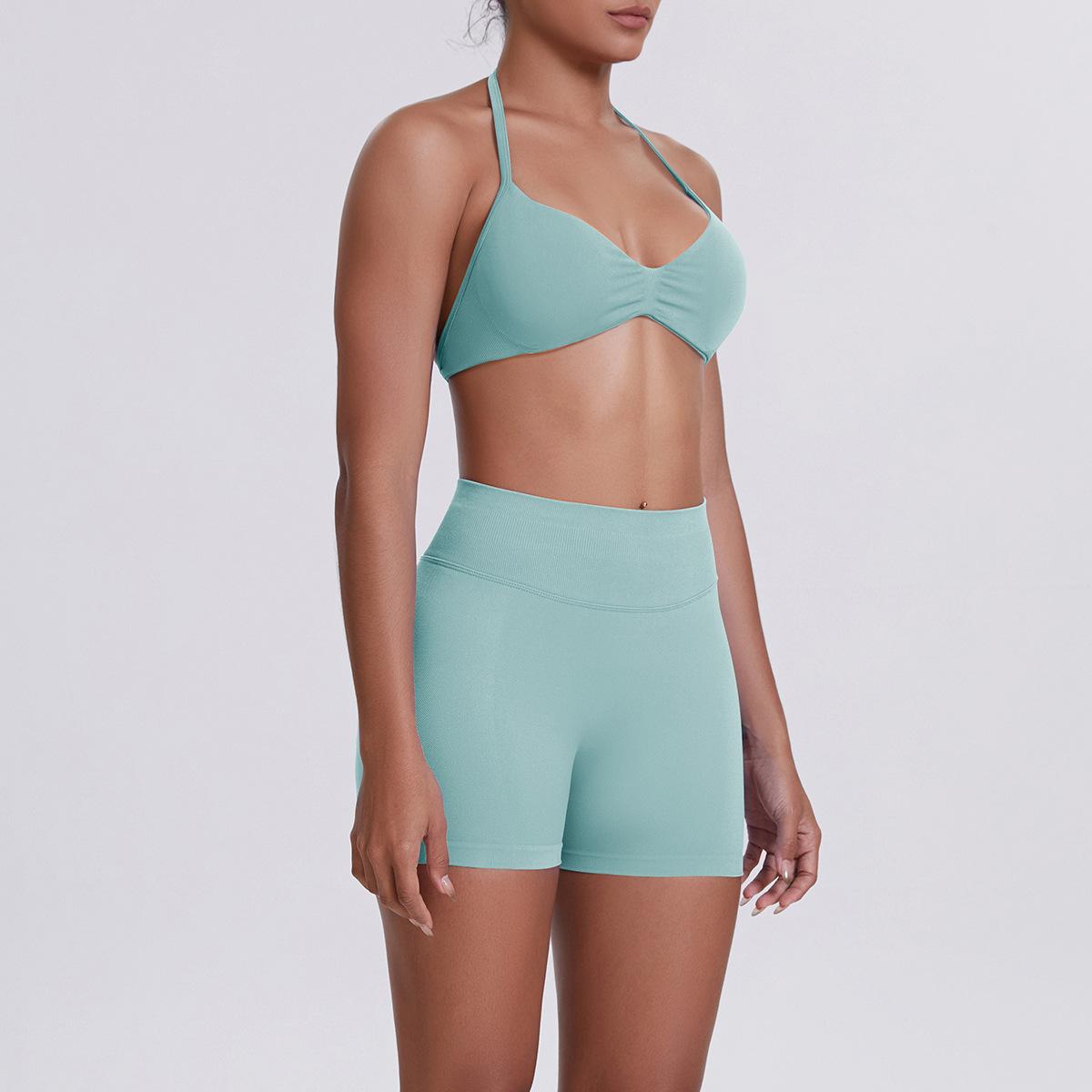 Compra Conjunto de dos piezas deportivo ajustado para correr y fitness, de color sólido sin costuras transfronterizo, con hermoso sujetador halter de espalda y shorts. al por mayor en Joom.pro