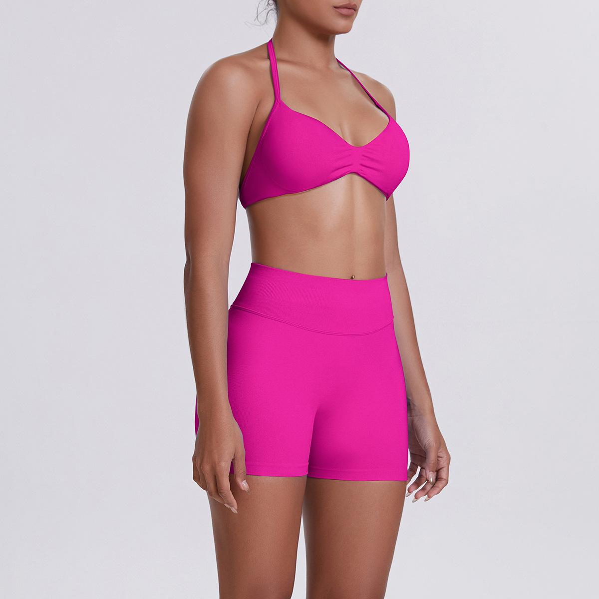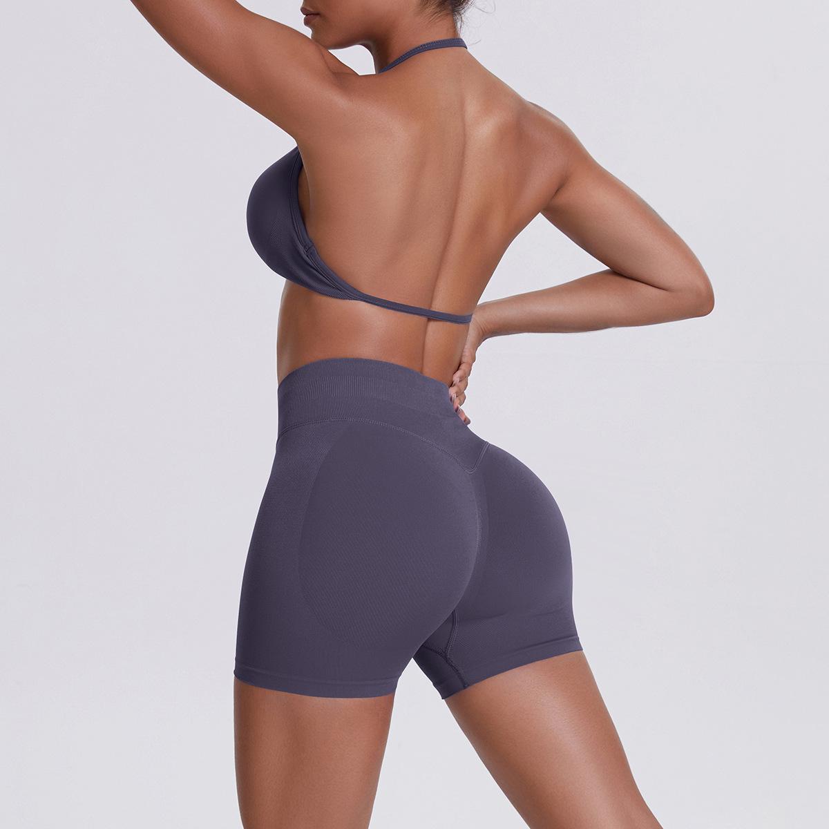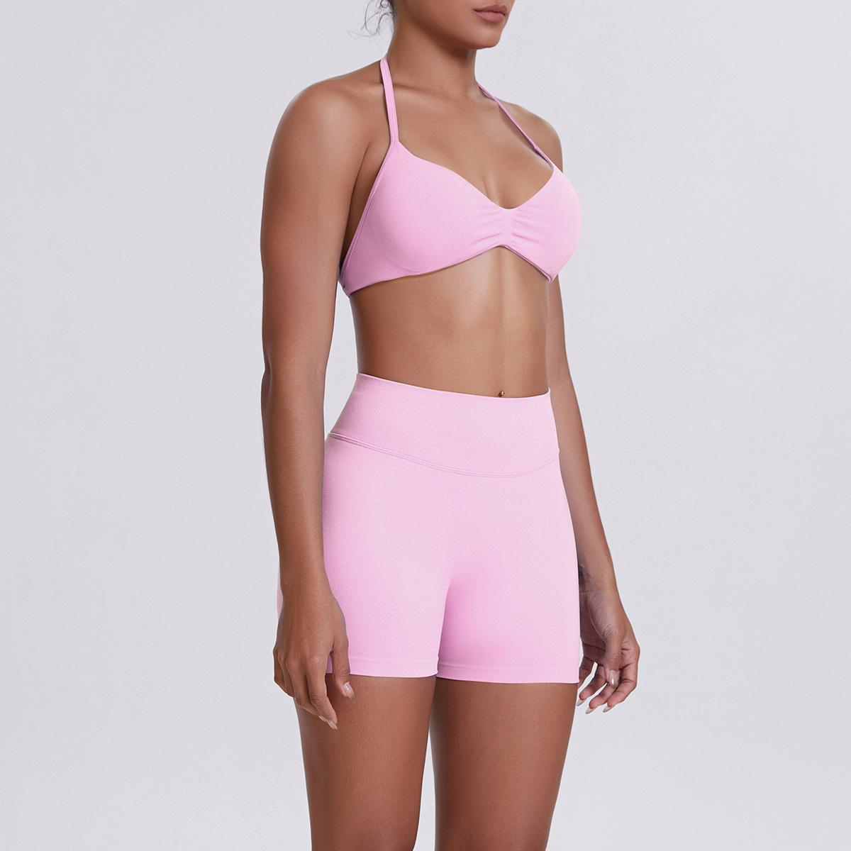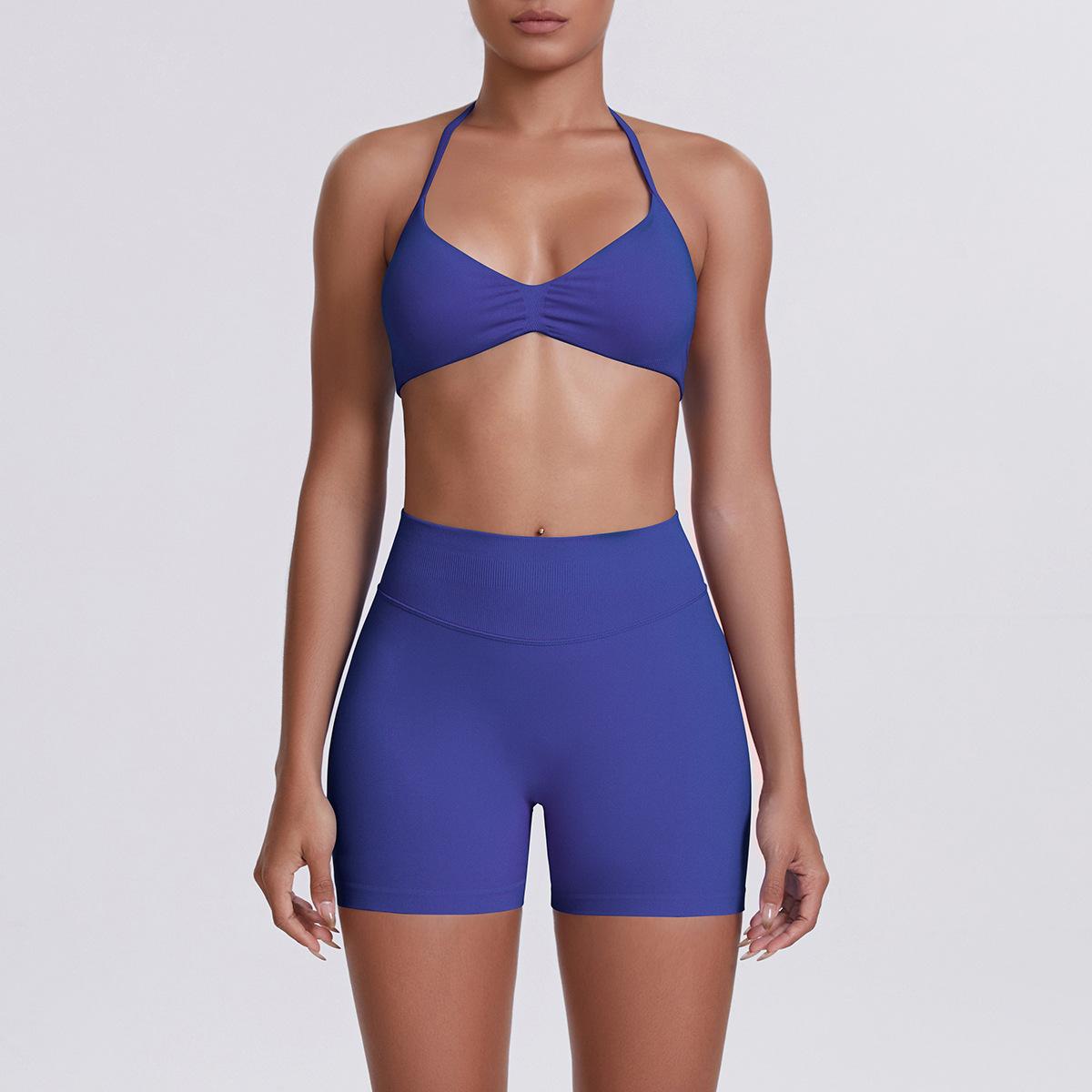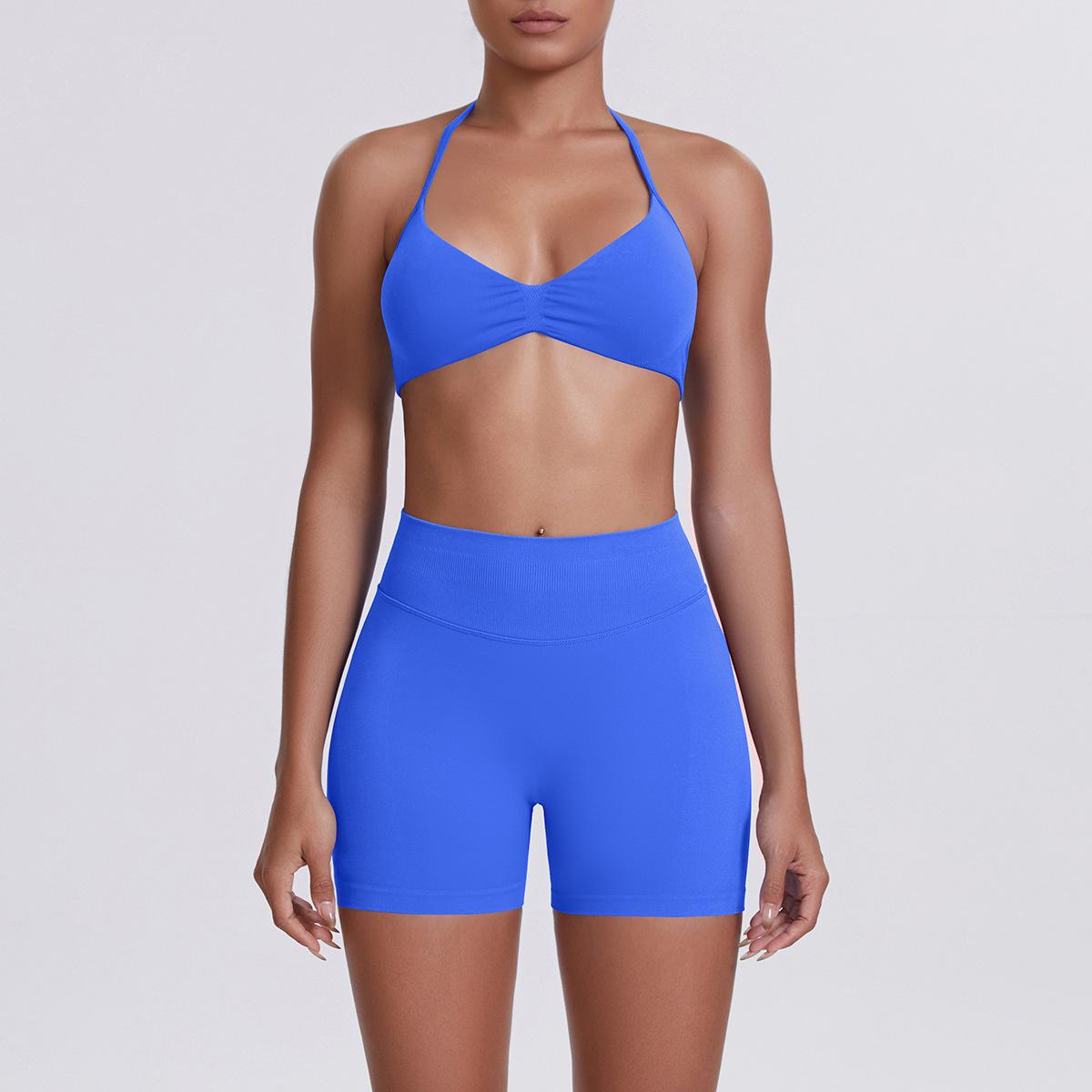 Compra Conjunto de dos piezas deportivo ajustado para correr y fitness, de color sólido sin costuras transfronterizo, con hermoso sujetador halter de espalda y shorts. al por mayor en Joom.pro