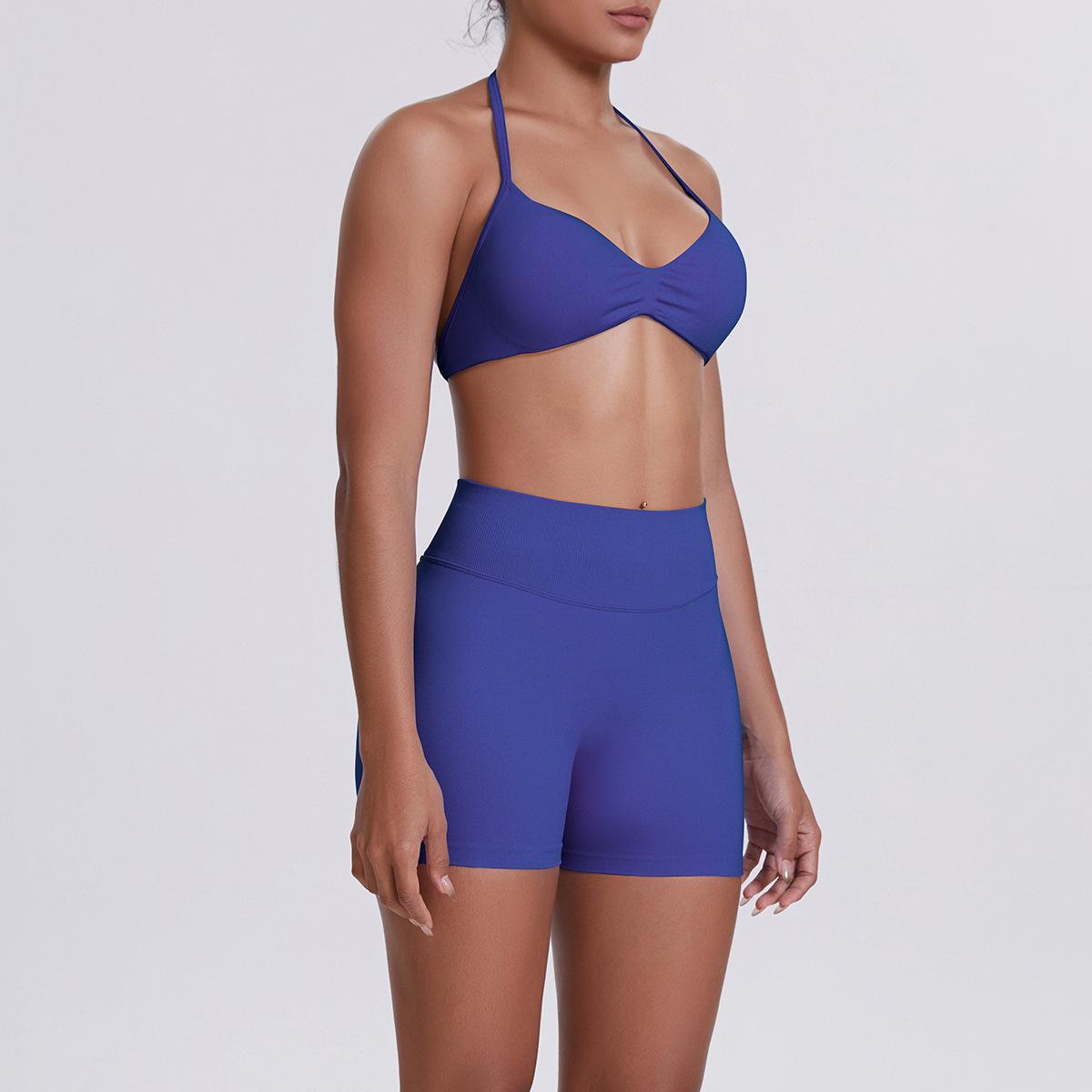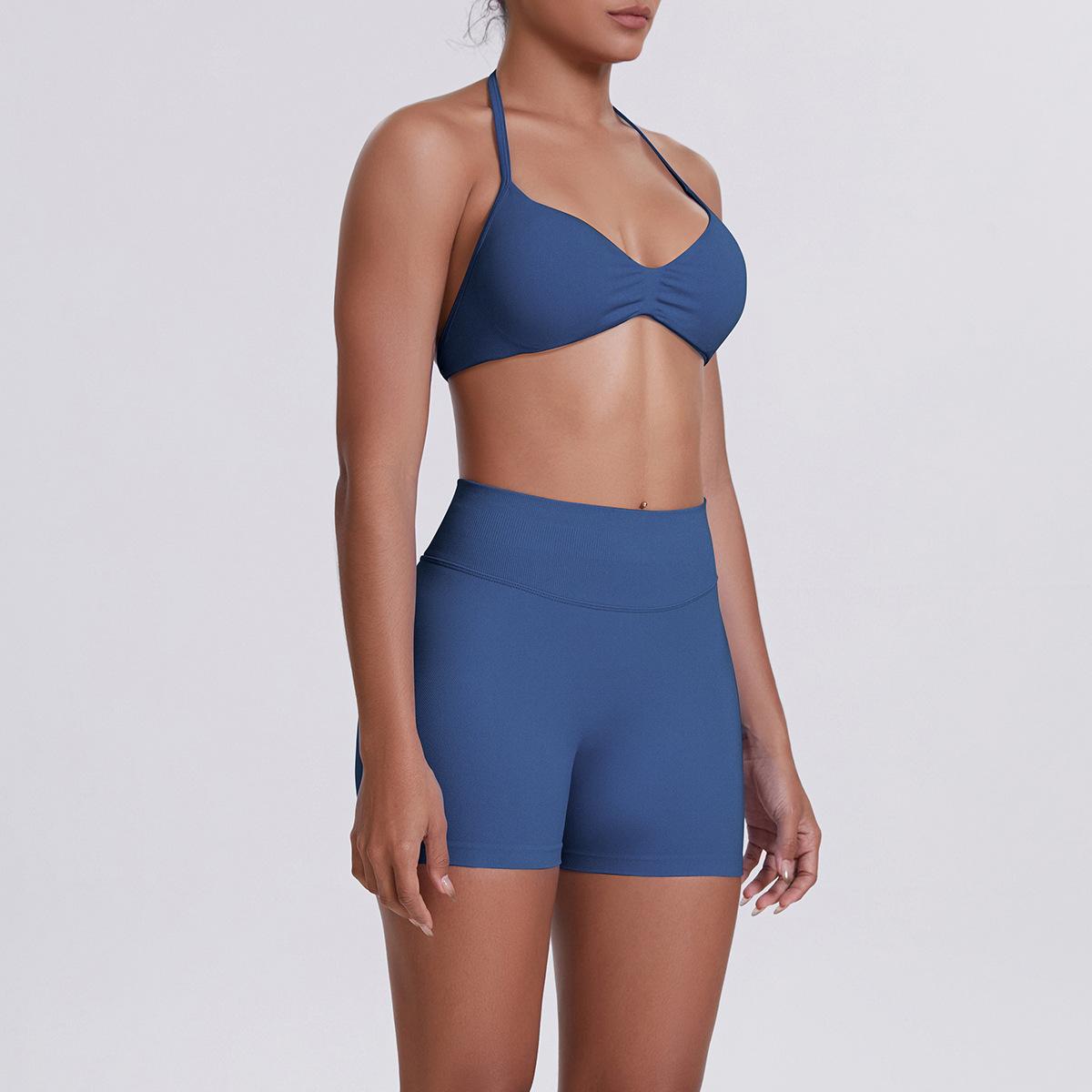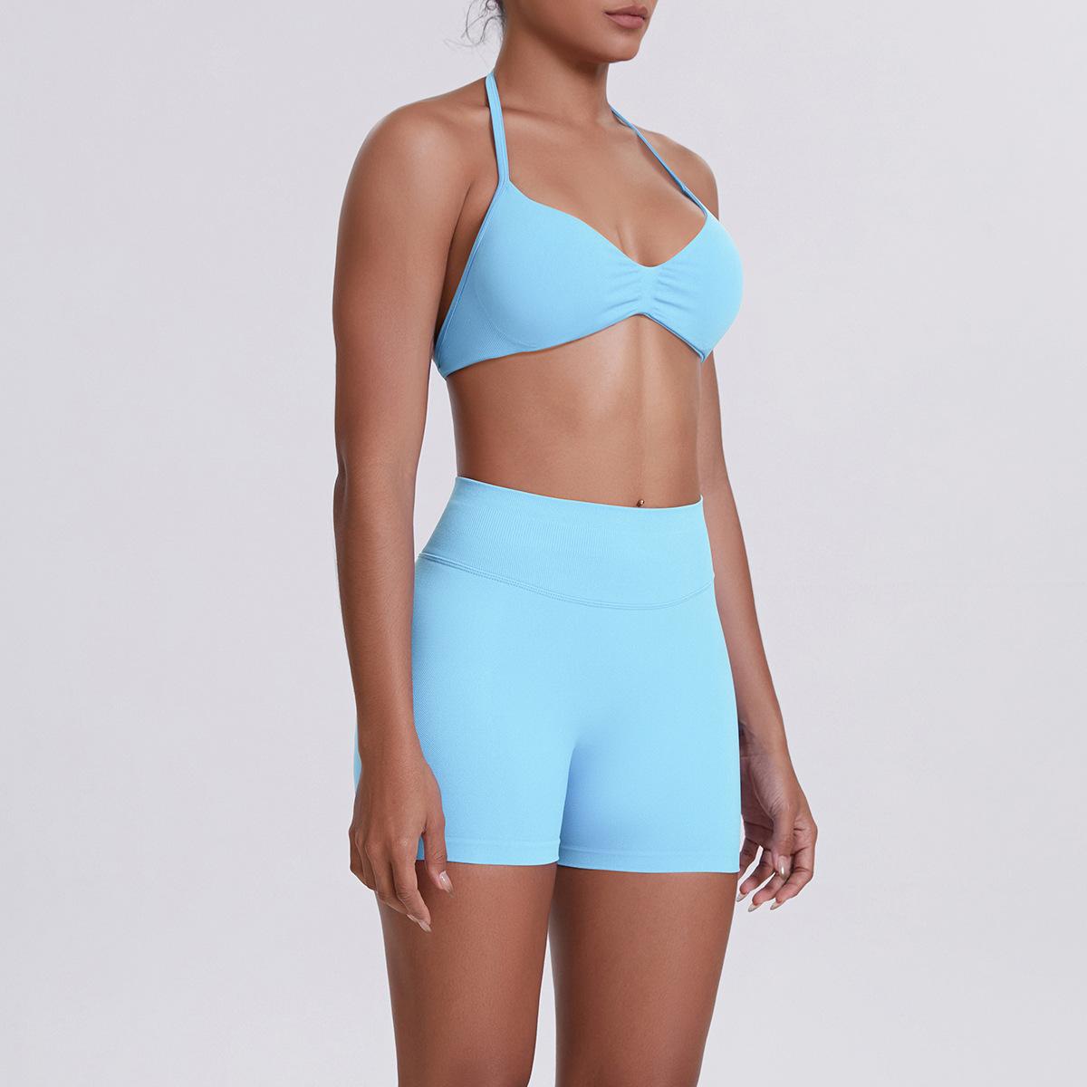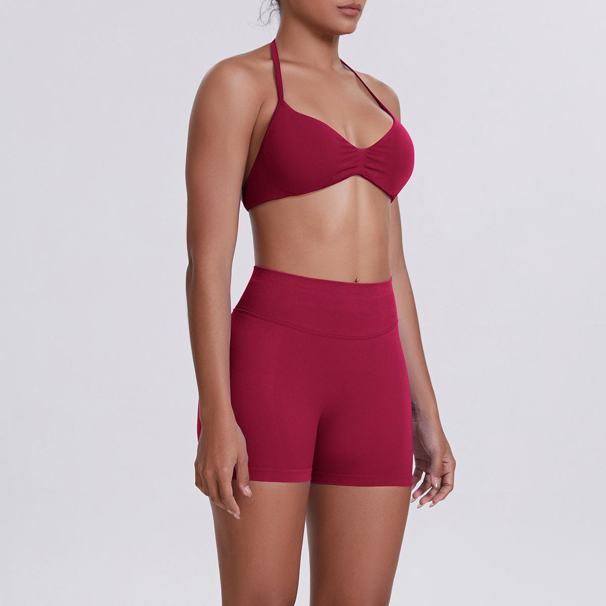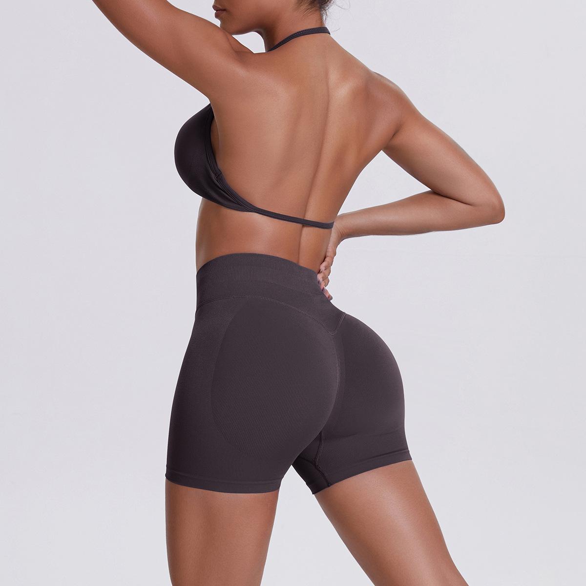 Compra Conjunto de dos piezas deportivo ajustado para correr y fitness, de color sólido sin costuras transfronterizo, con hermoso sujetador halter de espalda y shorts. al por mayor en Joom.pro