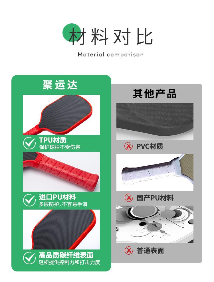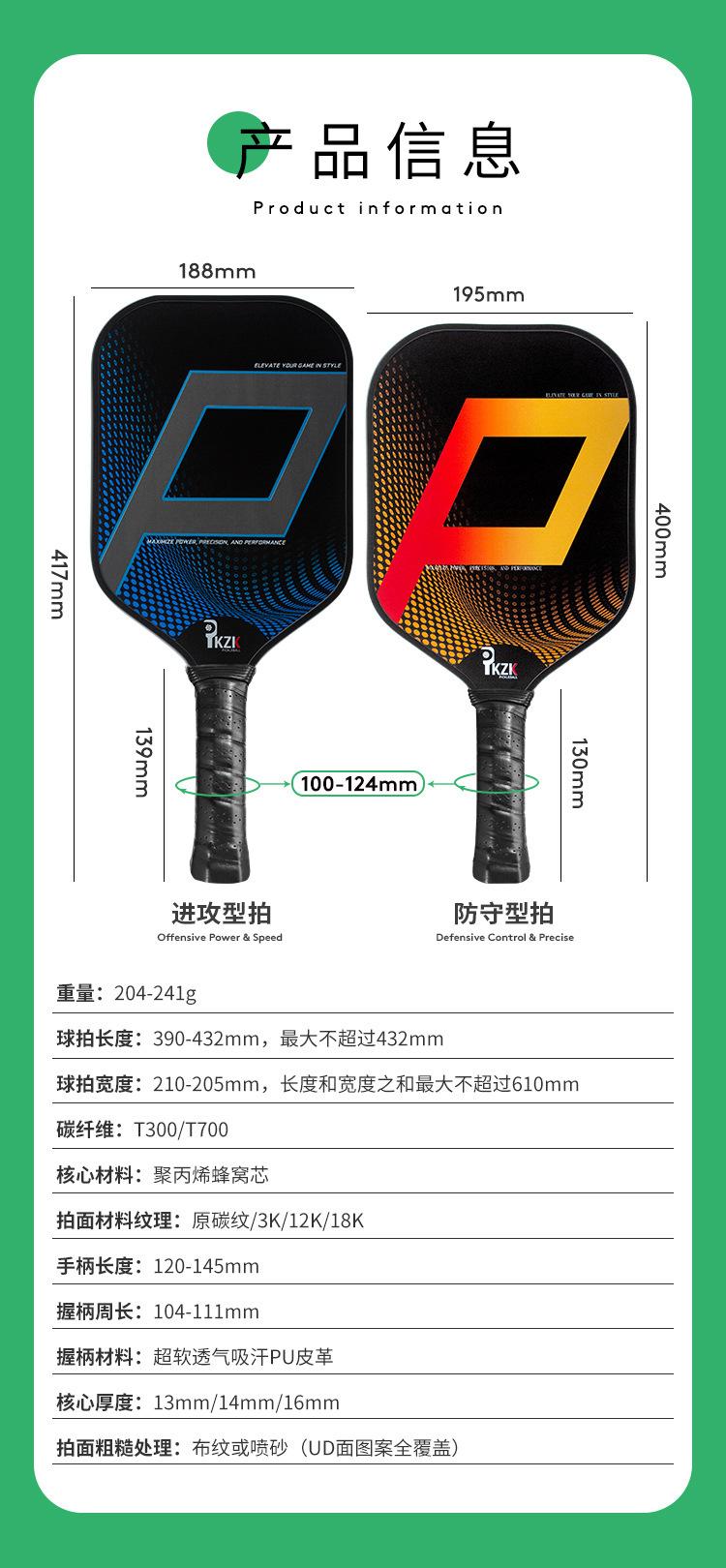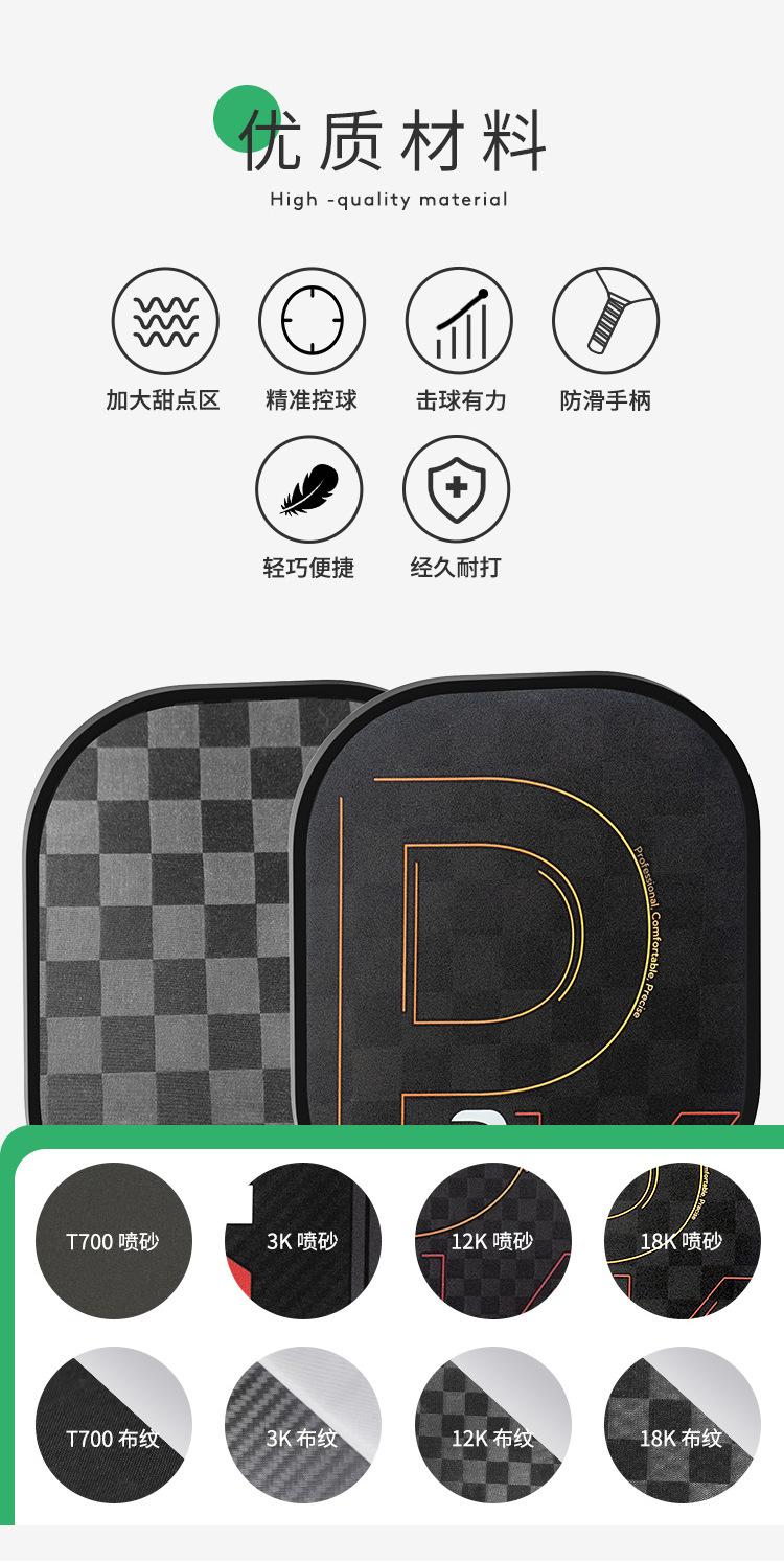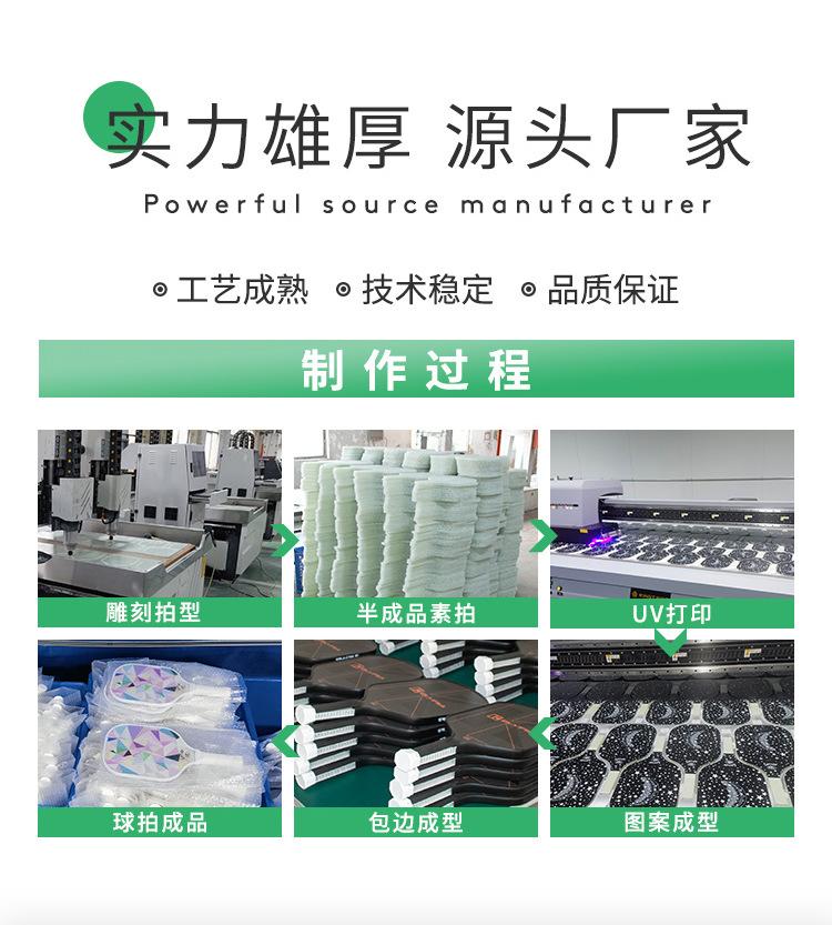 Materiales de alta calidad:Nuestra fábrica se especializa en raquetas de pickleball. Seleccionamos materiales de alta calidad y controlamos estrictamente la calidad. Nuestro equipo profesional creará una raqueta única para usted, permitiéndole mostrar su estilo en la cancha. ¡Venga y personalice su excelente equipo!
