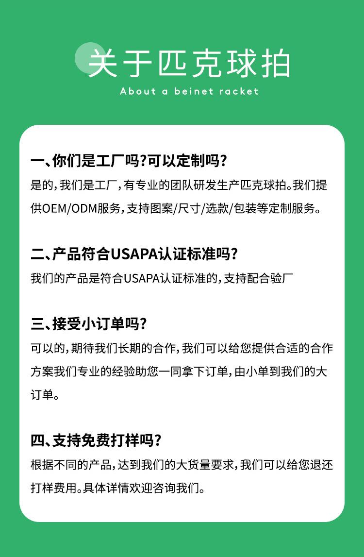 I+D e Innovación:La fábrica tiene una fuerte capacidad de producción y fuerza de I+D. Trabajamos con entrenadores profesionales de pickleball para desarrollar y crear raquetas de pickleball que son perfectas para diferentes grupos de personas para satisfacer las necesidades de diferentes clientes. Elíjanos y disfrute de los productos de alta calidad que trae una fábrica profesional.