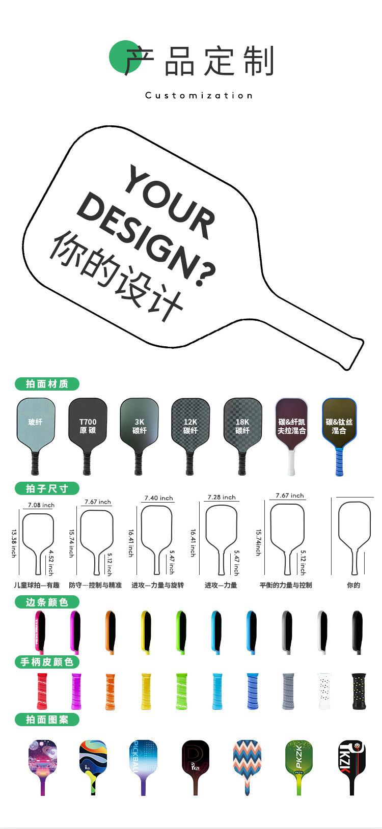 Diseño humanizado:Ofrecemos servicio de paletas de pickleball personalizadas. Desde los materiales hasta los diseños, todo se puede personalizar según tus necesidades. ¡Podemos crear tu propia paleta única y hacerte el centro de atención en la cancha!