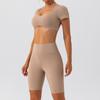 Nuevo conjunto de yoga de alta gama de manga corta y corte ajustado de secado rápido europeo y americano transfronterizo, shorts de yoga deportivos para exteriores