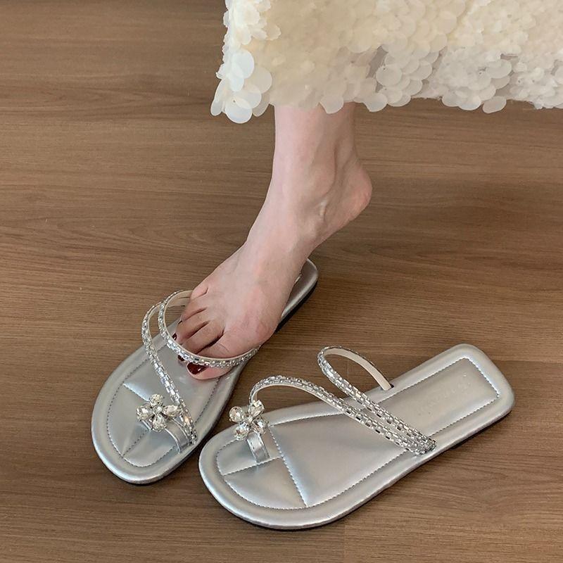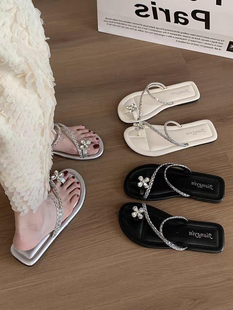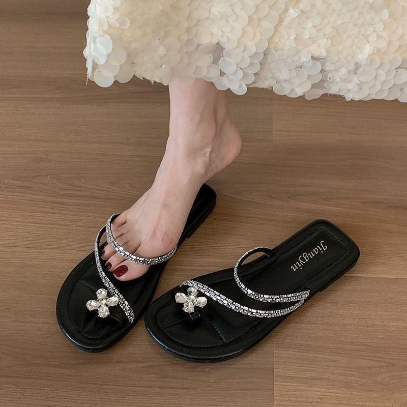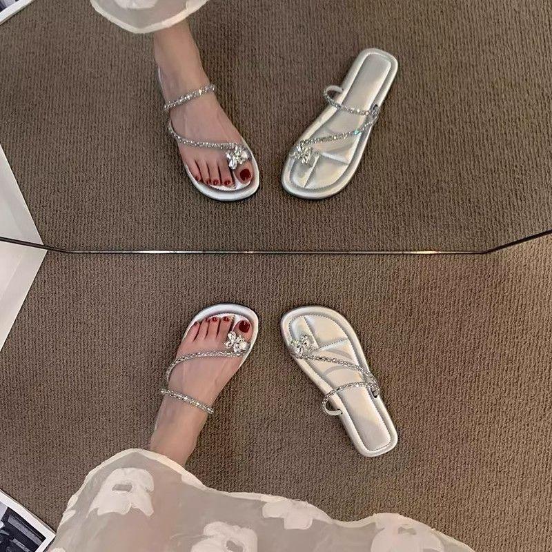 Sandalias Estilo Hada Pedrería Tanga Sandalias de Dedo Verano 2024 Nuevo Fondo Plano Para Salir Chanclas Tanga