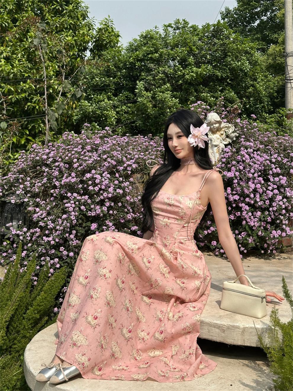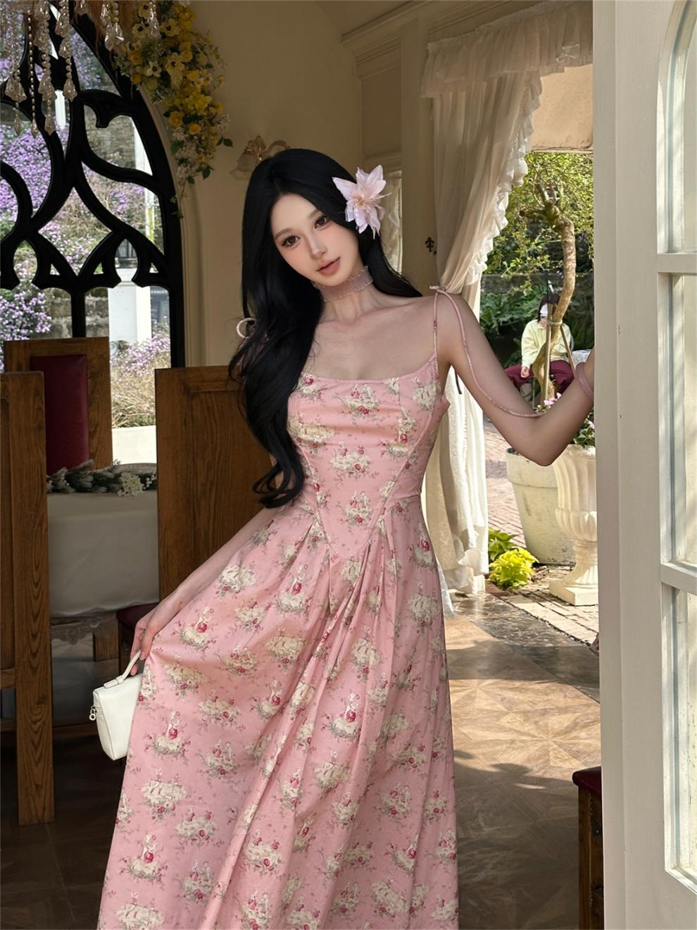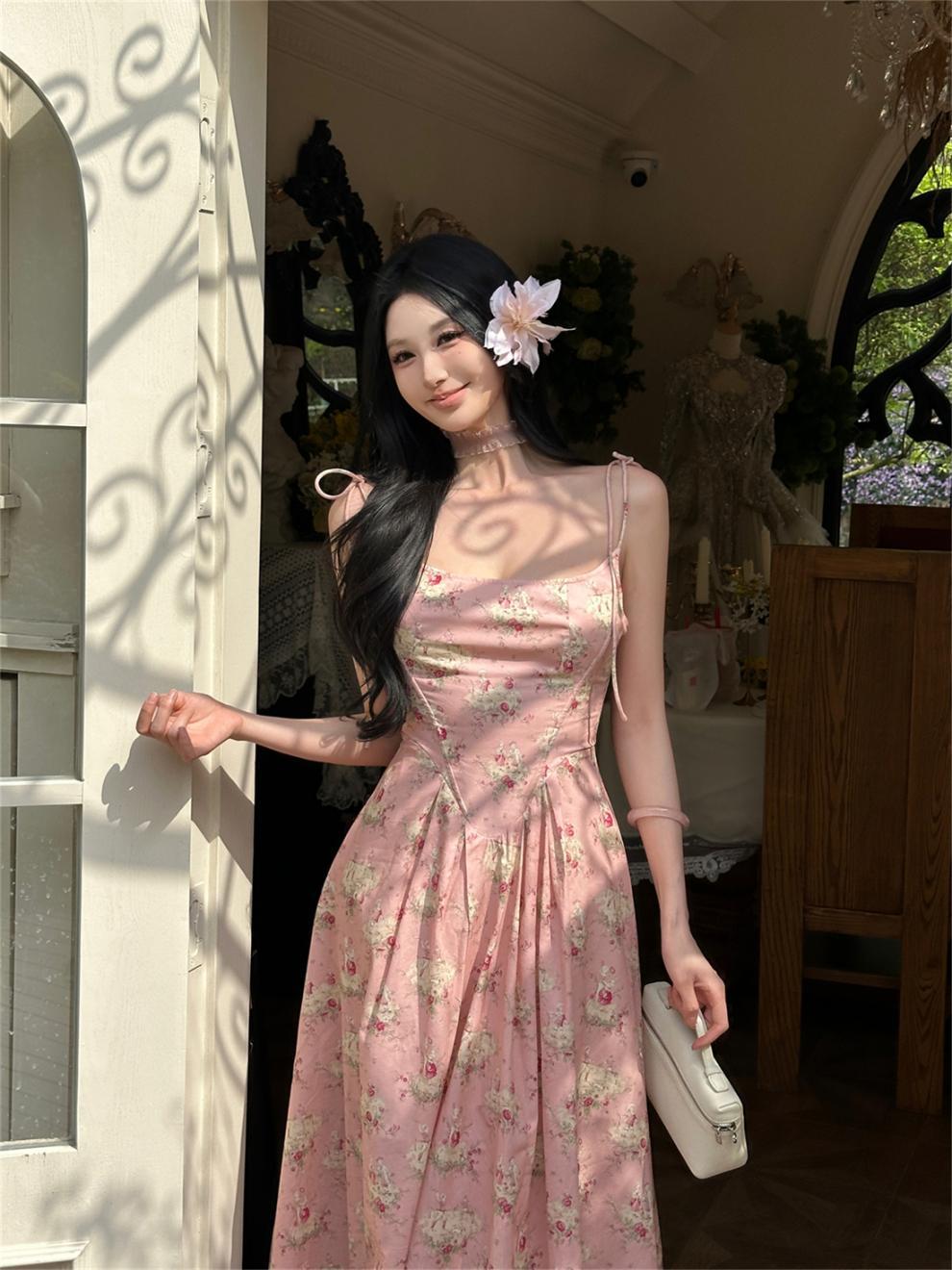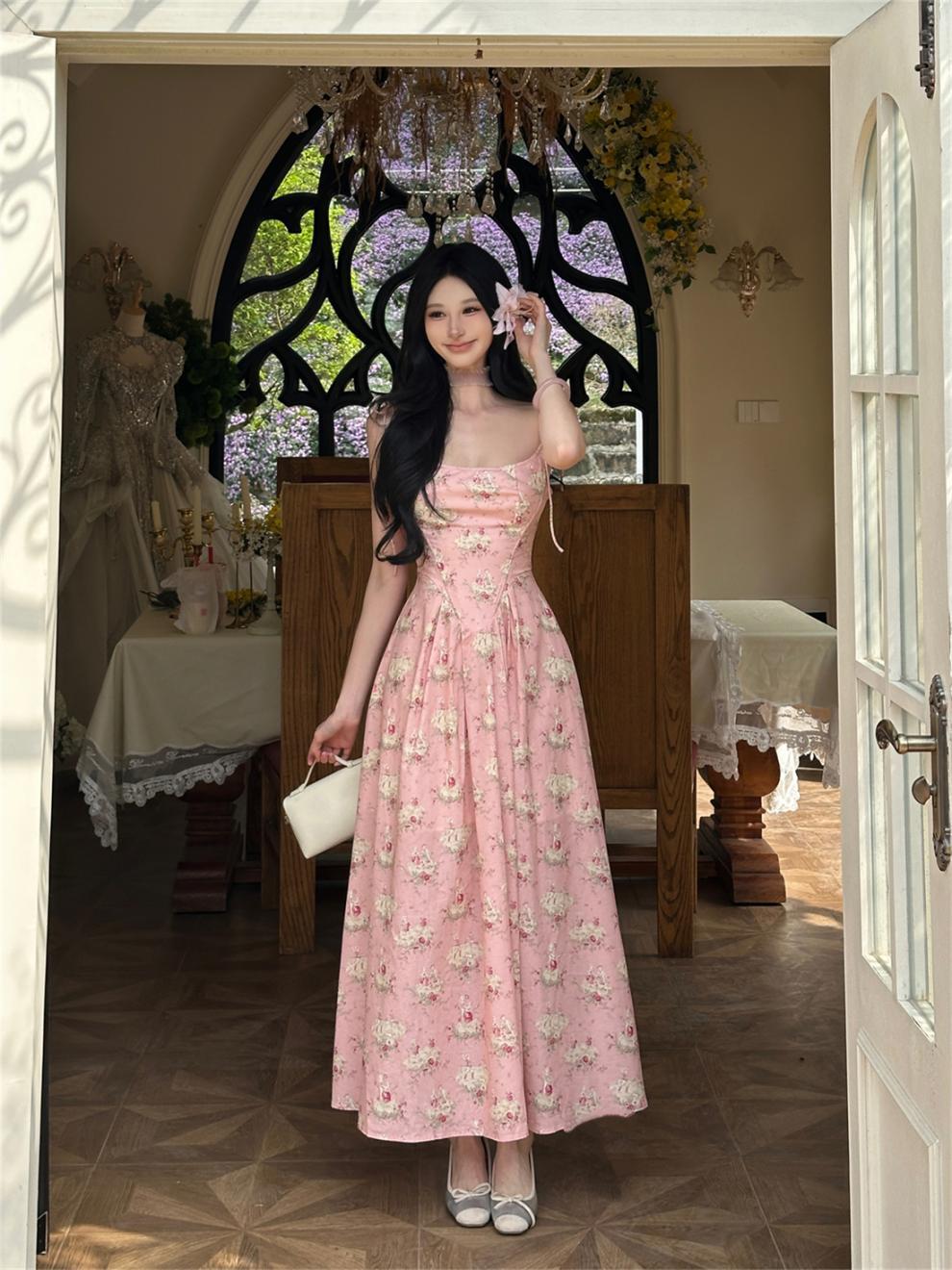 Foto Real de Vestido Rosa Listo para Usar con Tirantes Estampado Francés Espina de Pescado