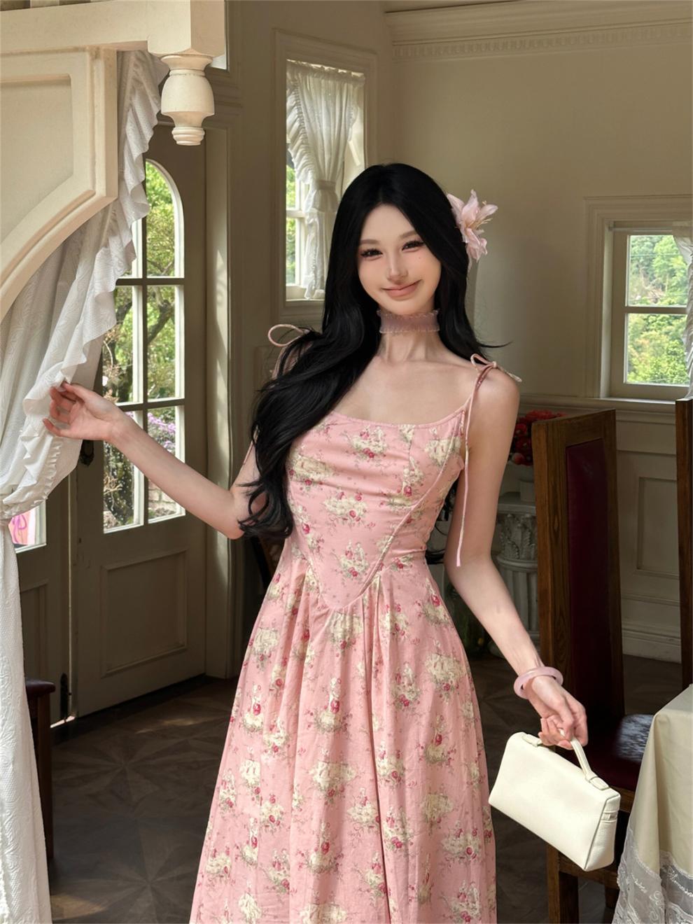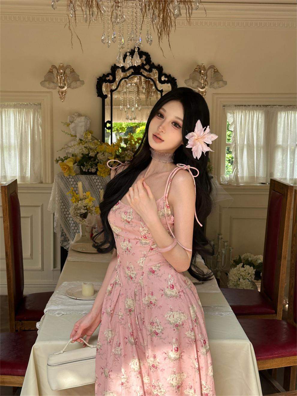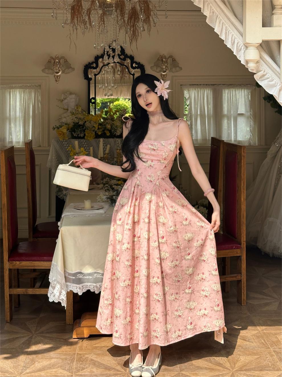 Foto Real de Vestido Rosa Listo para Usar con Tirantes Estampado Francés Espina de Pescado