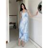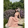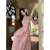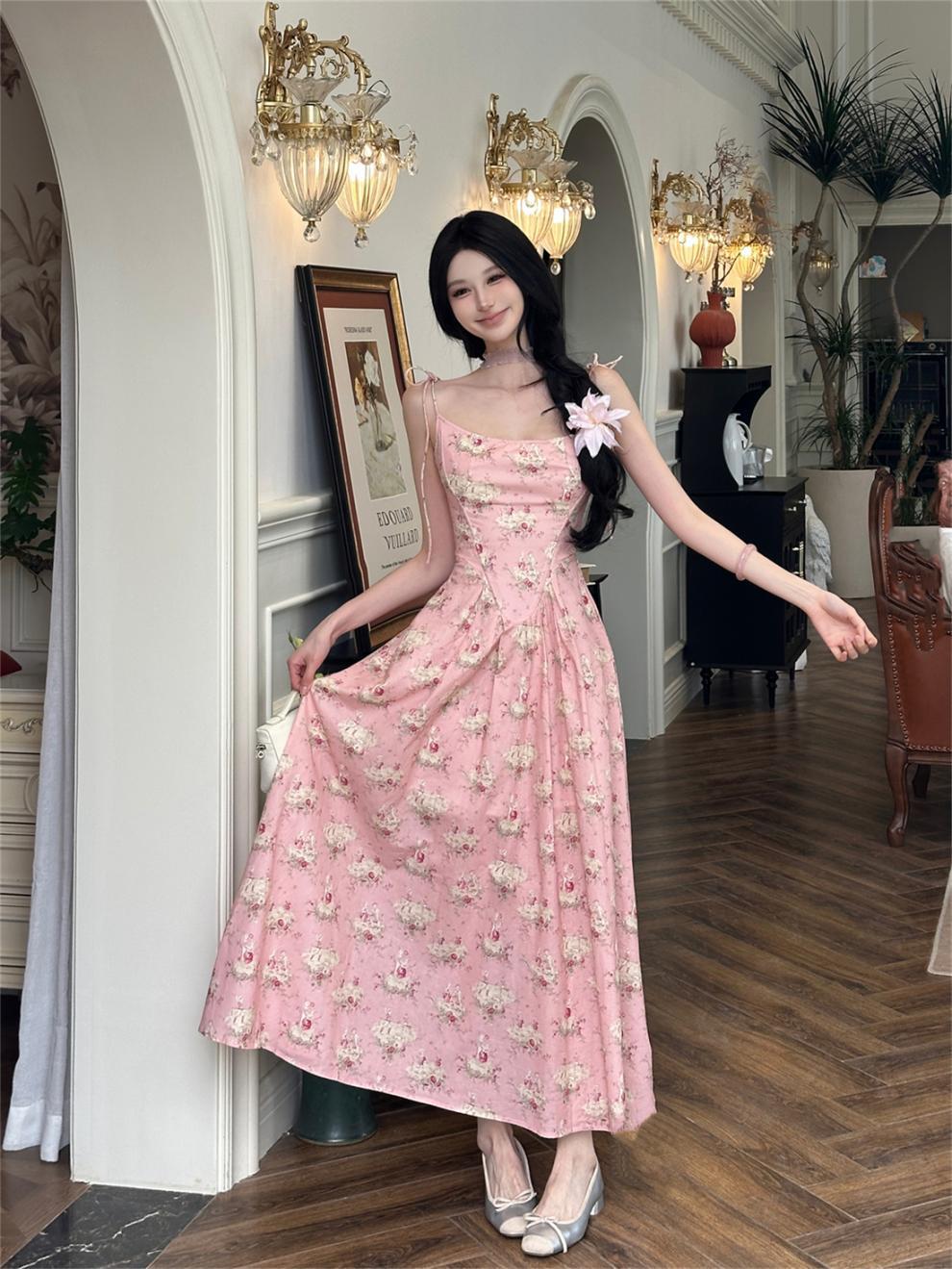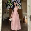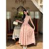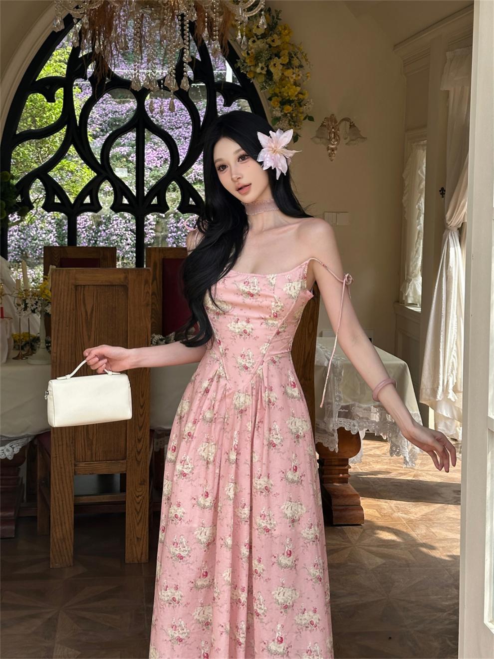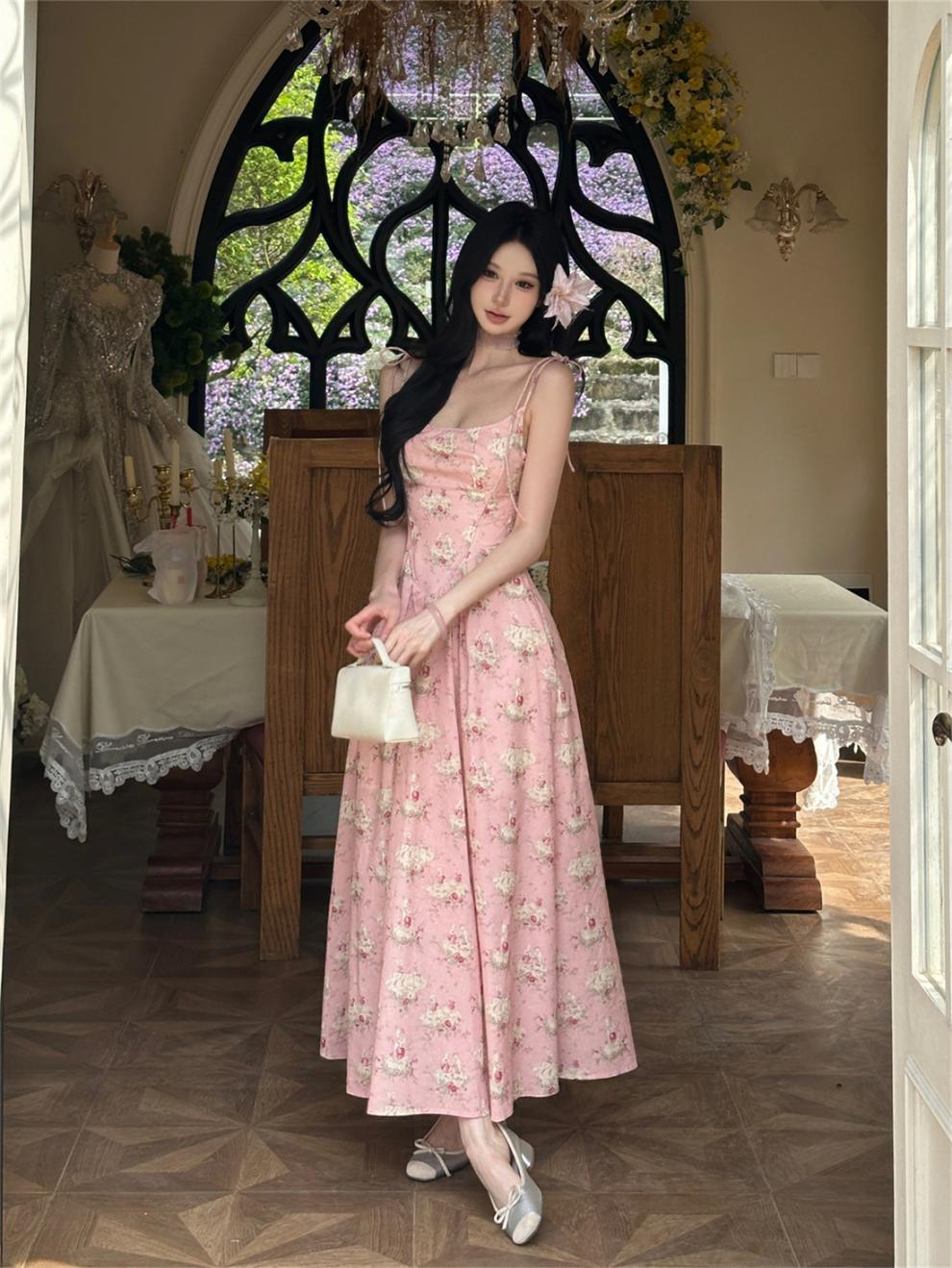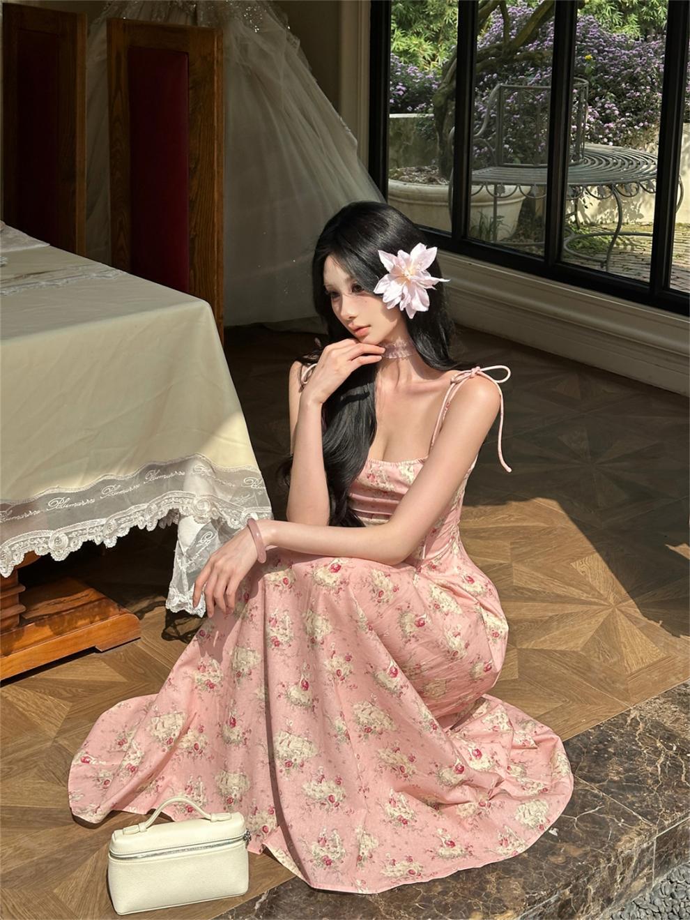 Foto Real de Vestido Rosa Listo para Usar con Tirantes Estampado Francés Espina de Pescado