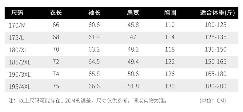 170/M(100-125), 175/L(125-135), 180/XL(135-150), 185/2XL(150-165), 190/3XL(165-180), 195/4XL(180-200)