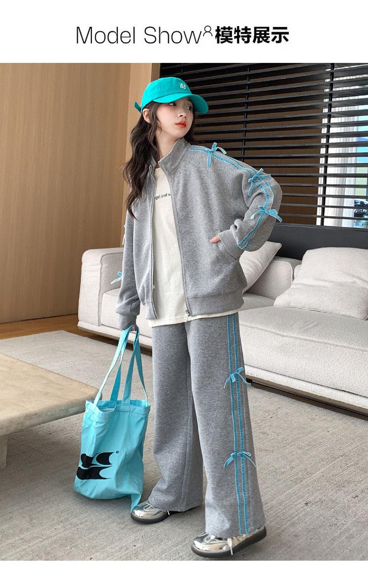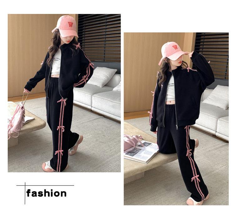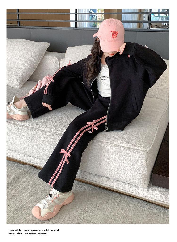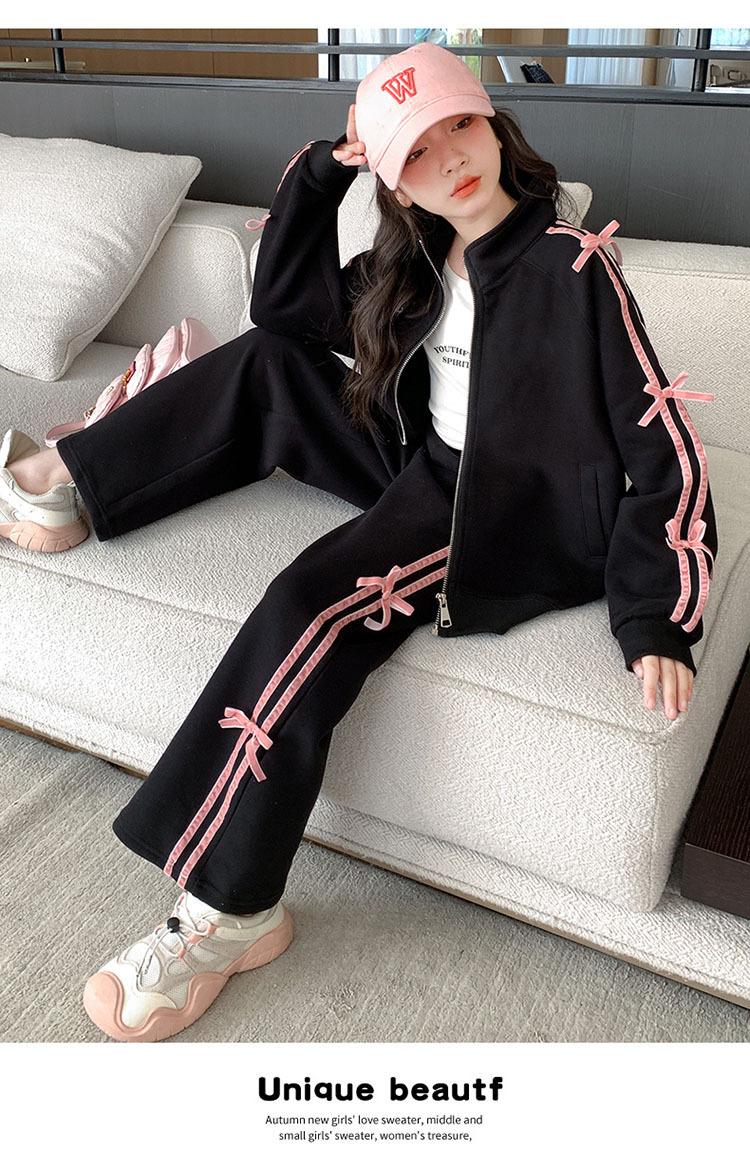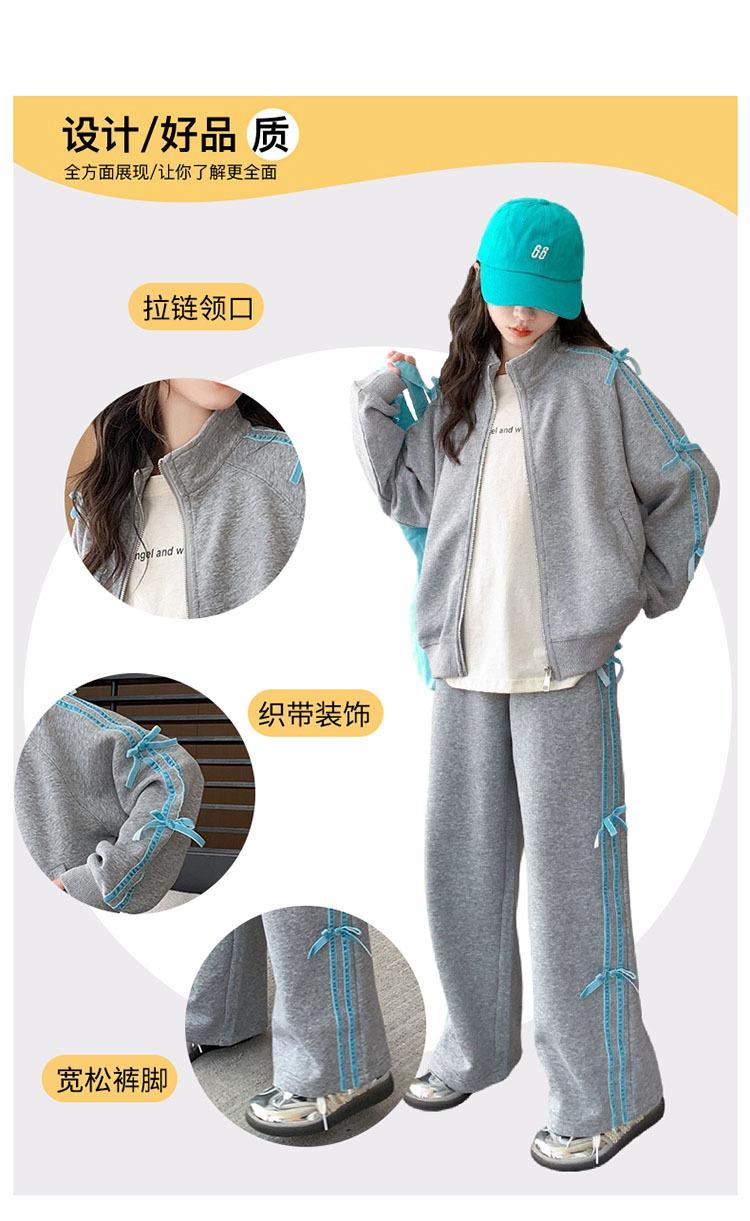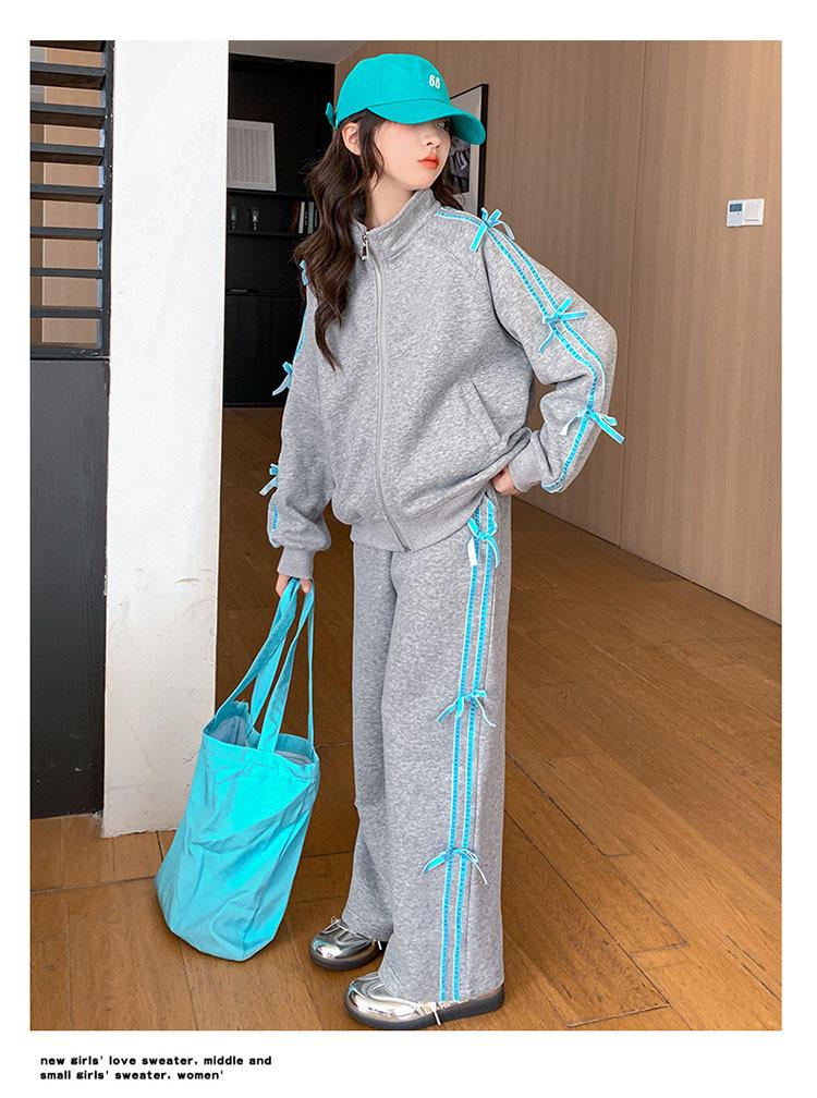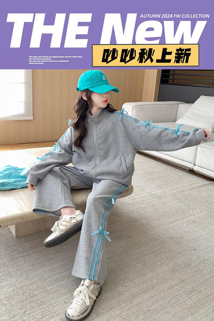 Moda Otoño Niñas Lazo Casual Pierna Ancha Deportivo Conjunto de Dos Piezas Nuevo Traje Sudadera con Cierre y Cuello Alto para Niños