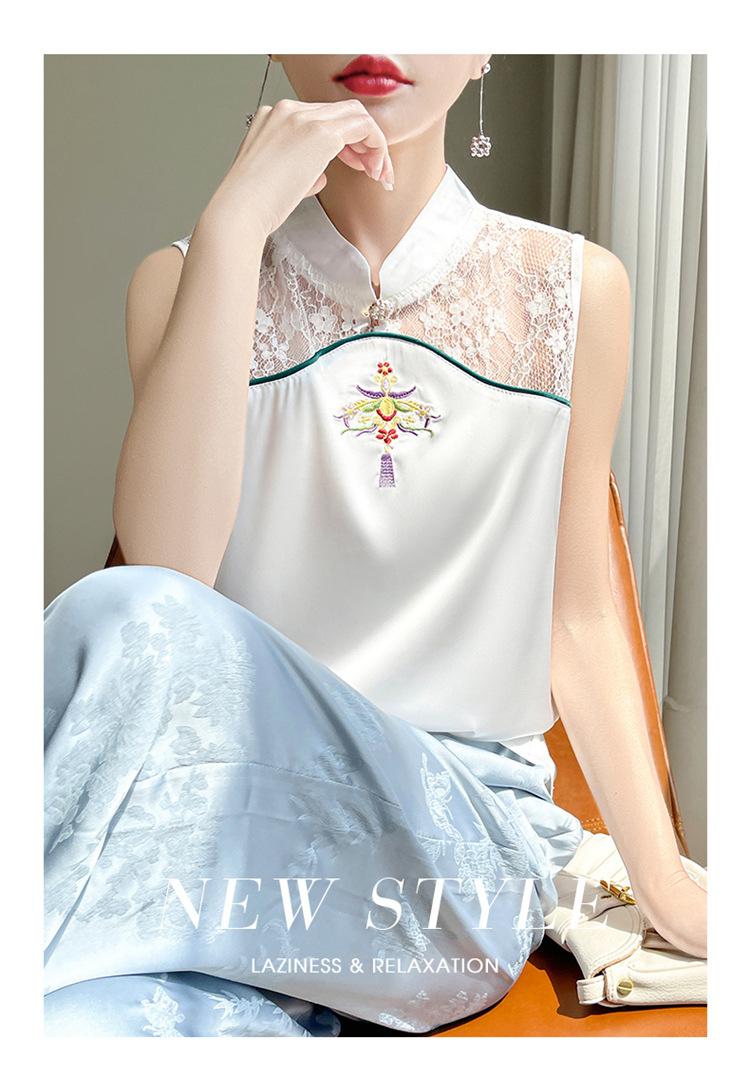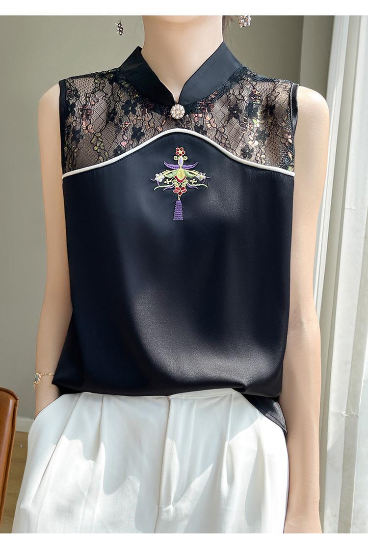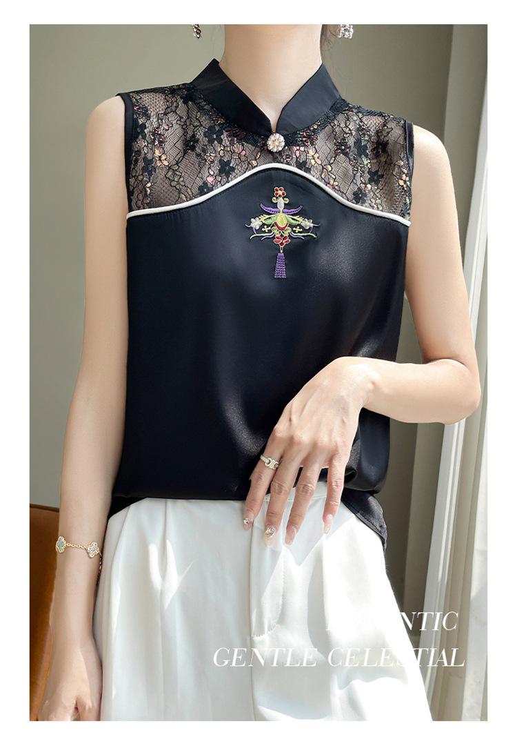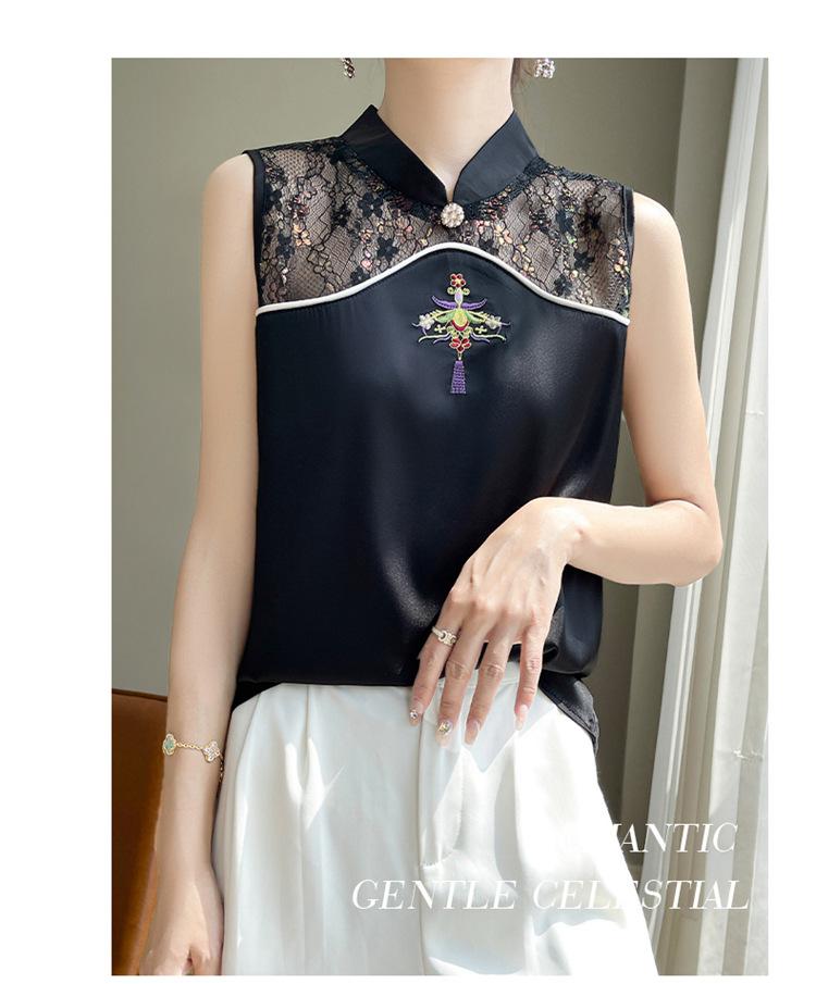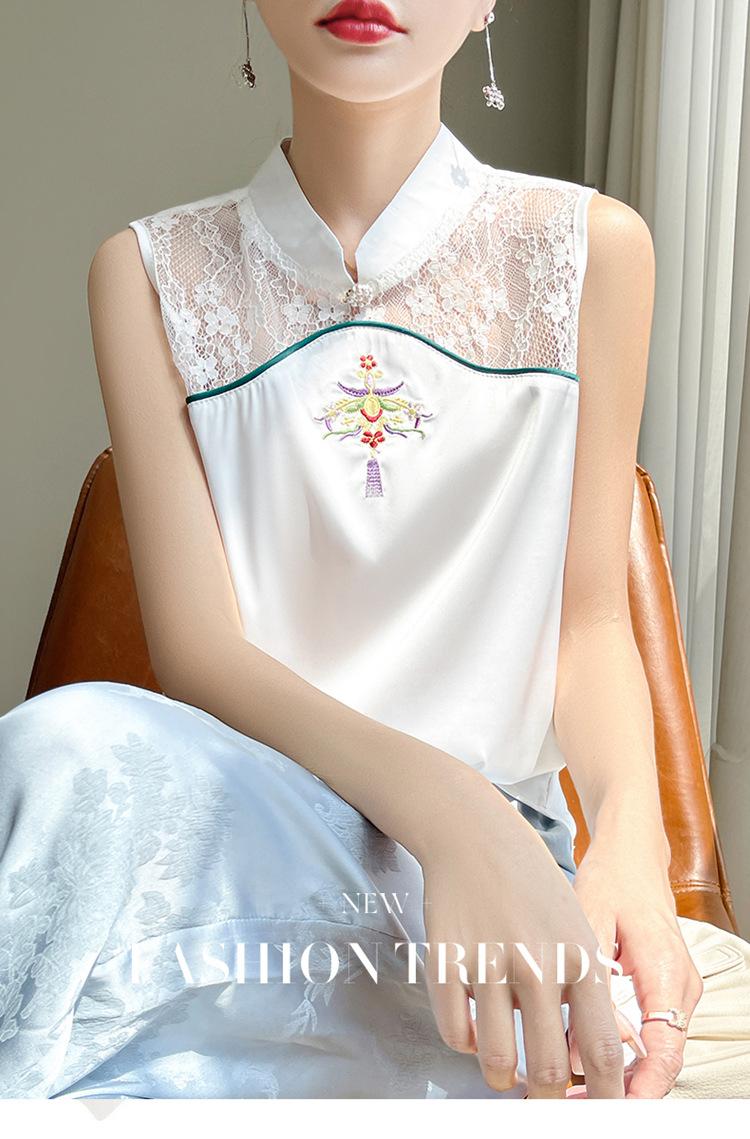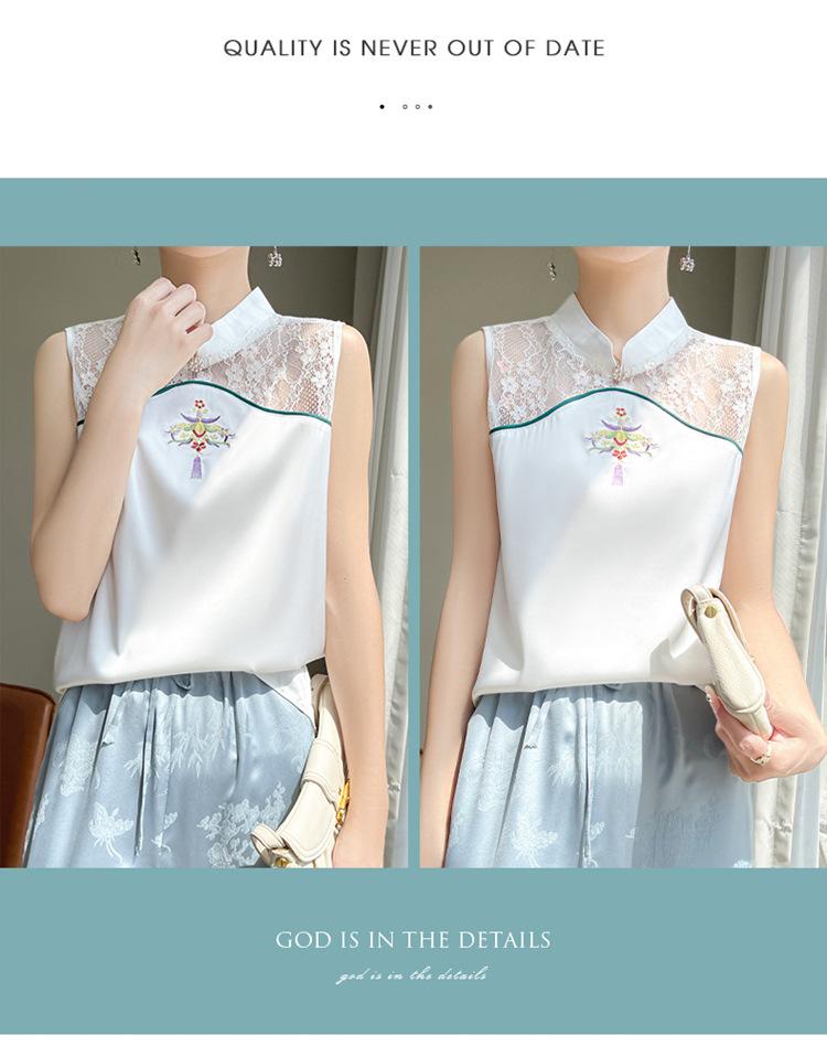 Compra Primavera y Verano 2025 Nuevo Estilo Chino Estilo Nacional Chaleco de Cuello Satén para Mujer Encaje Calado Bordado Florete Camisa Base al por mayor en Joom.pro