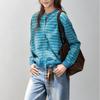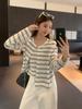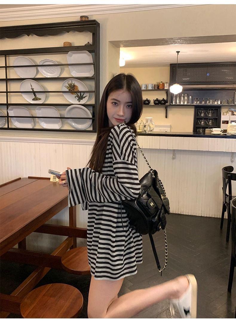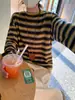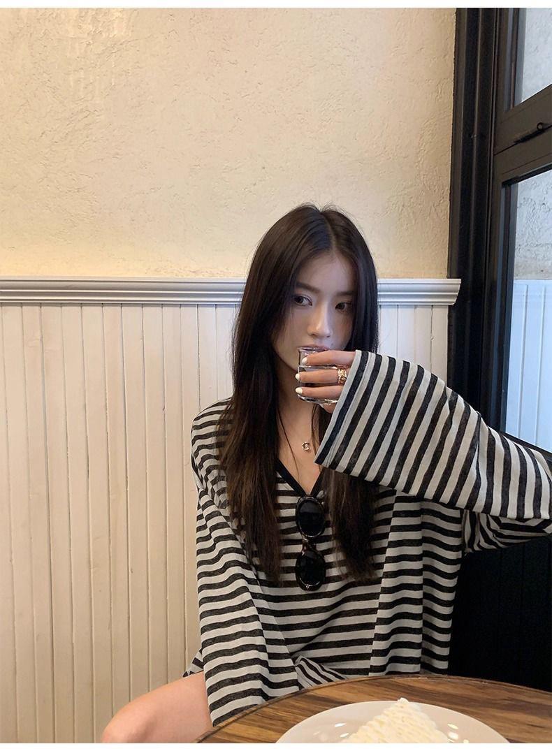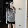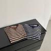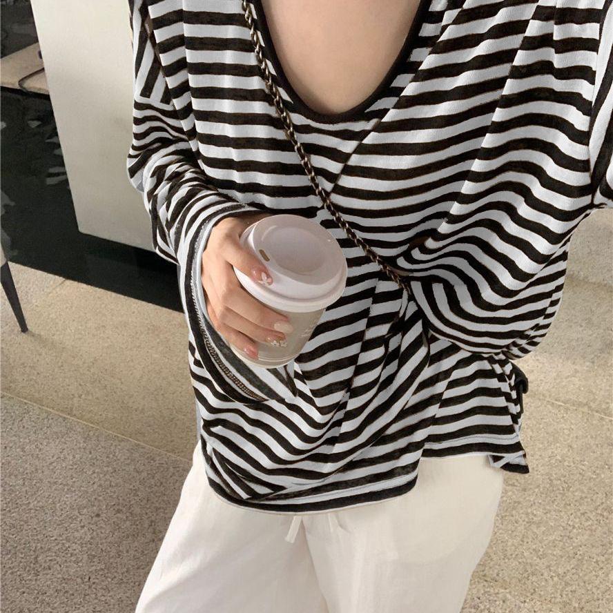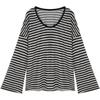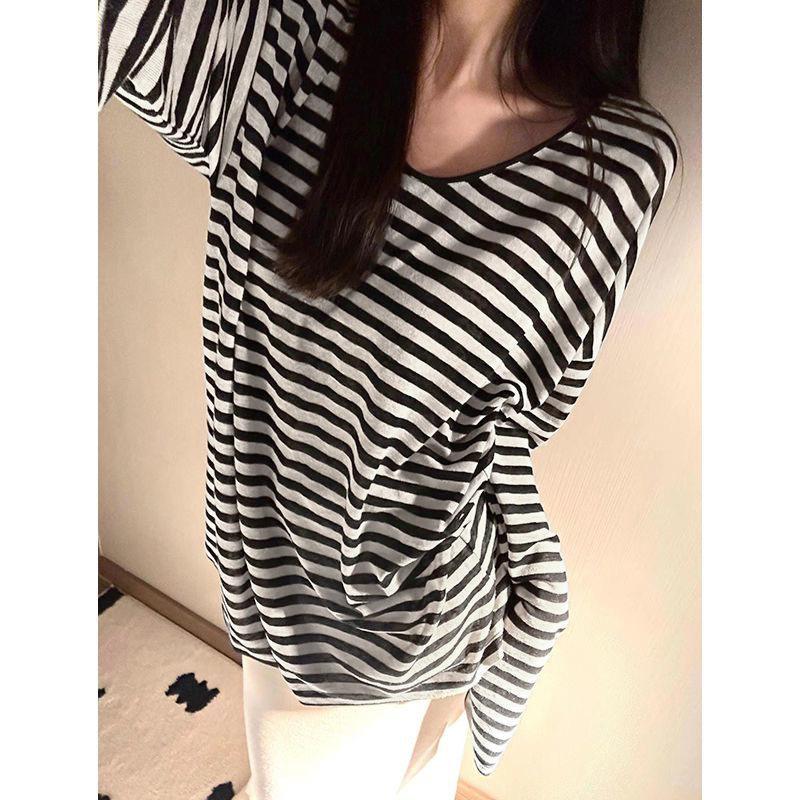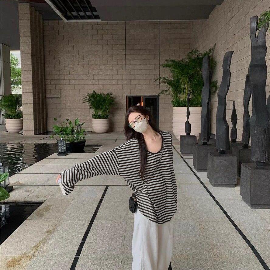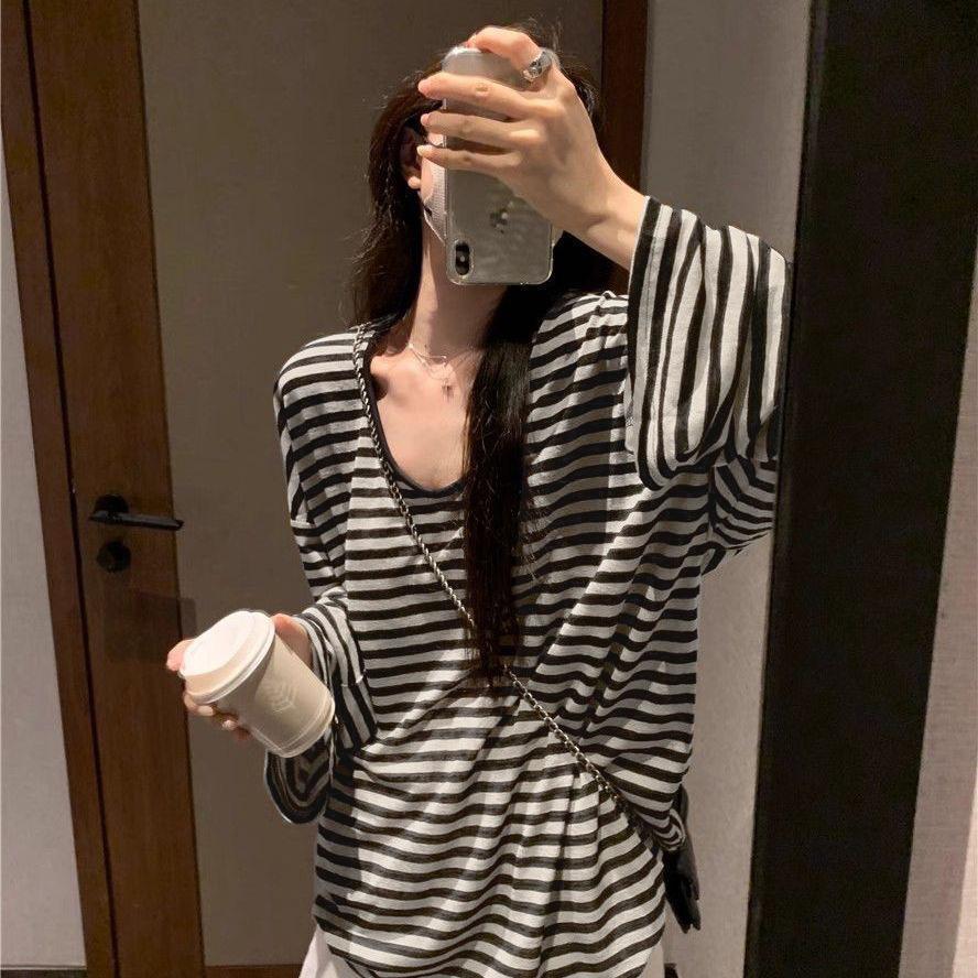Estilo Perezoso Retro Bloque de Color Rayado Camiseta Manga Larga Mujer 2025 Otoño Nuevo Suave Cerosa Holgada Adelgazante Top Medio