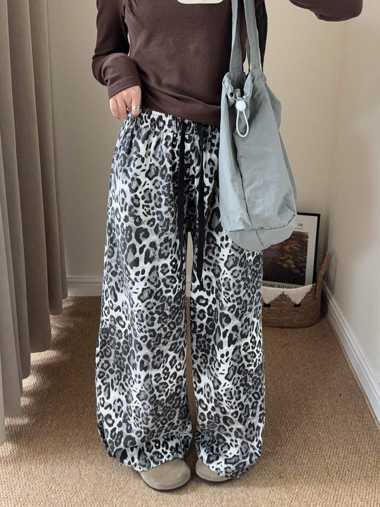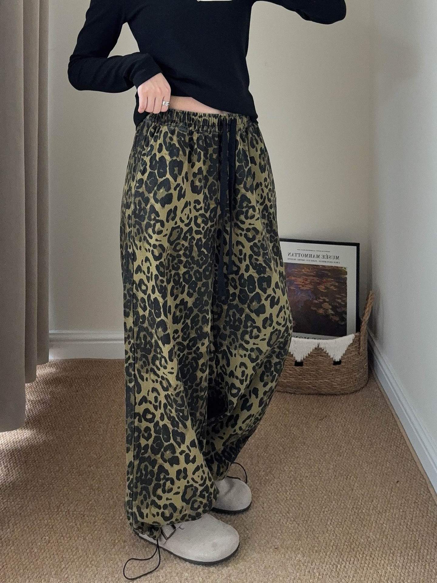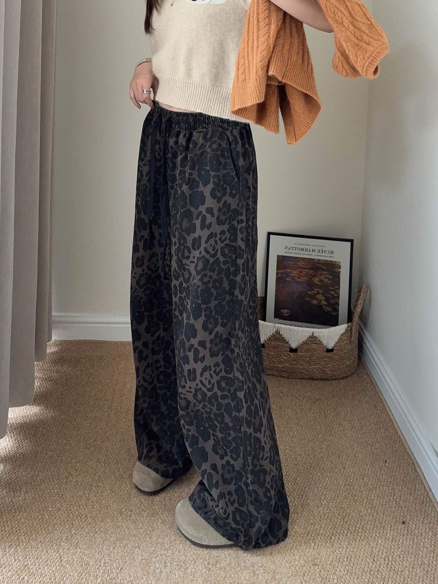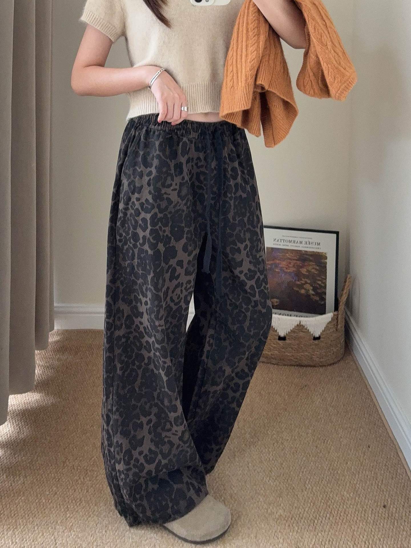 Coma mismo estilo agencia coreana retro americano estampado de leopardo pantalones anchos otoño nuevo caída holgados casuales pantalones largos de mujer