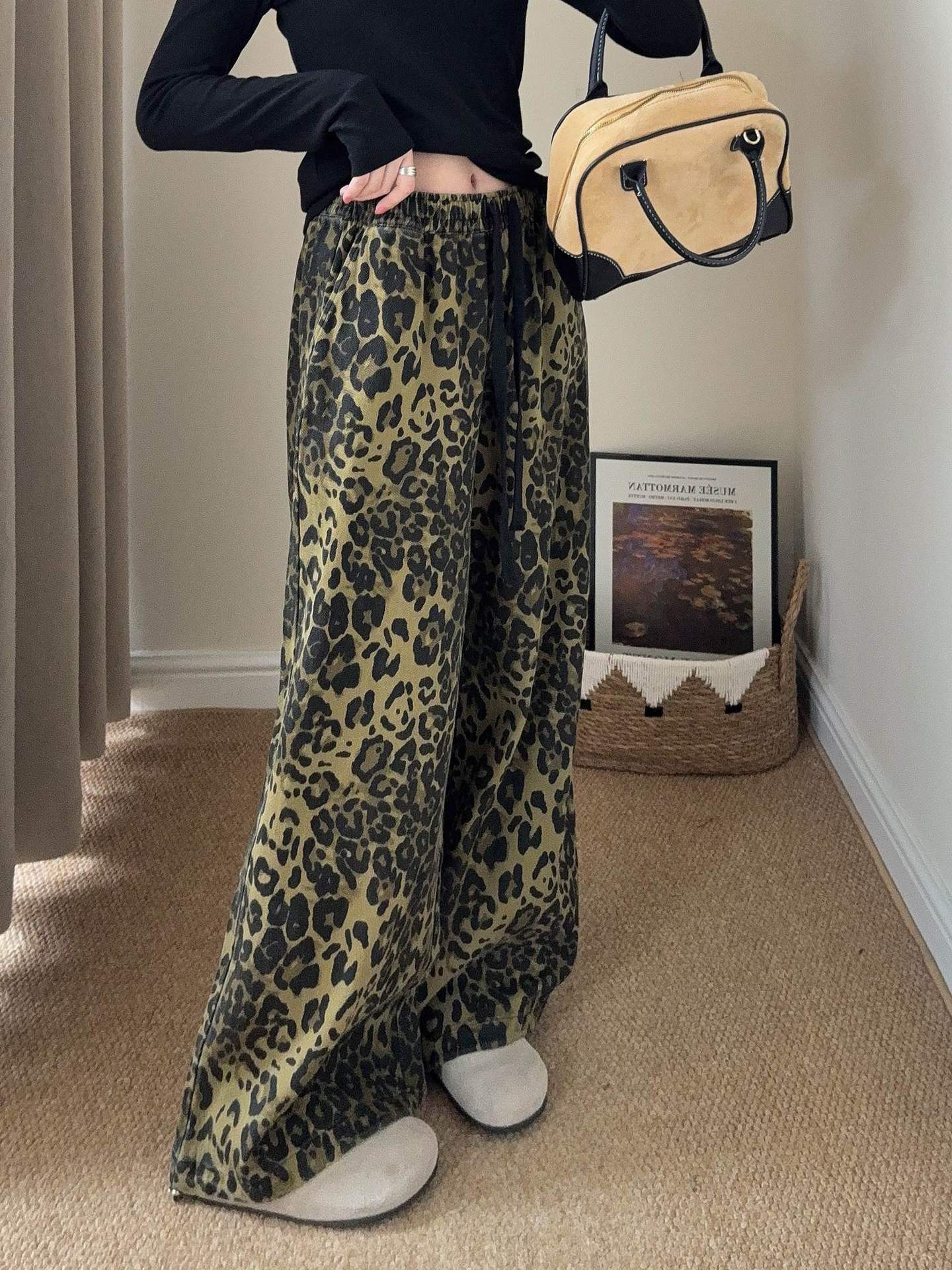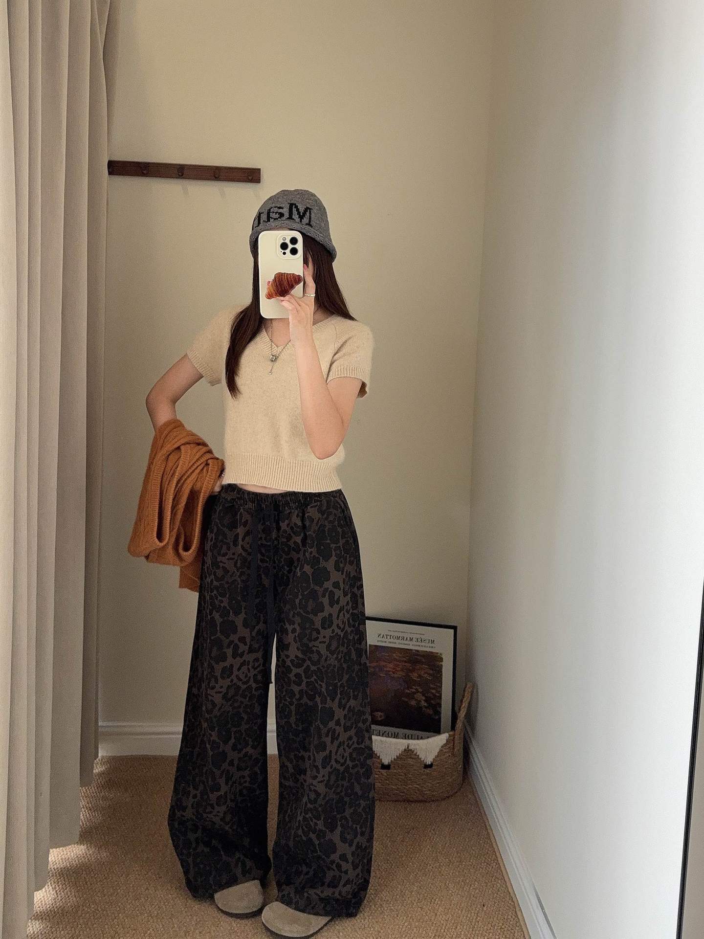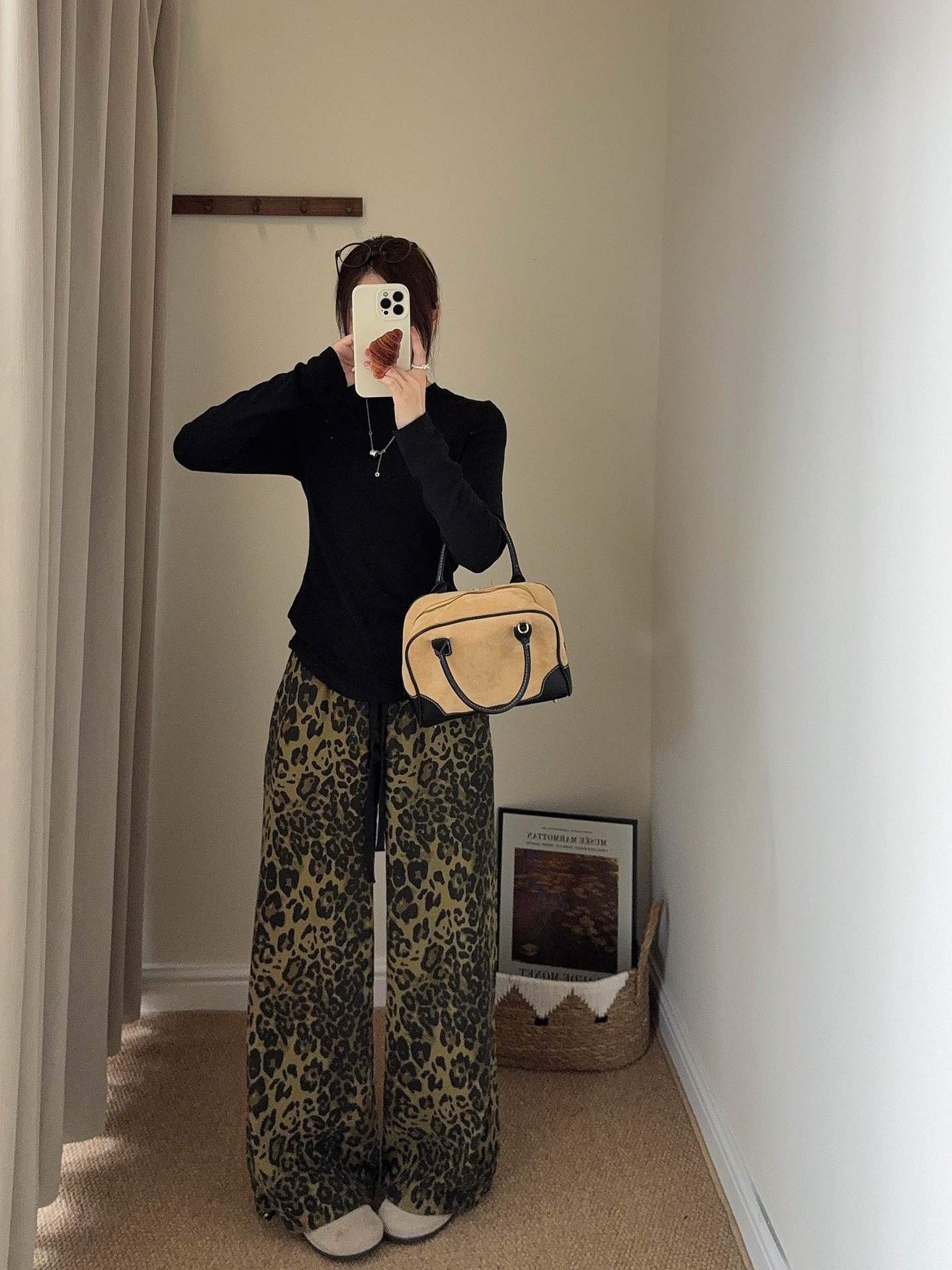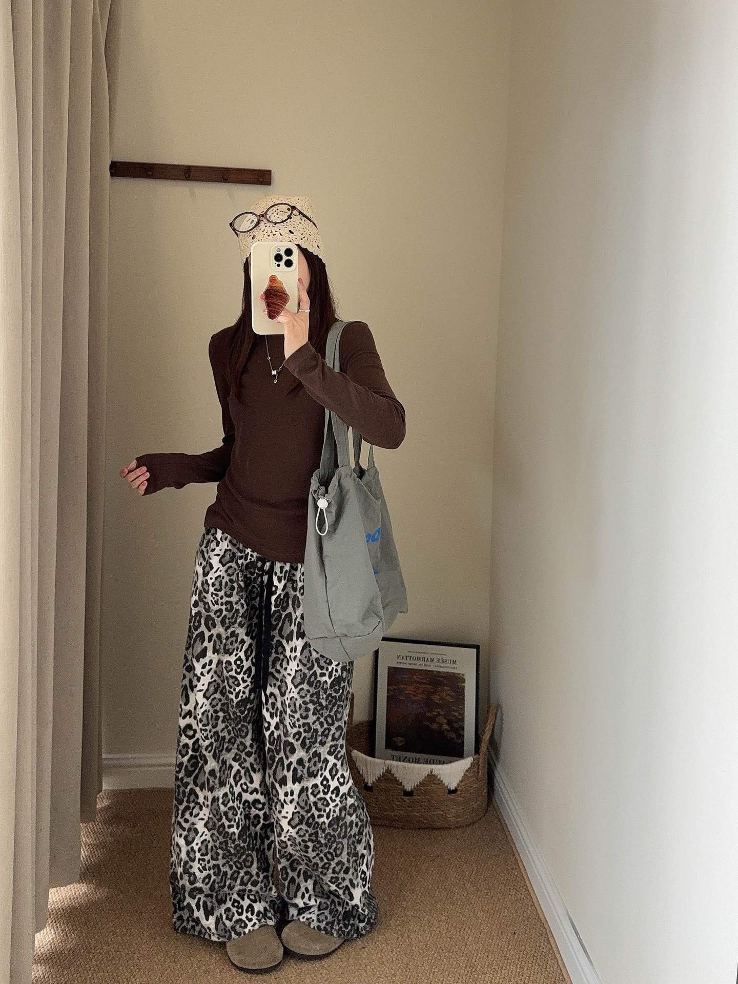 Coma mismo estilo agencia coreana retro americano estampado de leopardo pantalones anchos otoño nuevo caída holgados casuales pantalones largos de mujer
