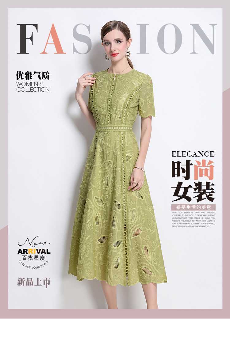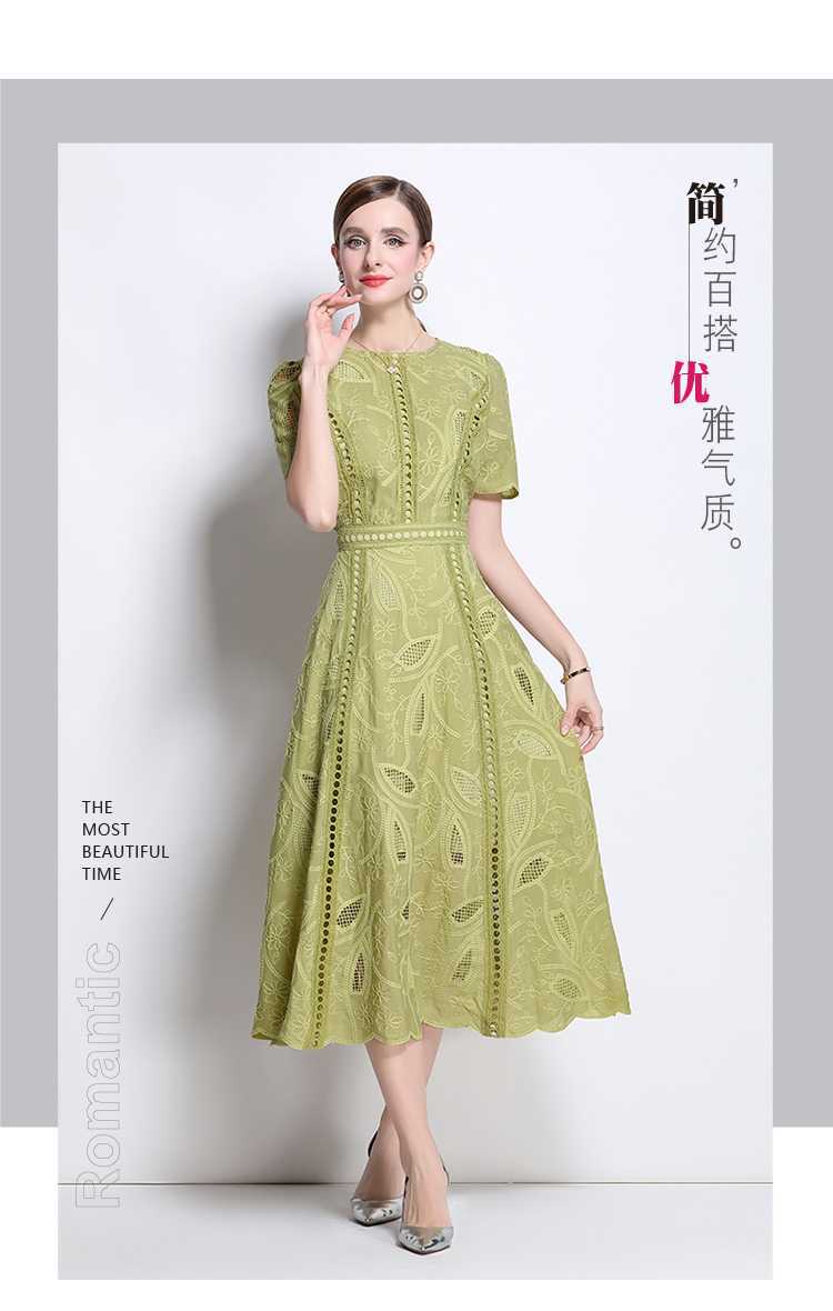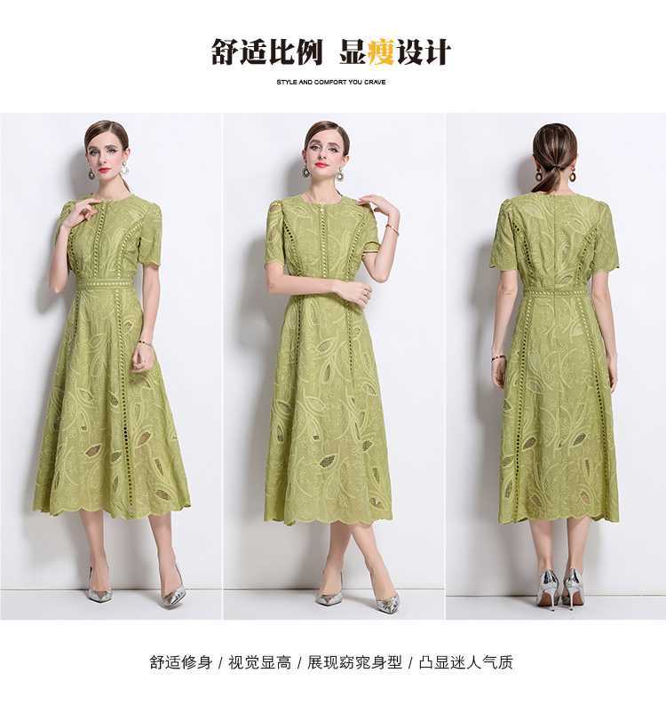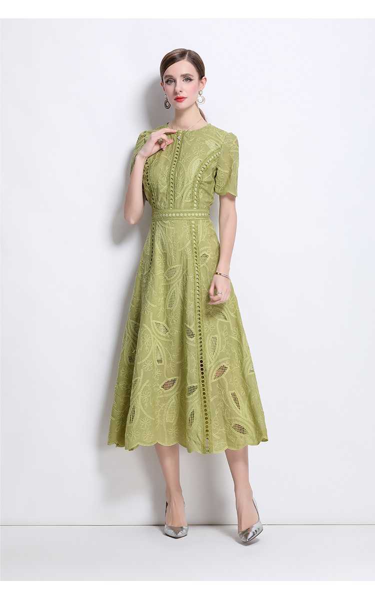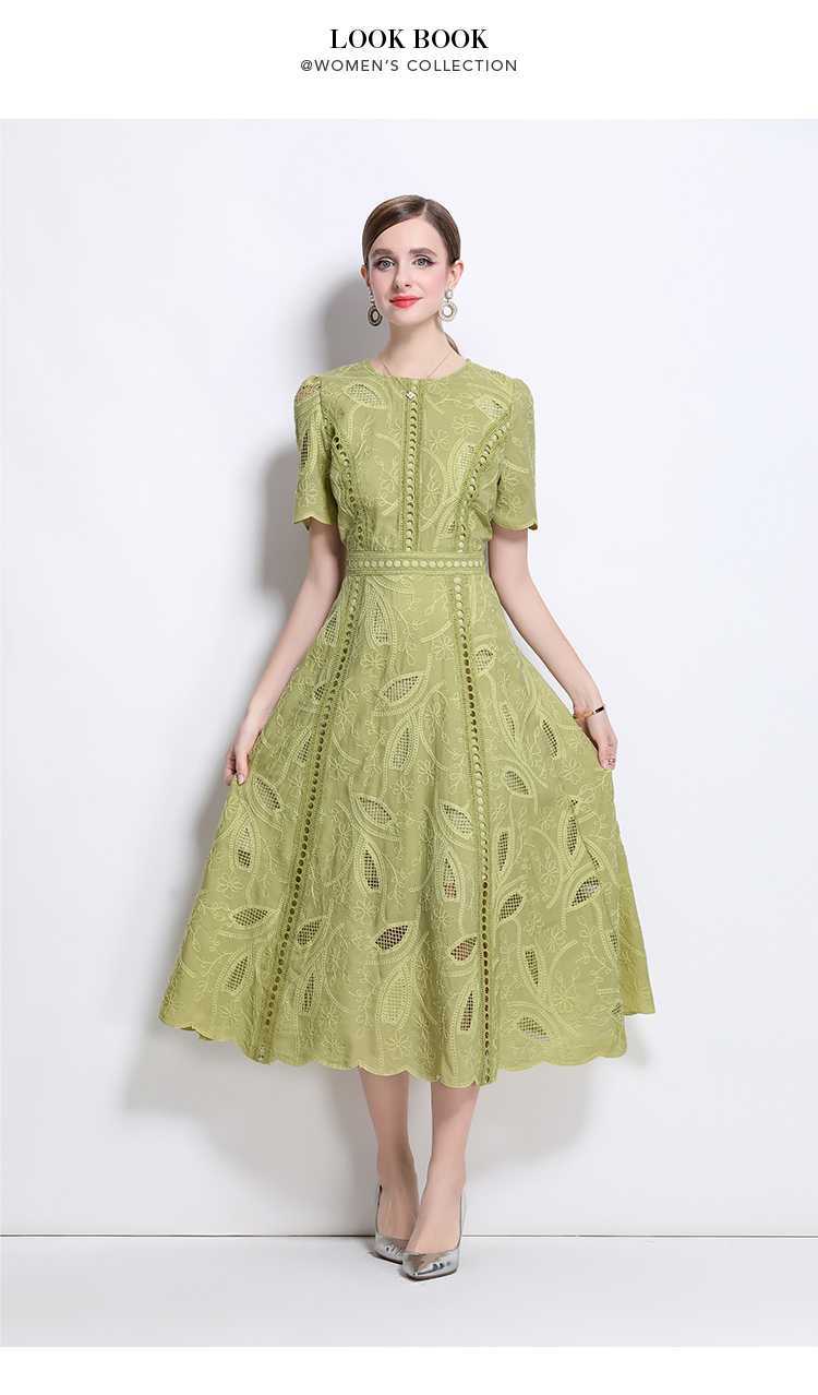 Verano Francés Retro Pesado Calado Bordado Cuello Redondo Adelgazante Cintura Manga Corta Vestido Mujer Adelgazante Vestido Largo