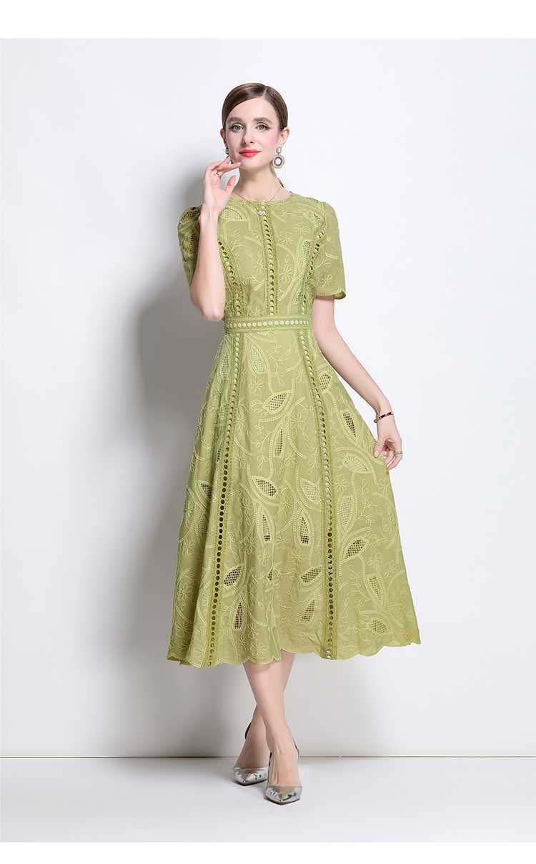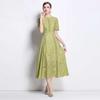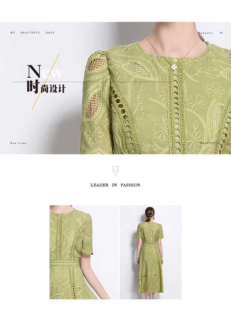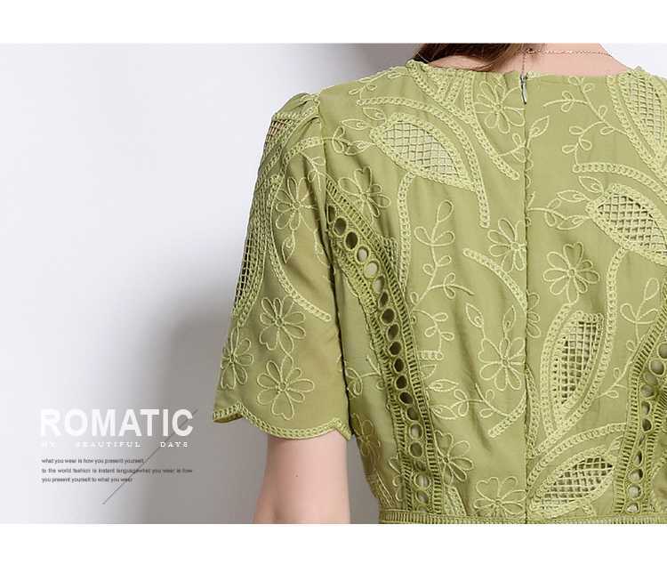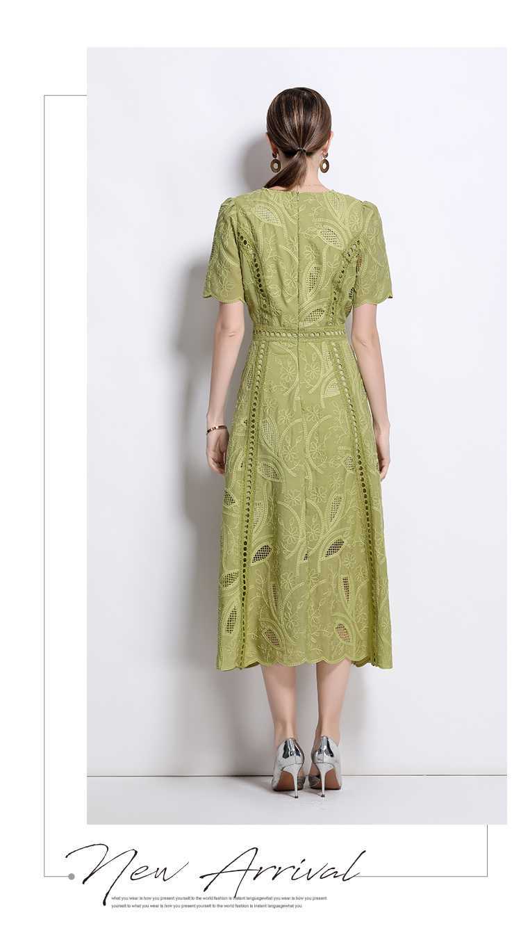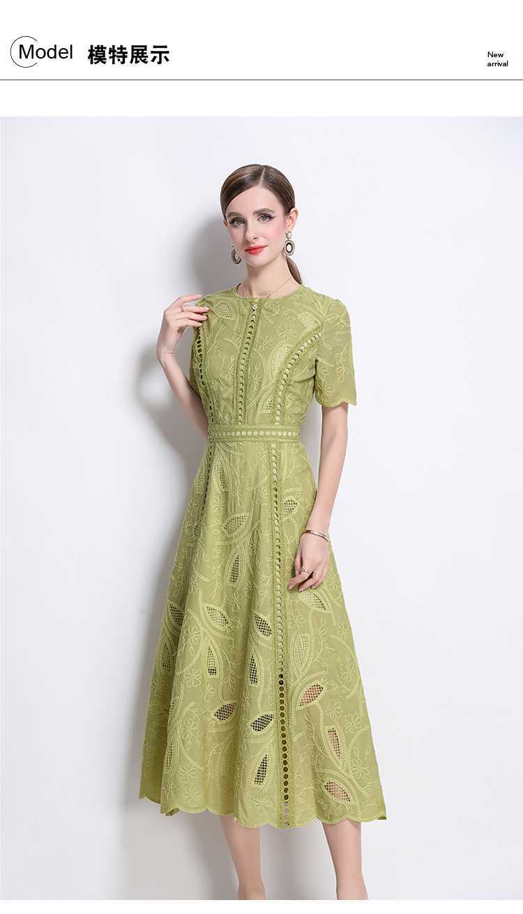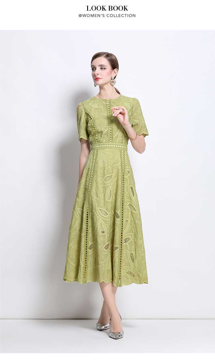 Verano Francés Retro Pesado Calado Bordado Cuello Redondo Adelgazante Cintura Manga Corta Vestido Mujer Adelgazante Vestido Largo