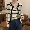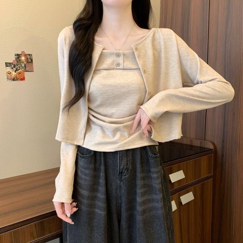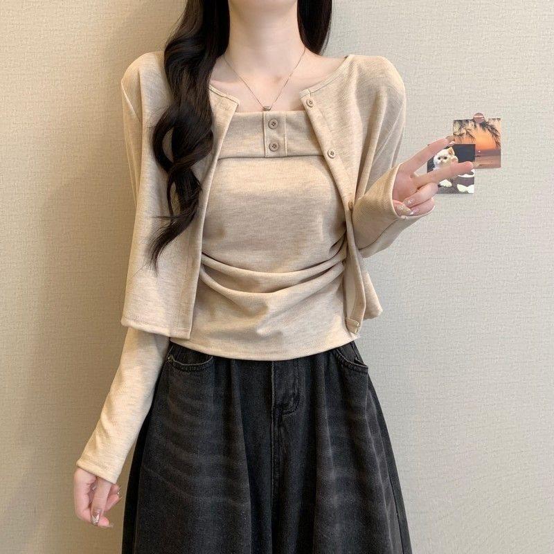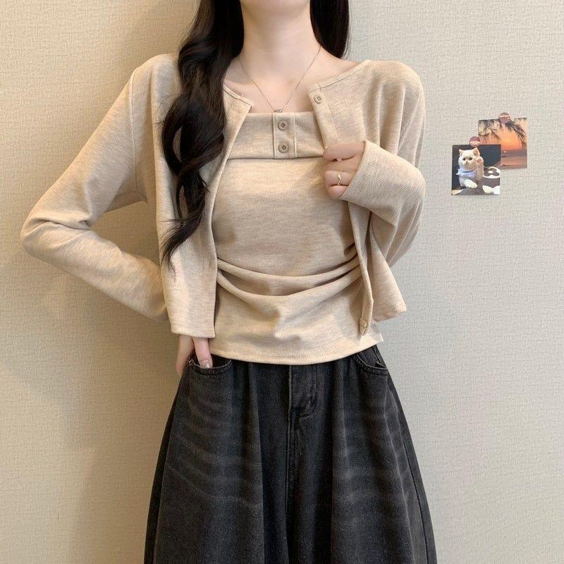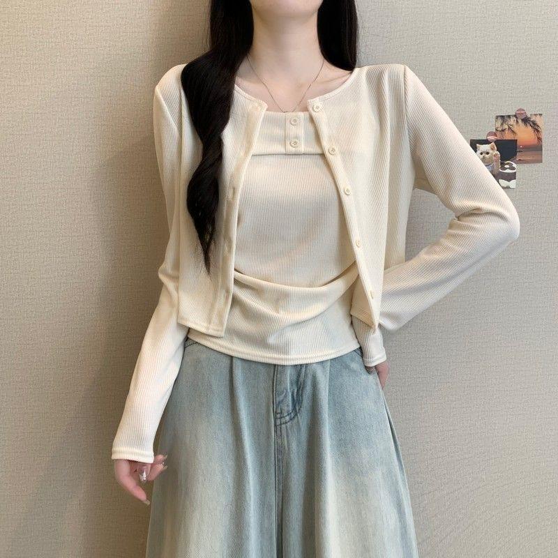 Estilo otoño e invierno francés nuevo sentido del diseño camisola interior plisada + cárdigan corto de manga larga en capas conjunto de dos piezas mujer