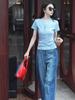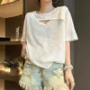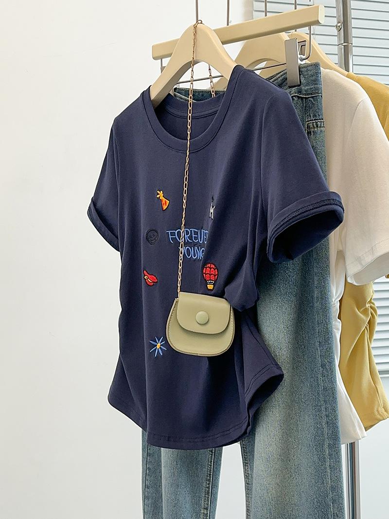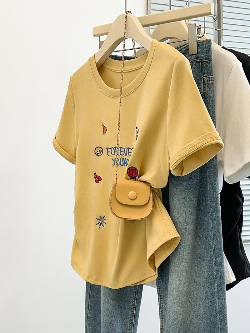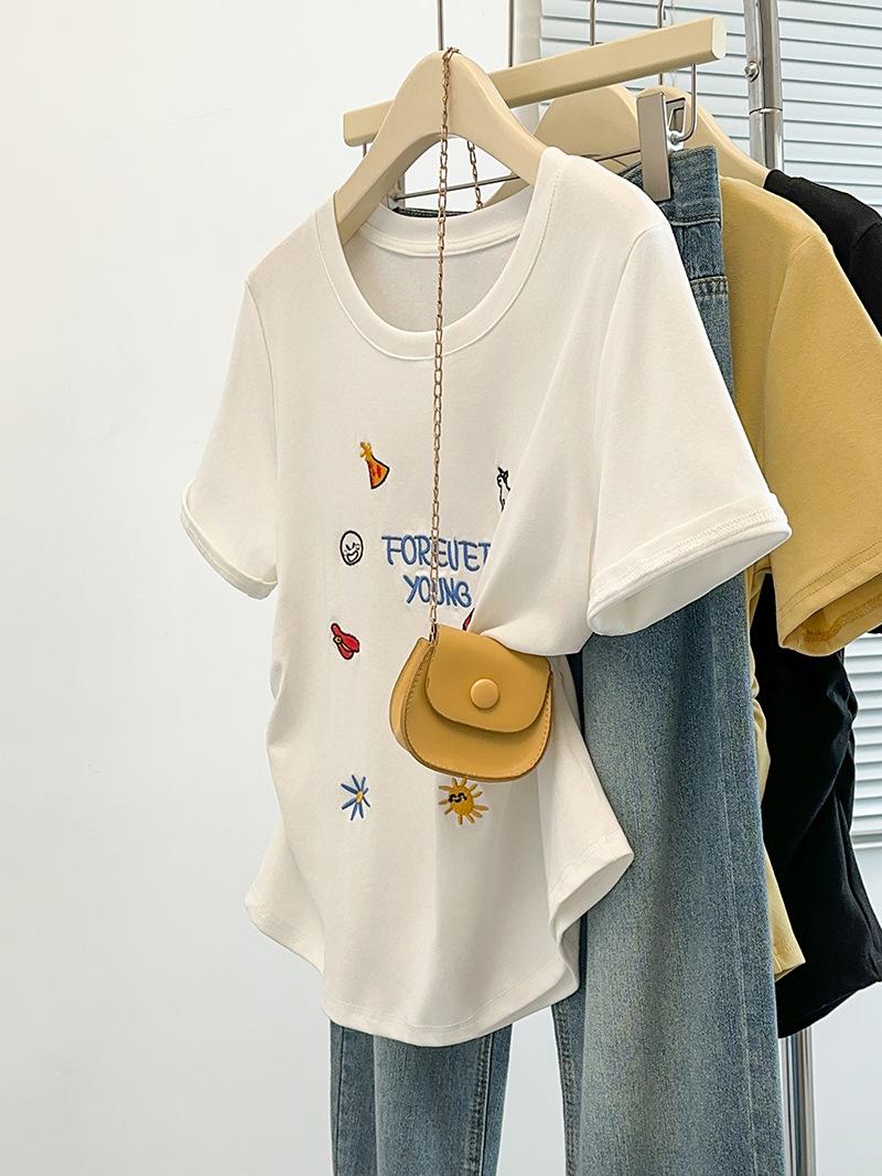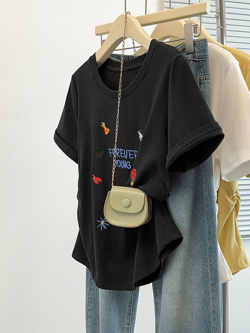 Ropa de Verano Nueva 2025 para Mujeres Gorditas Talla Grande Dulce Bordado Letras de Dibujos Animados Camiseta Curva de Manga Corta