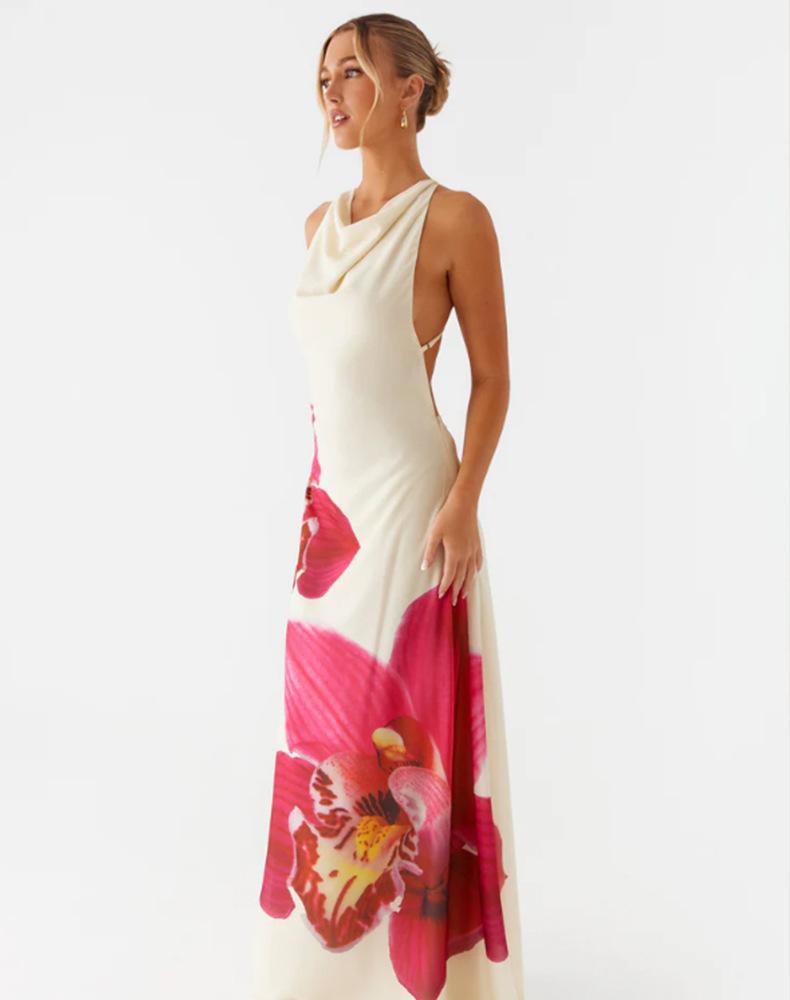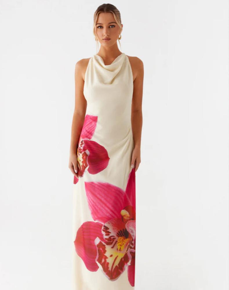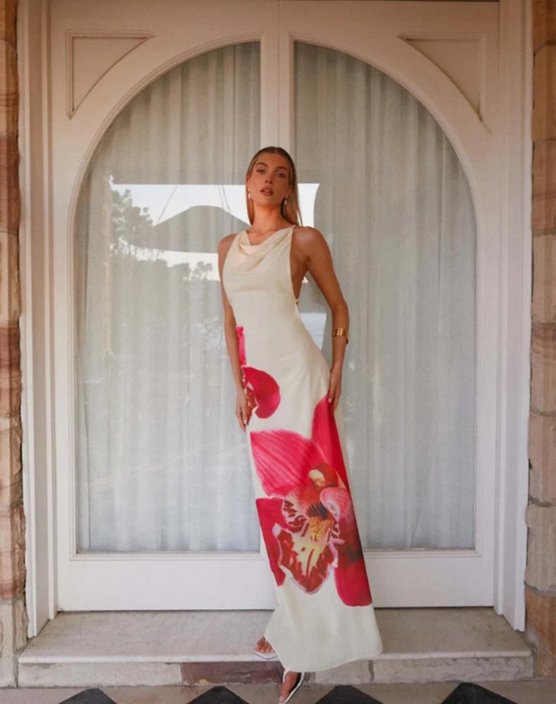 Vestido Europeo y Americano de Estilo Vacacional Transfronterizo 2025 Nuevo Sin Mangas Estampado Grande Sin Espalda Elegante Falda de Mujer Vestido Cintura