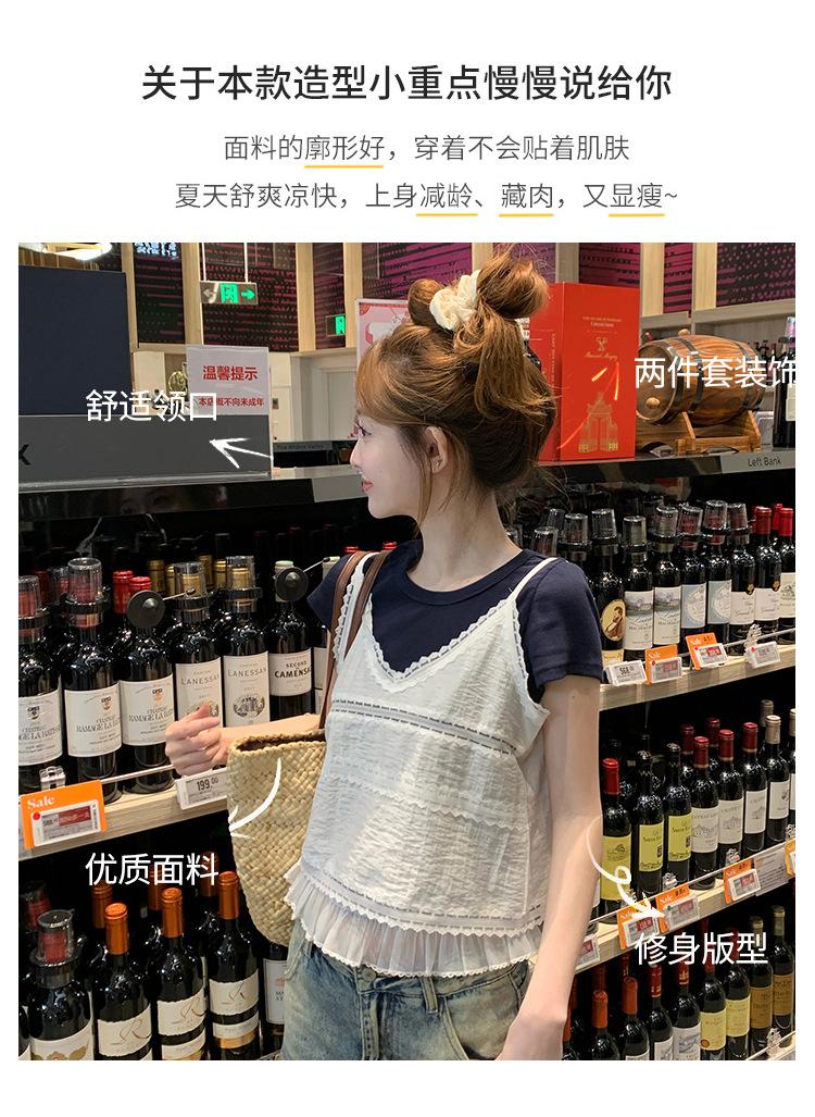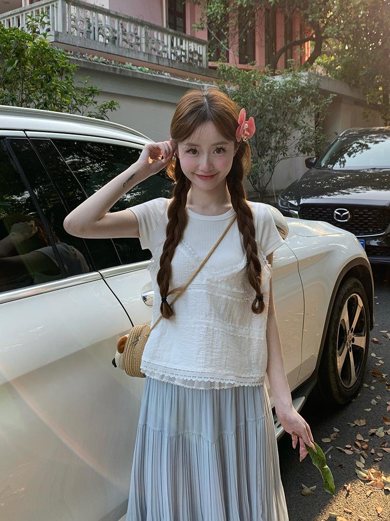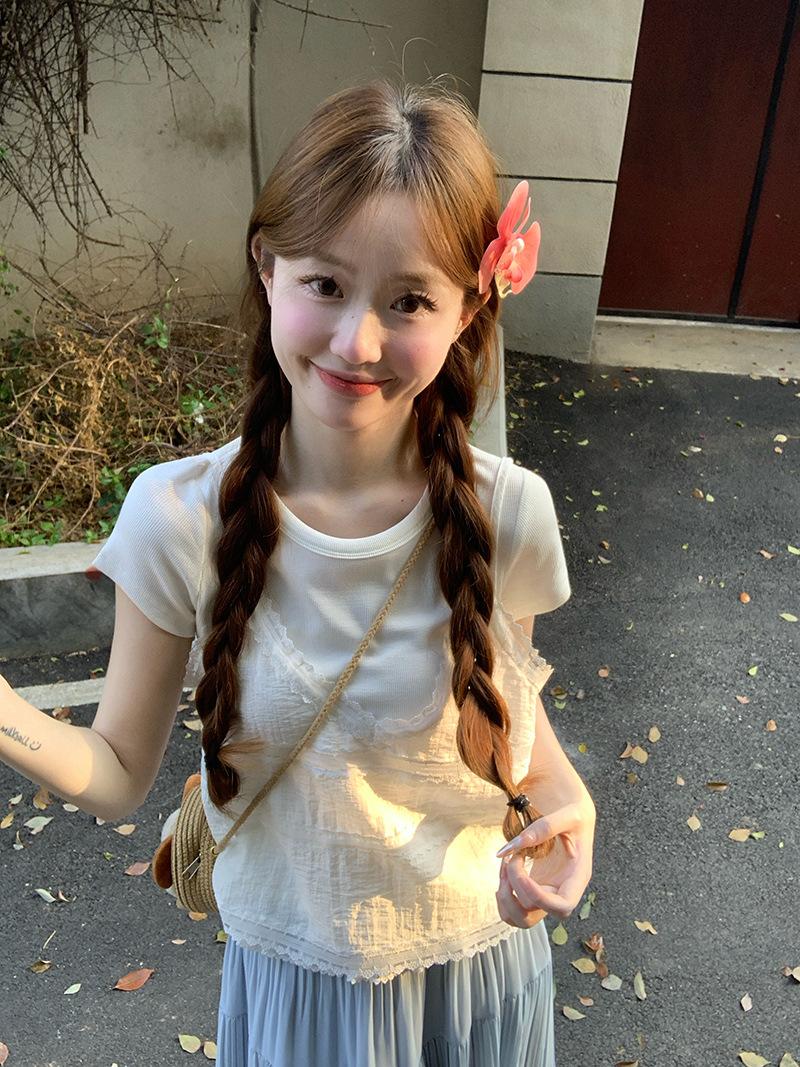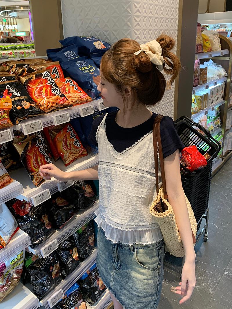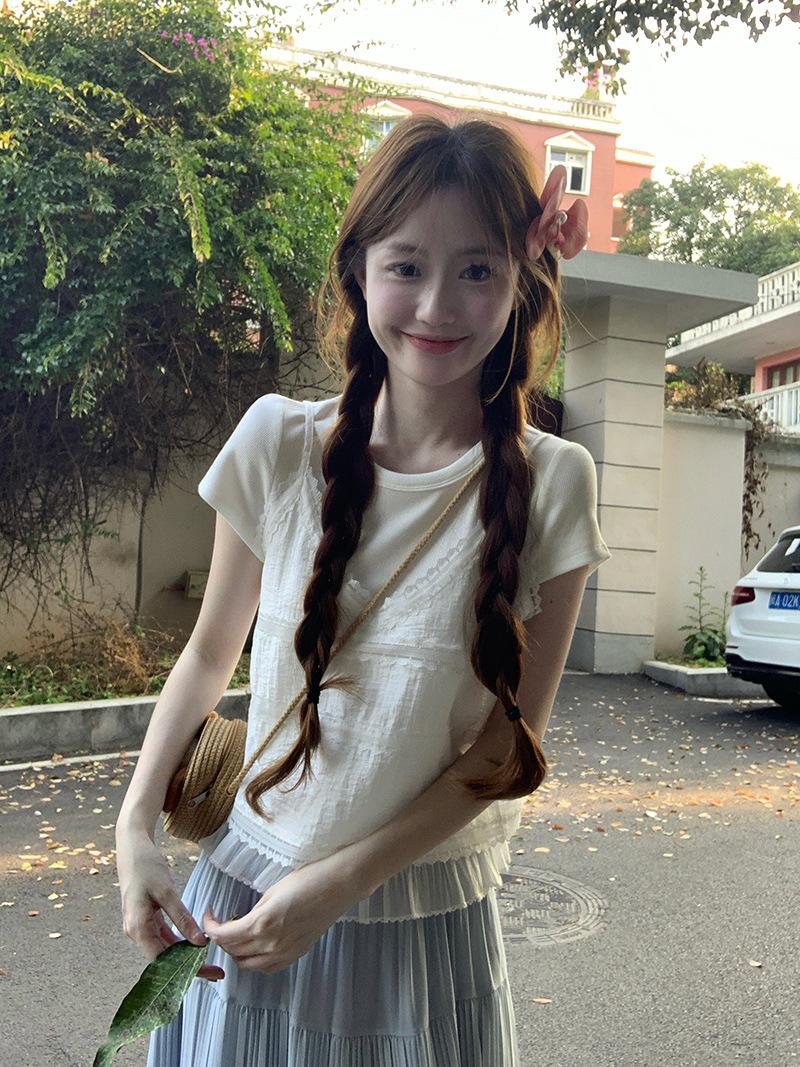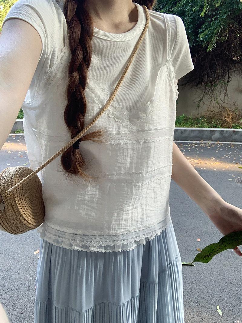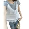 Camisola de Encaje Crochet Falso de Dos Piezas Estilo Francés, Camiseta de Manga Corta para Mujer, Diseño de Verano, Corta y Chic, Top Impresionante Ins