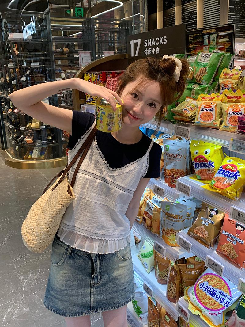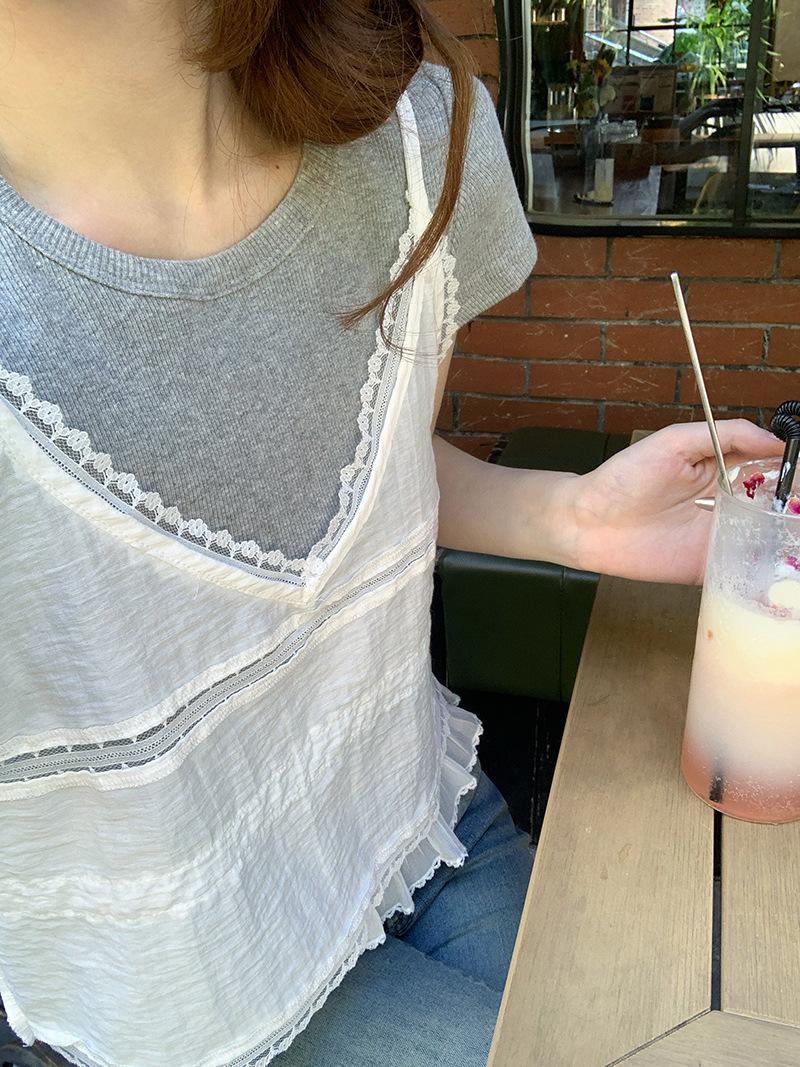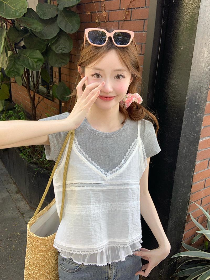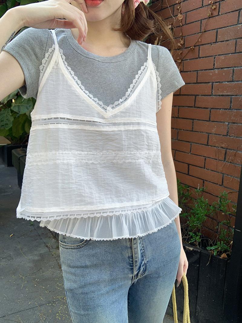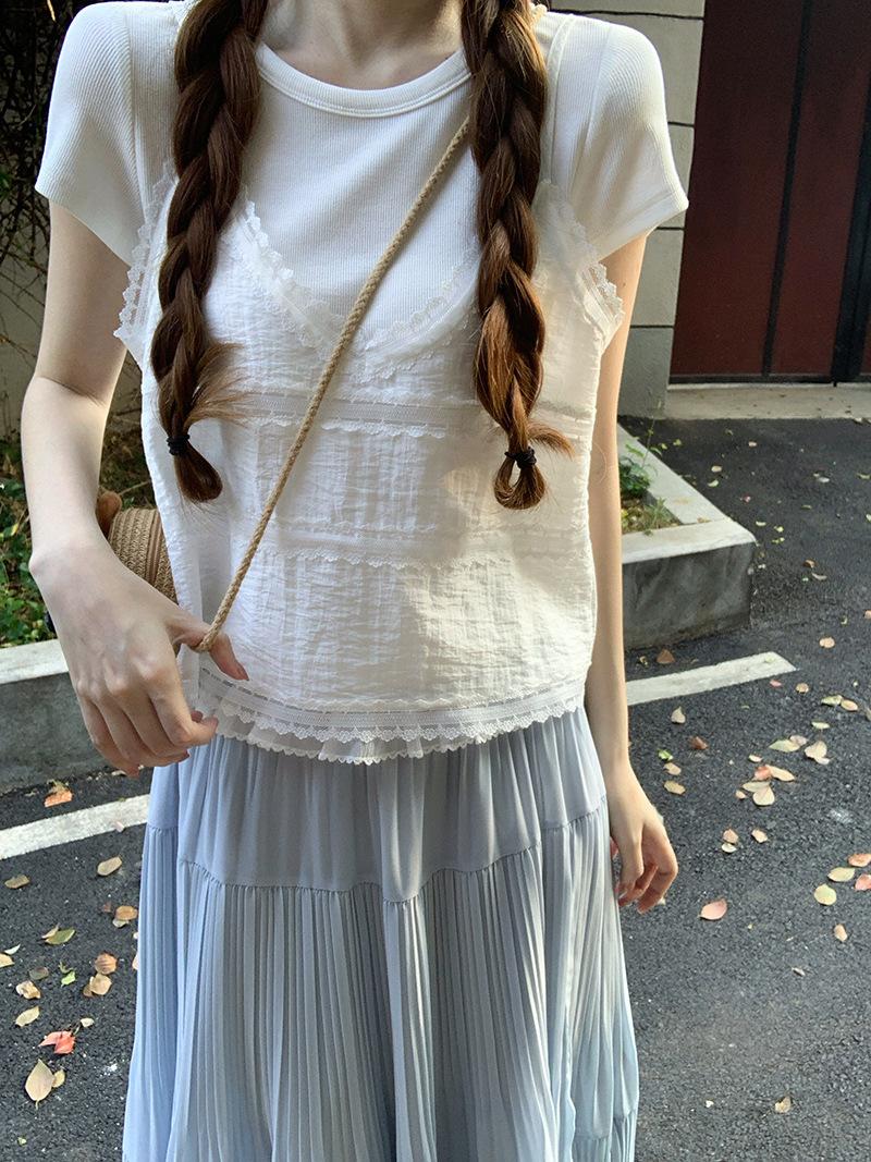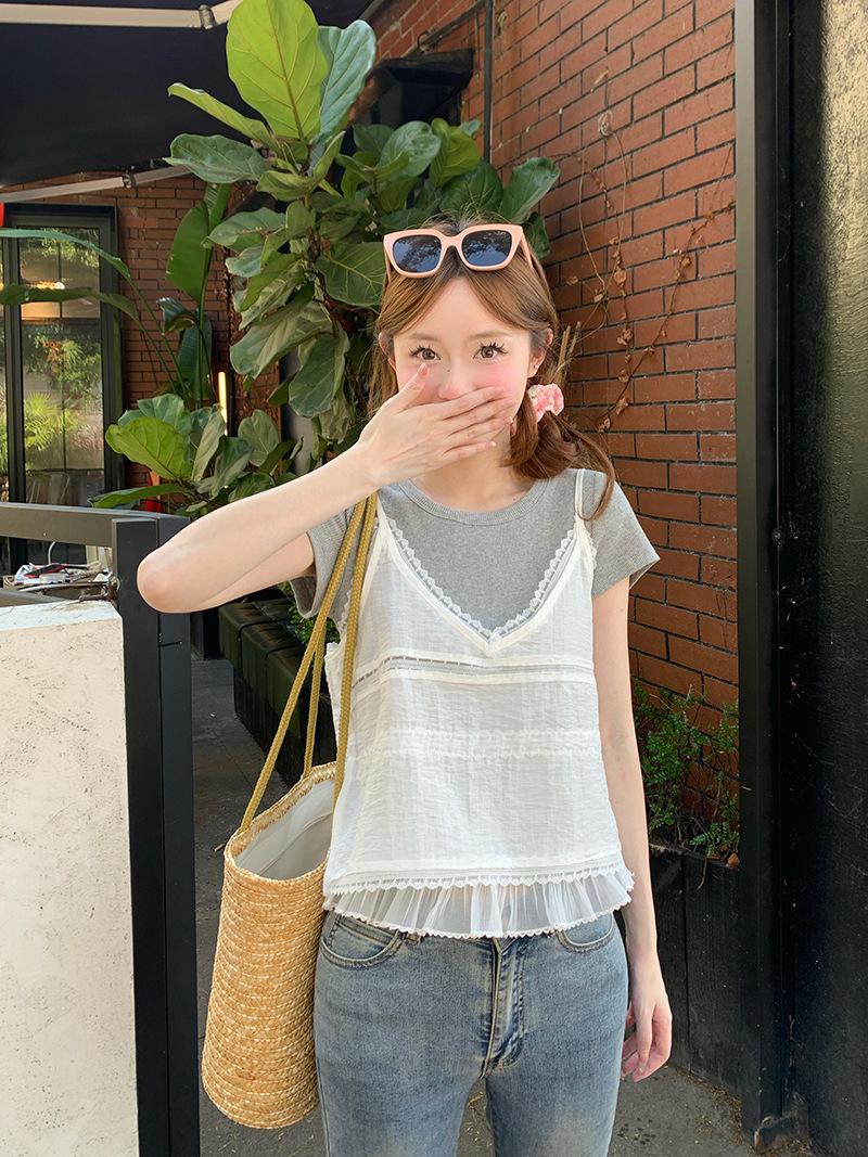 Camisola de Encaje Crochet Falso de Dos Piezas Estilo Francés, Camiseta de Manga Corta para Mujer, Diseño de Verano, Corta y Chic, Top Impresionante Ins