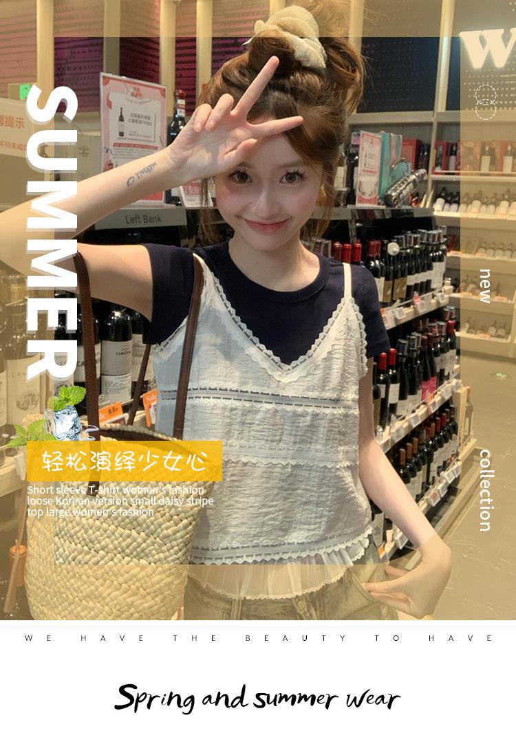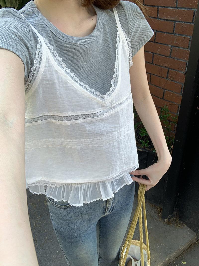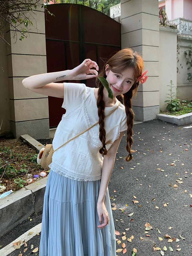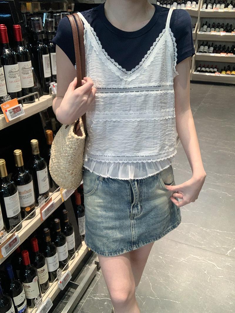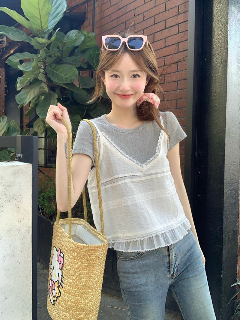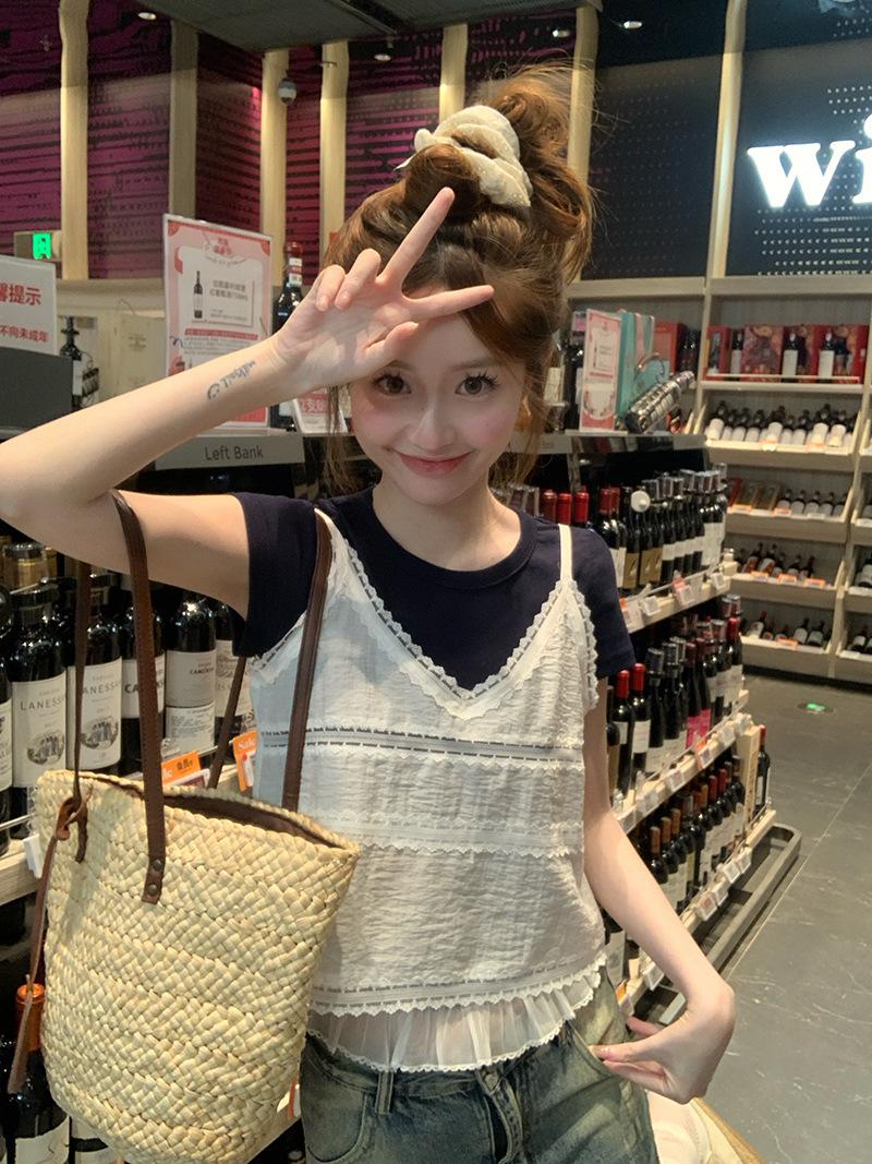 Camisola de Encaje Crochet Falso de Dos Piezas Estilo Francés, Camiseta de Manga Corta para Mujer, Diseño de Verano, Corta y Chic, Top Impresionante Ins