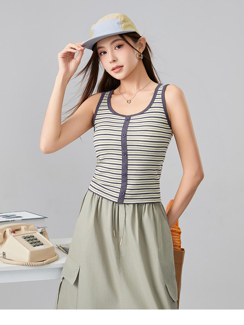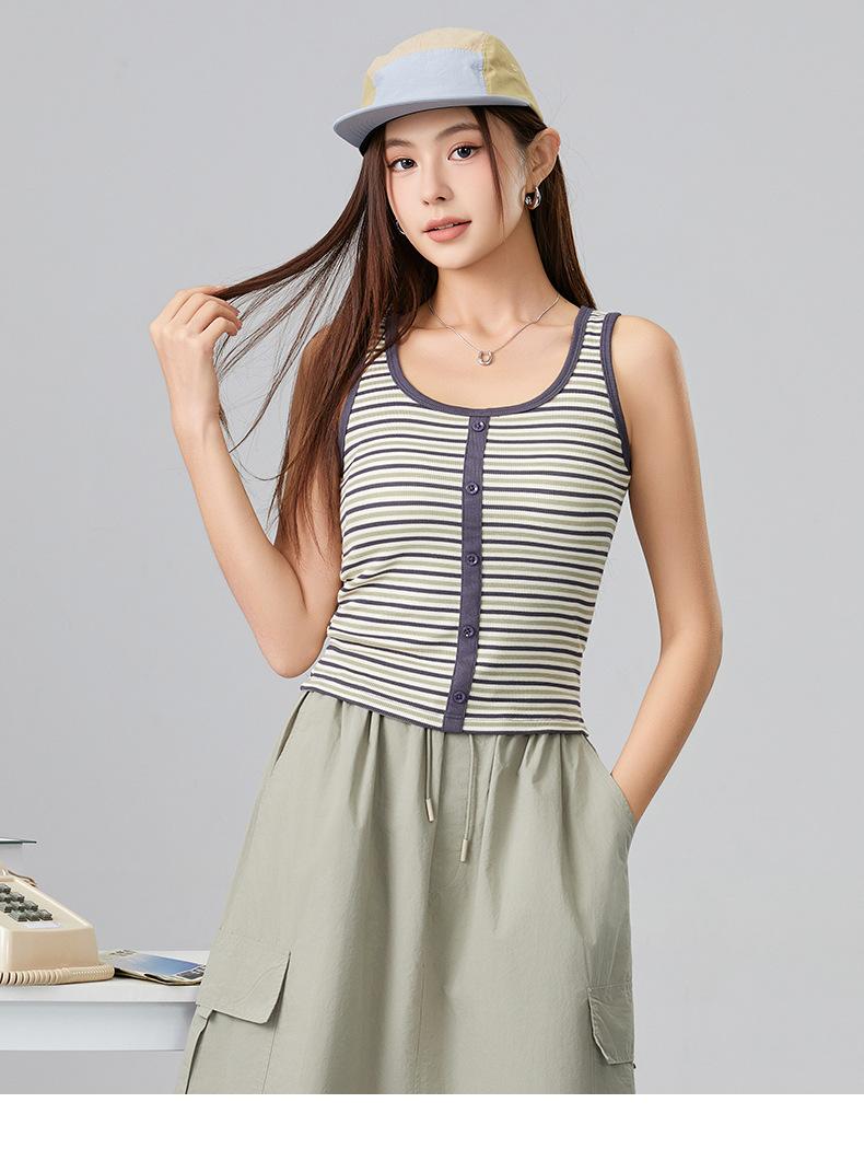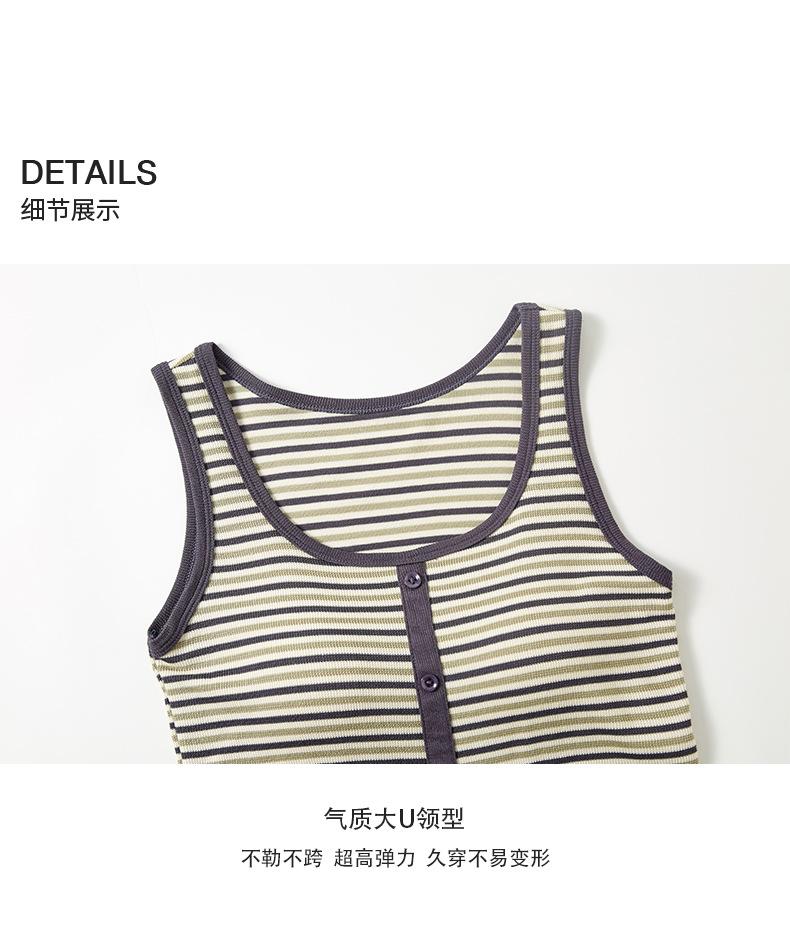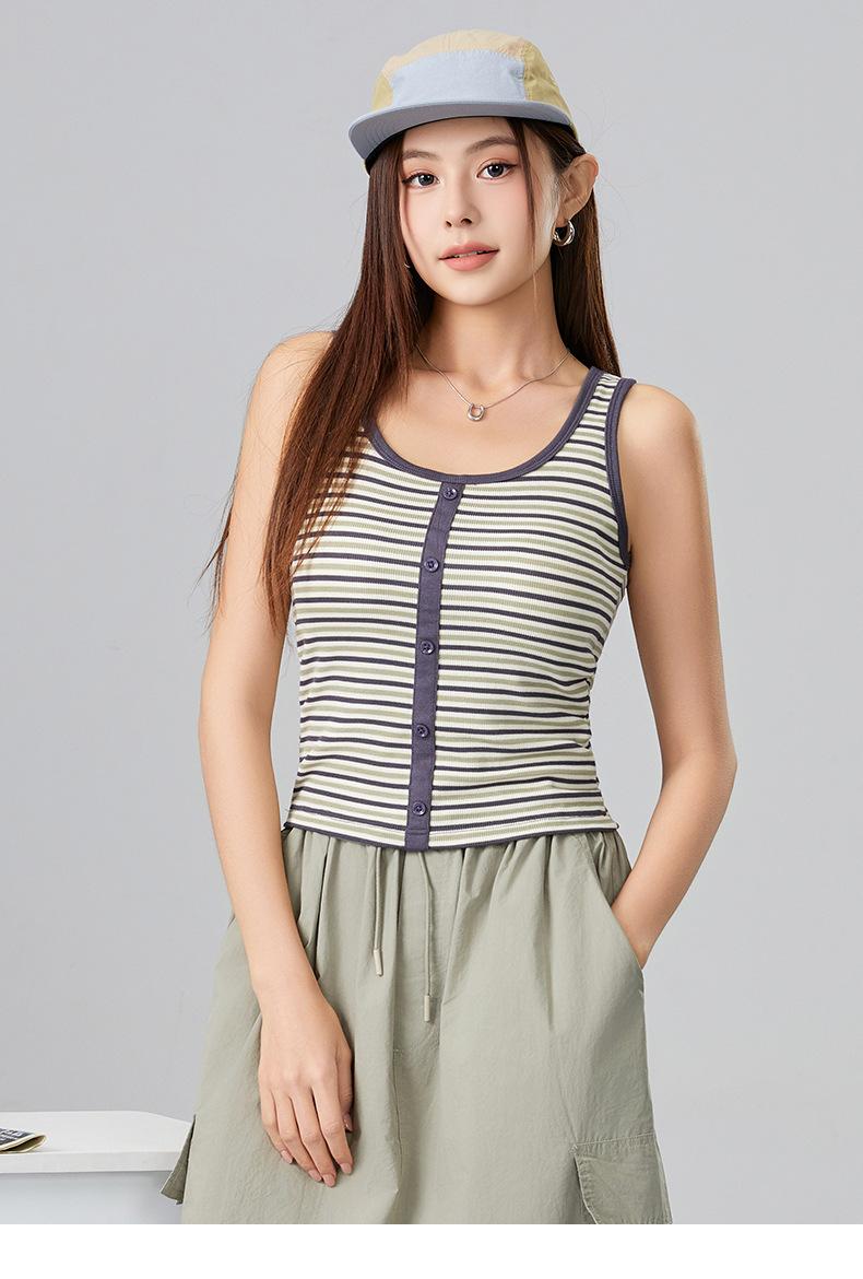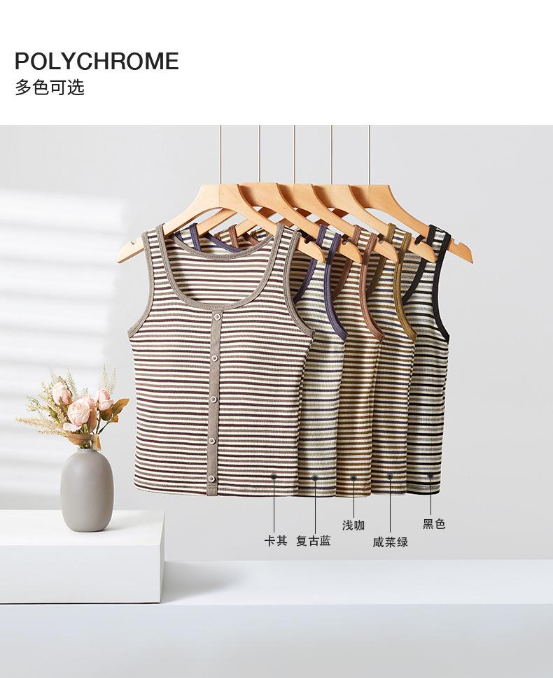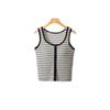 [Personalizado] 2025 Primavera Nuevo Estilo Rayas Escote Bajo Diseño de Botones Falsos Camisola Versátil Casual para Mujer
