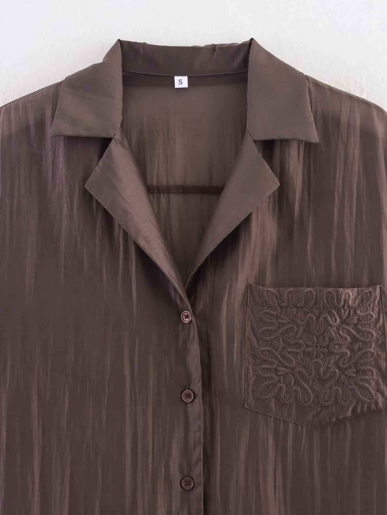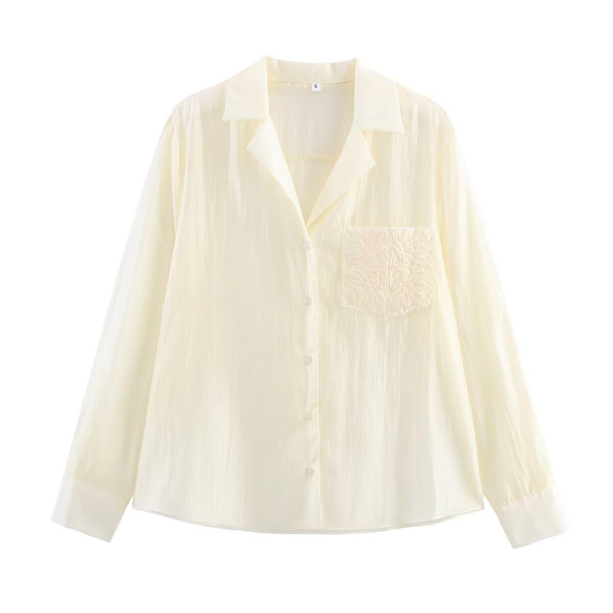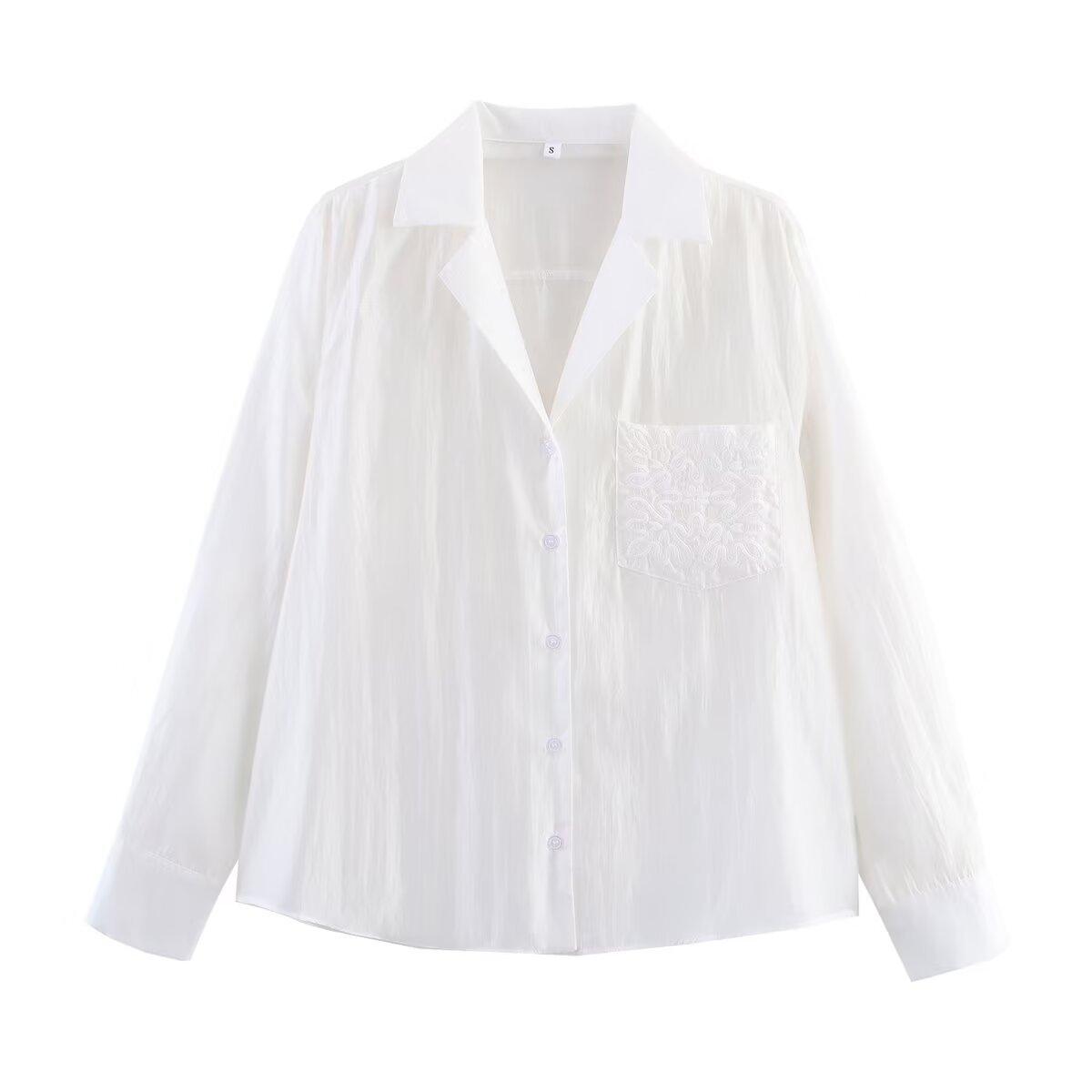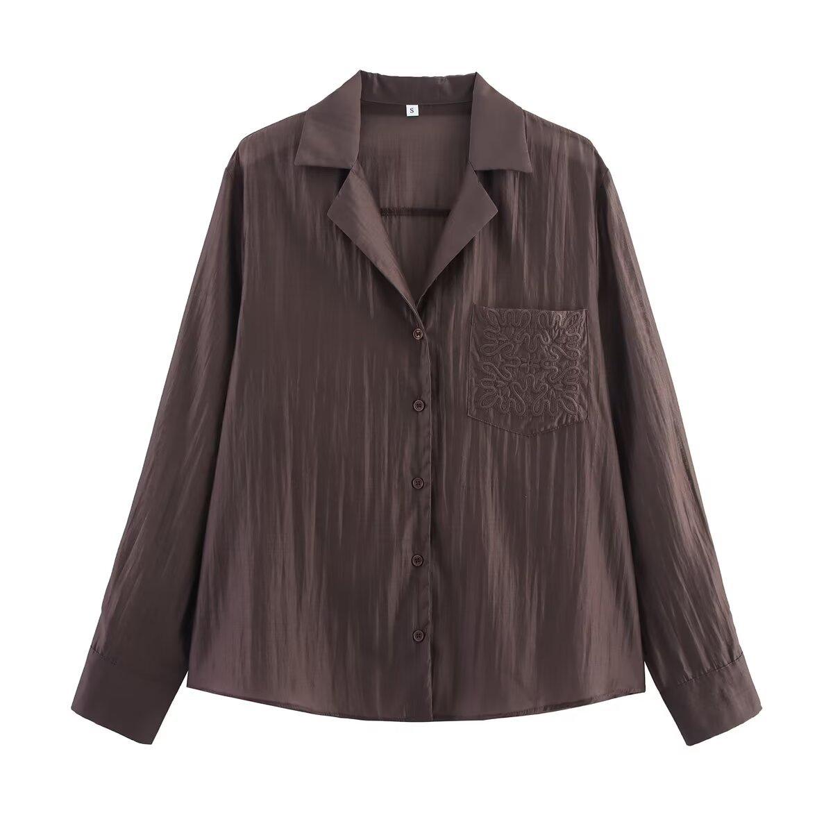 Ropa de mujer transfronteriza 2025 otoño nueva moda casual versátil simple manga larga abotonadura sencilla decoración de bolsillo bordado camisa