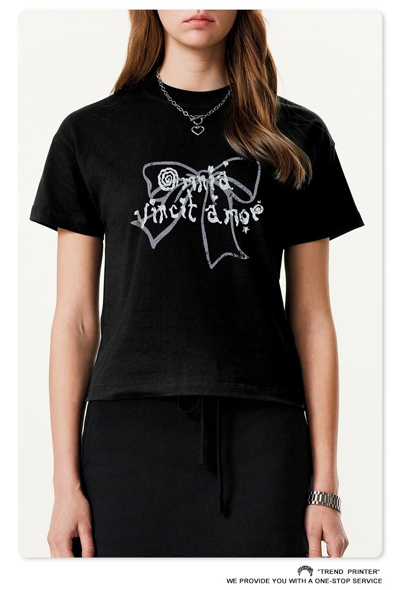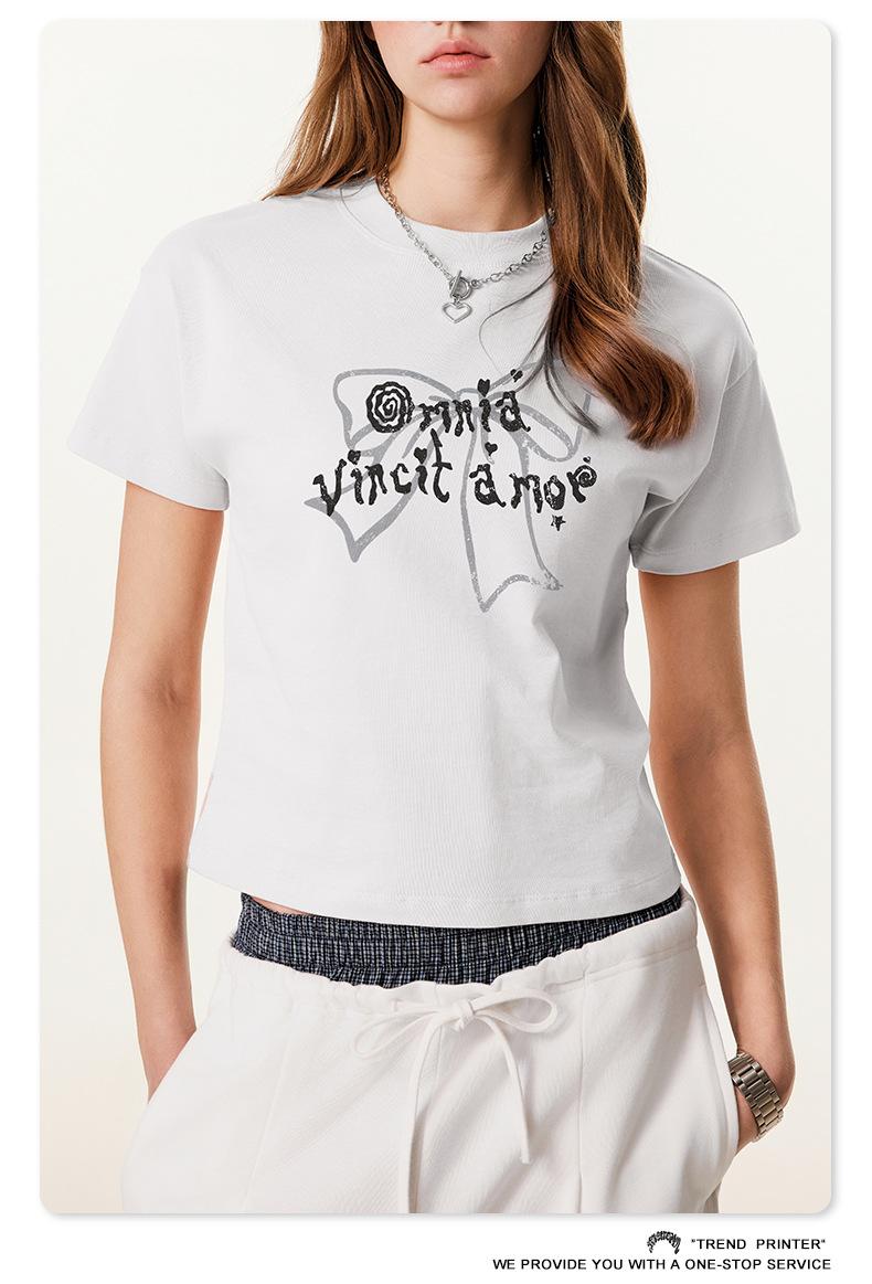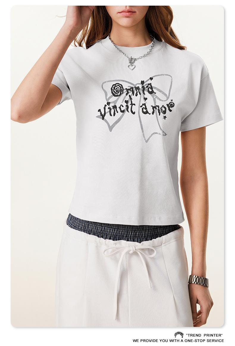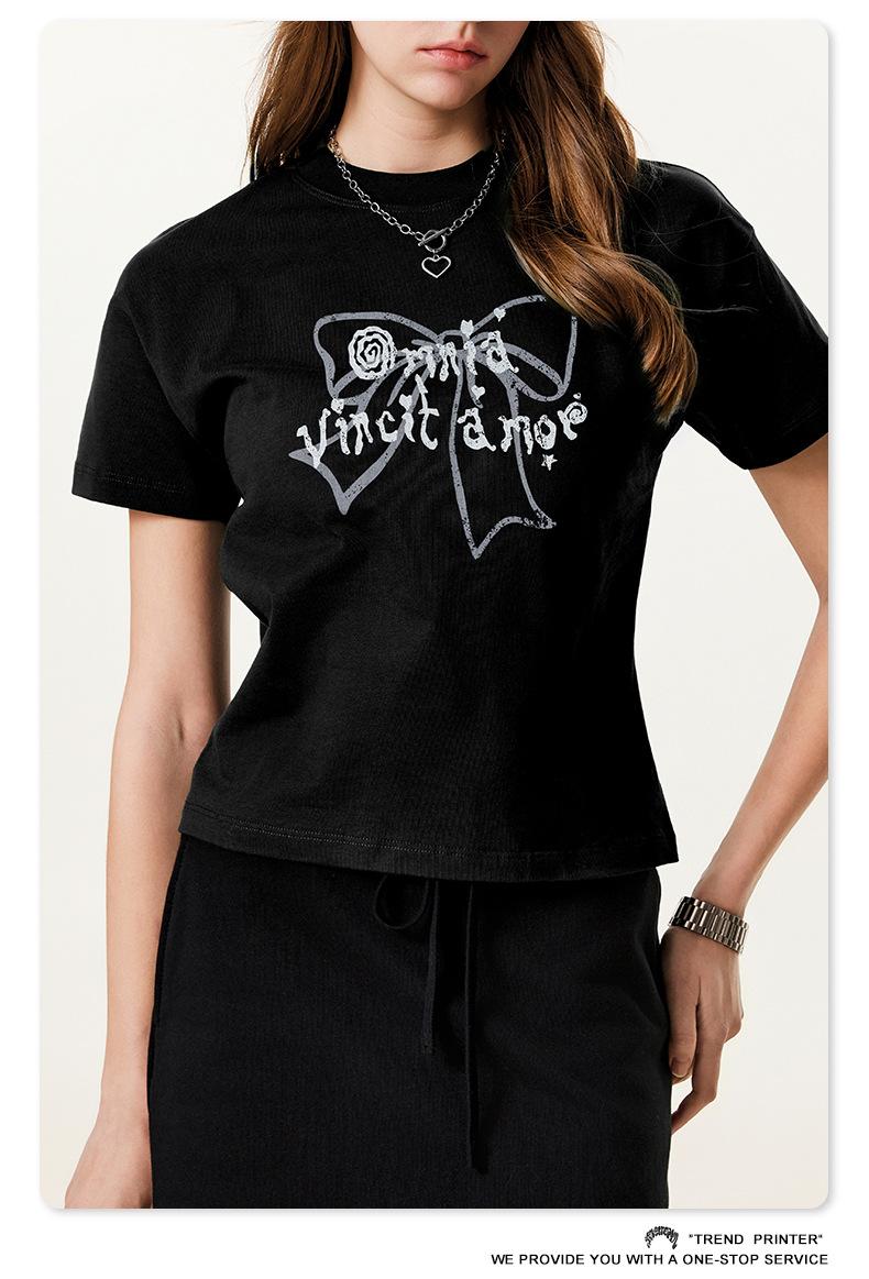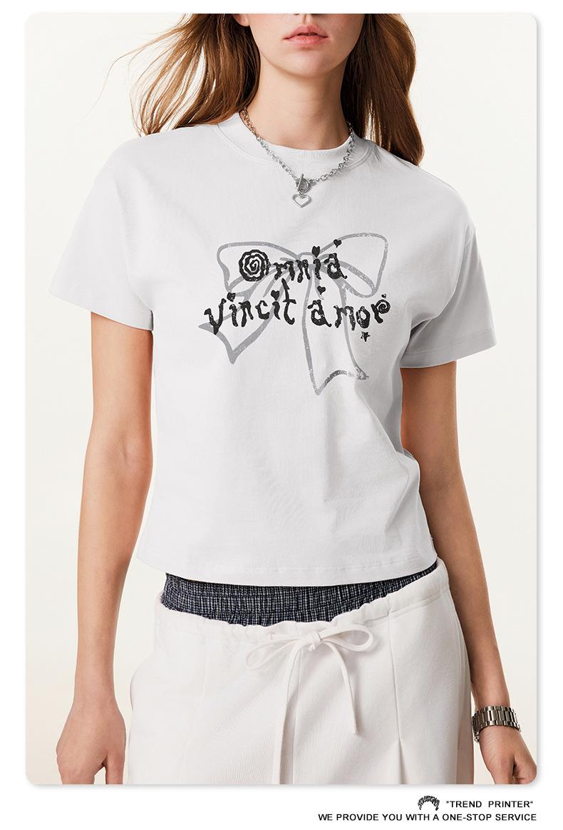 Verano 2025 Nicho Americano Chica Picante Hombro Recto Lazo Manga Corta Camiseta Adelgazante Cuello Redondo Top para Mujer