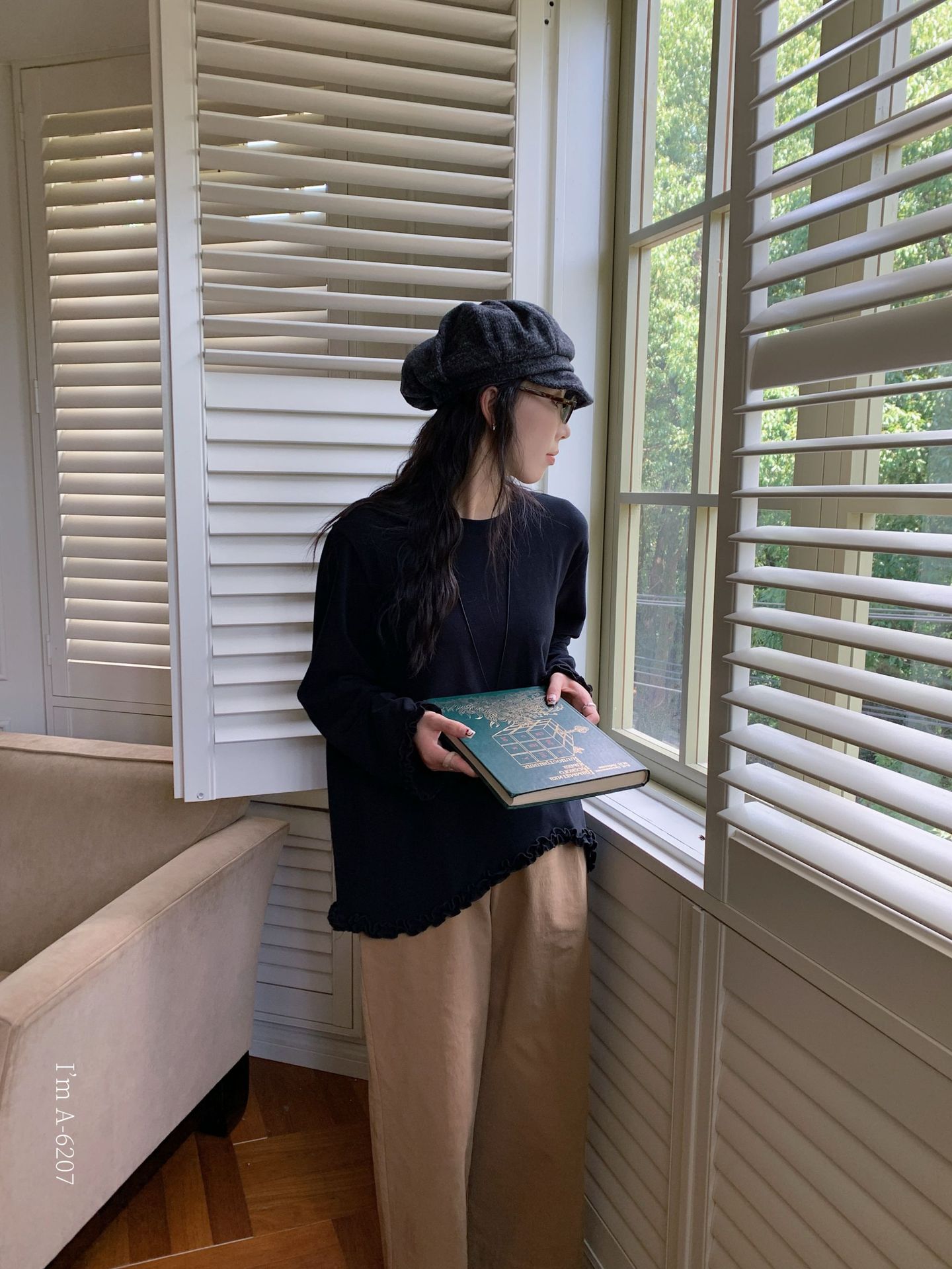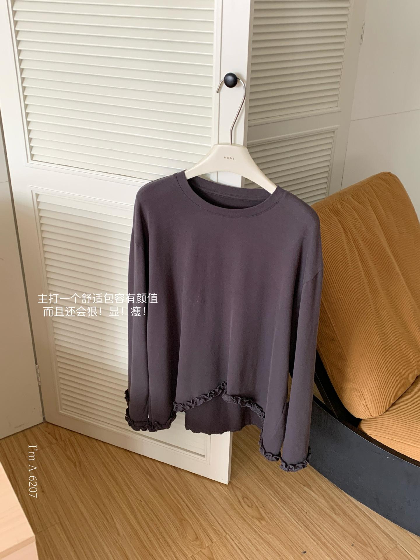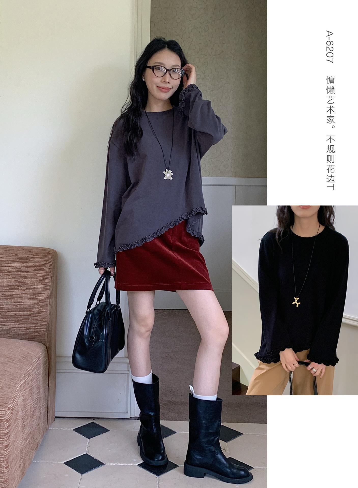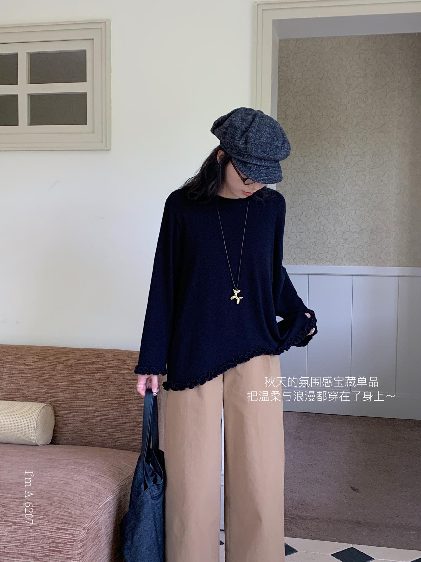 Principios de Otoño Nueva Camiseta de Encaje Irregular de Artista Perezoso para Mujer Diseño con Sentido Casual Manga Larga Temperamento Versátil Top