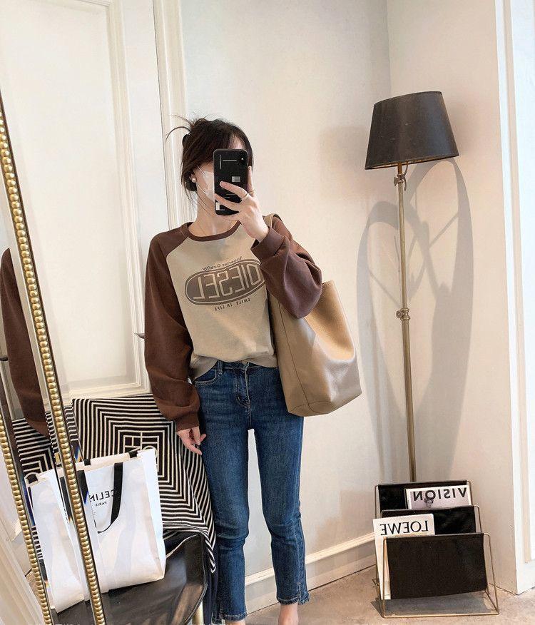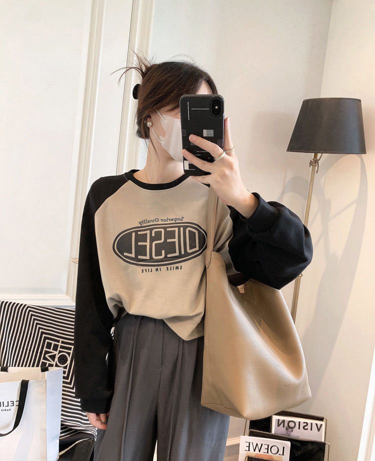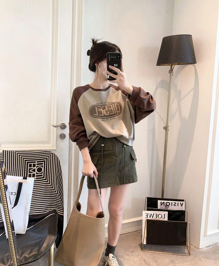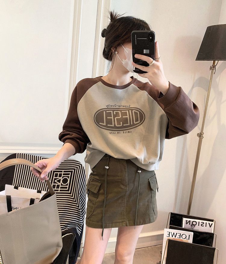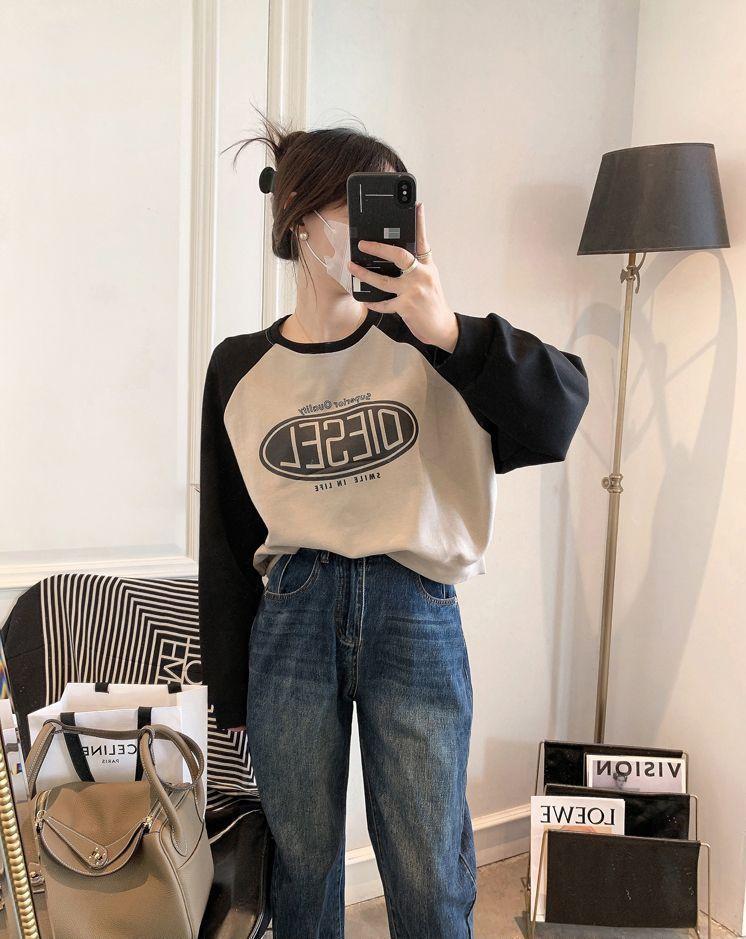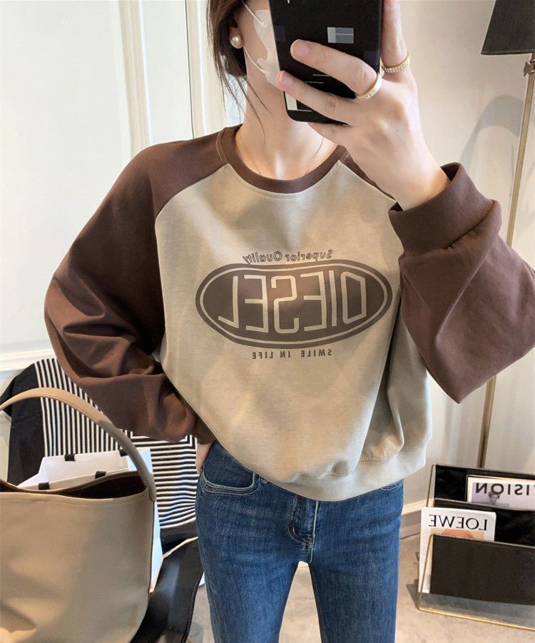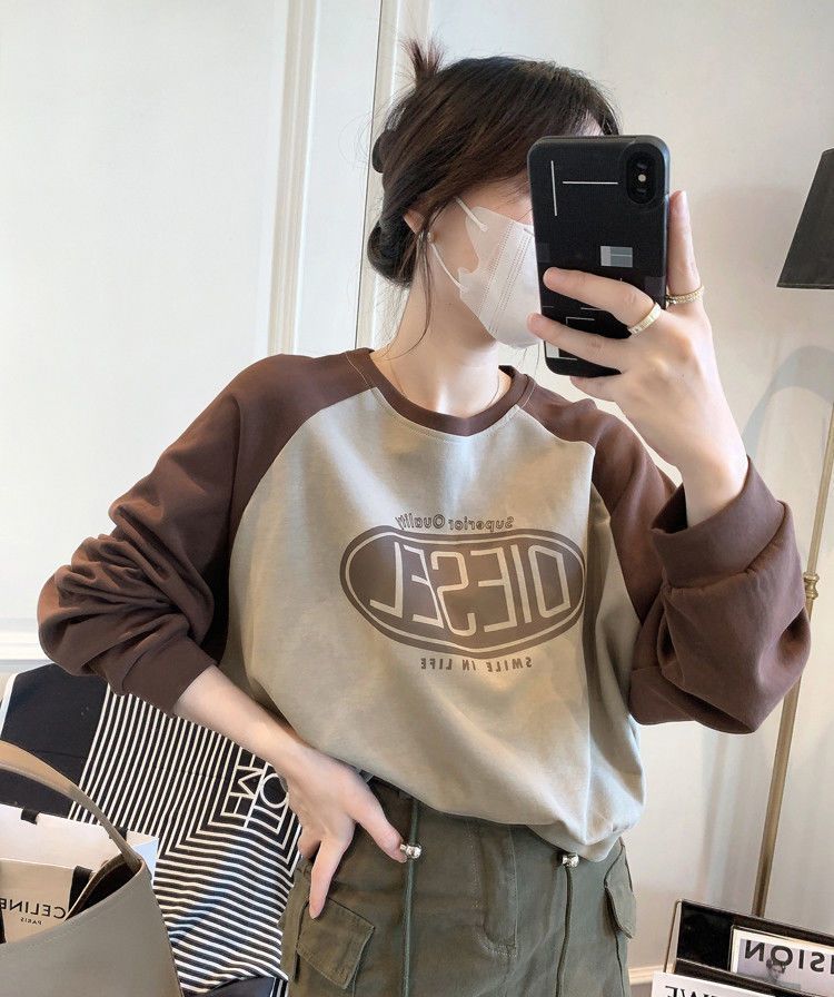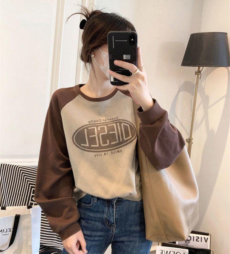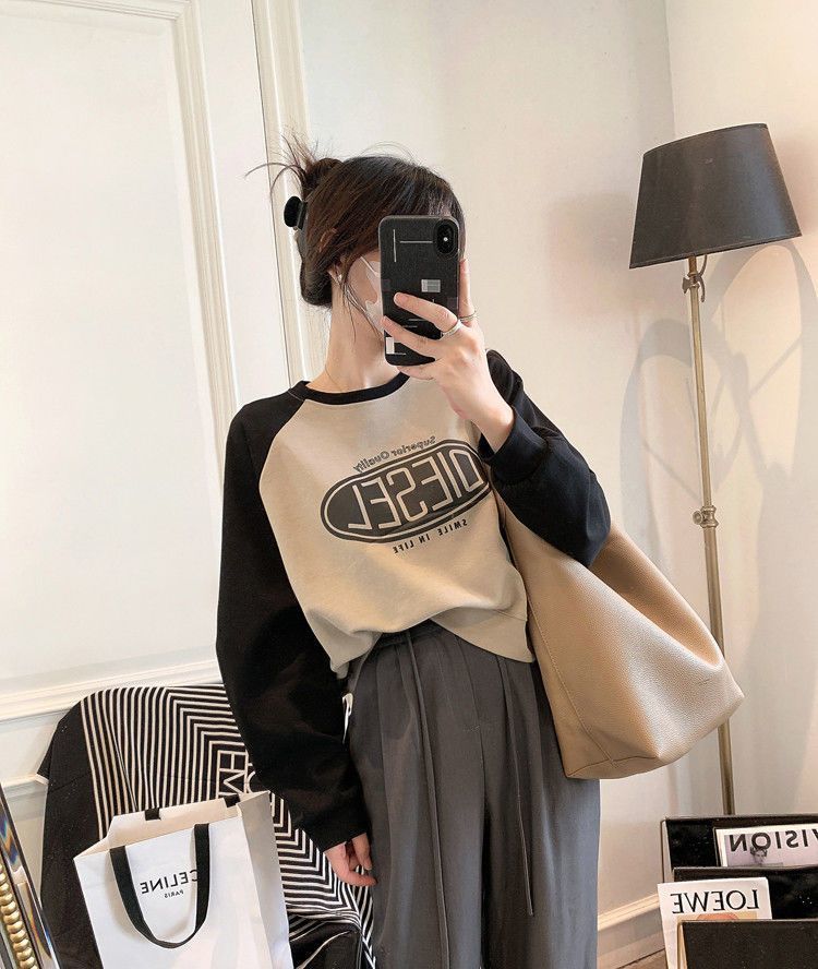 Nueva Camiseta de Primavera y Otoño para Mujer Bloque de Color Raglán Manga Larga Hombro Recto Sudadera para Mujer Otoño Delgada Suelta Corta Adelgazante