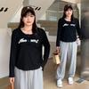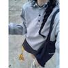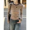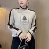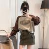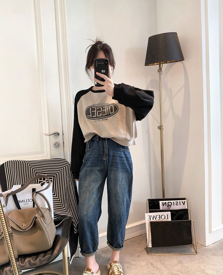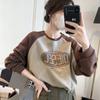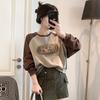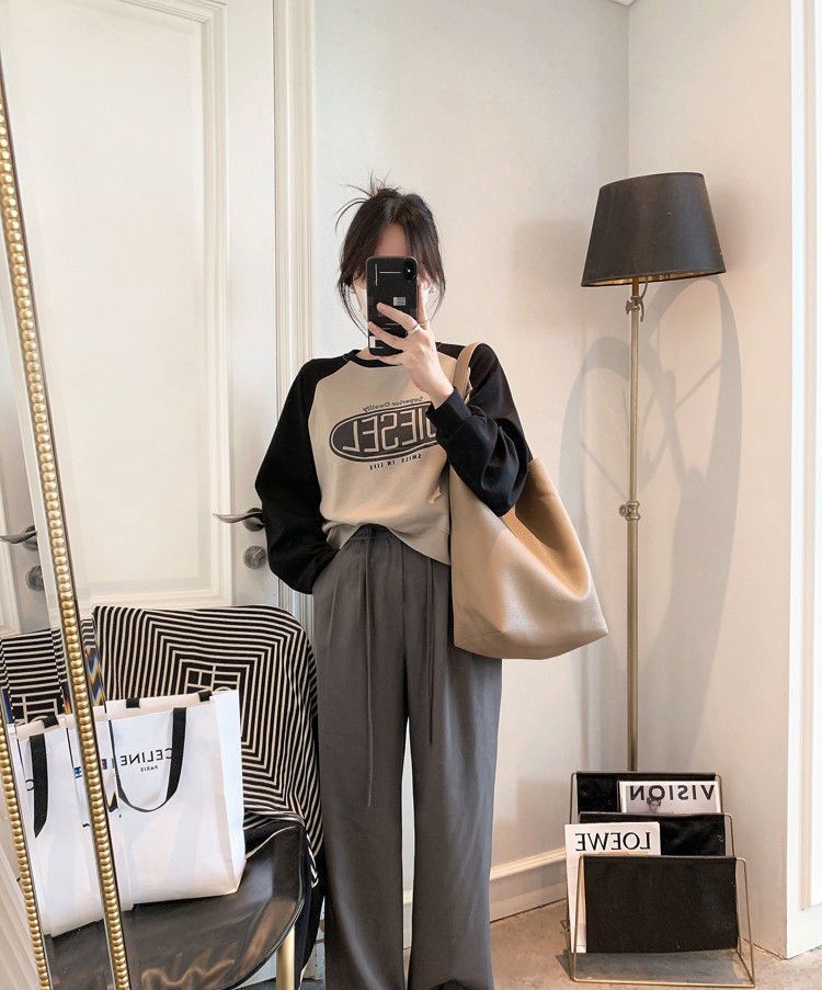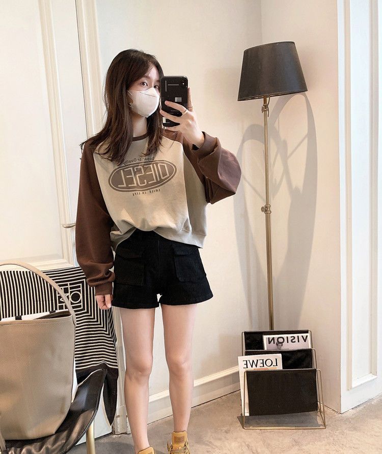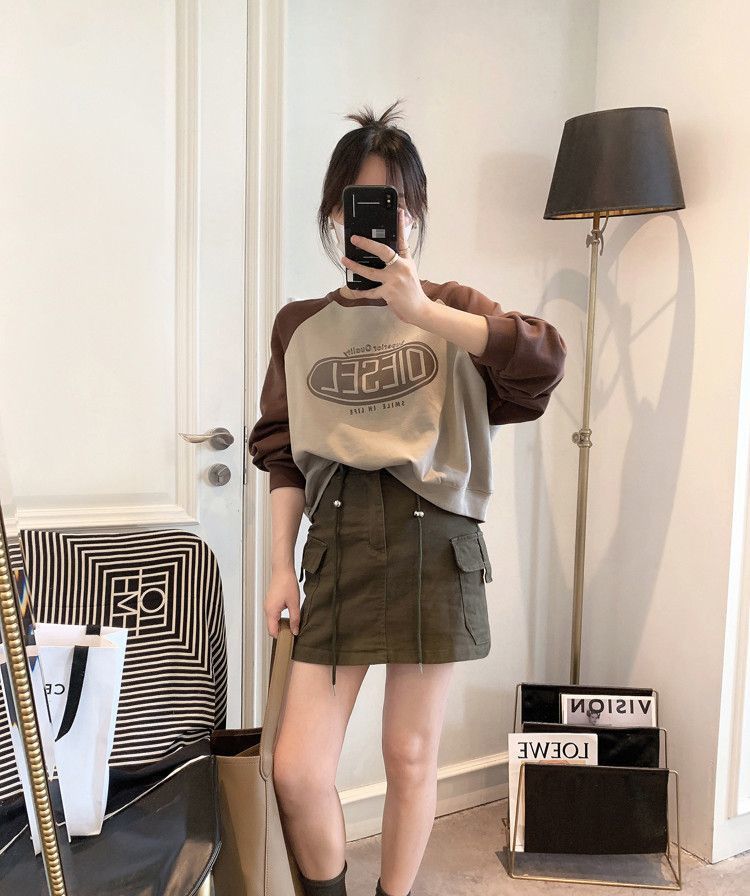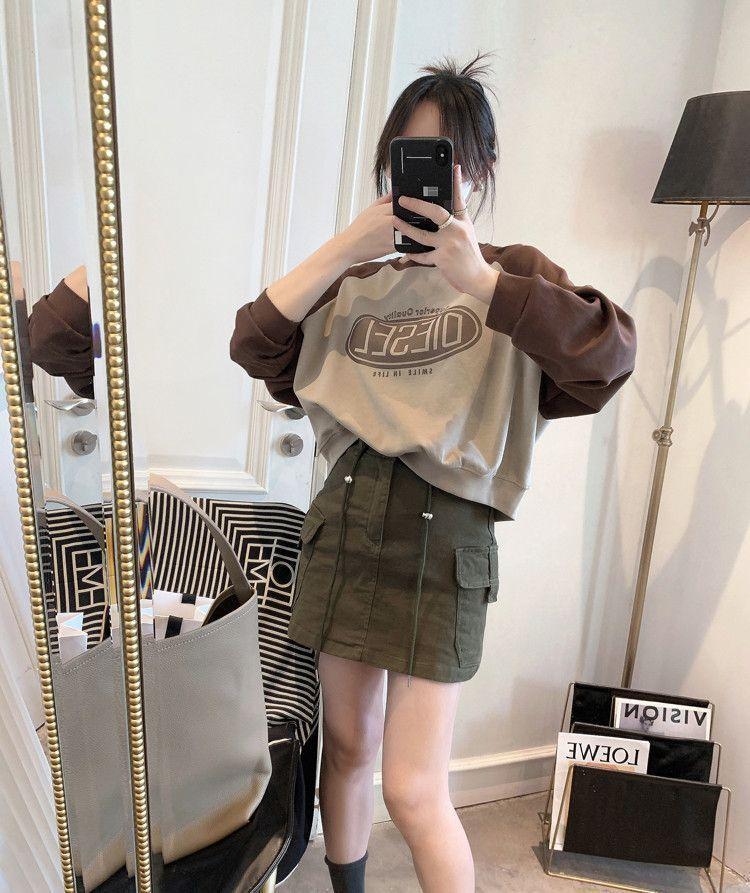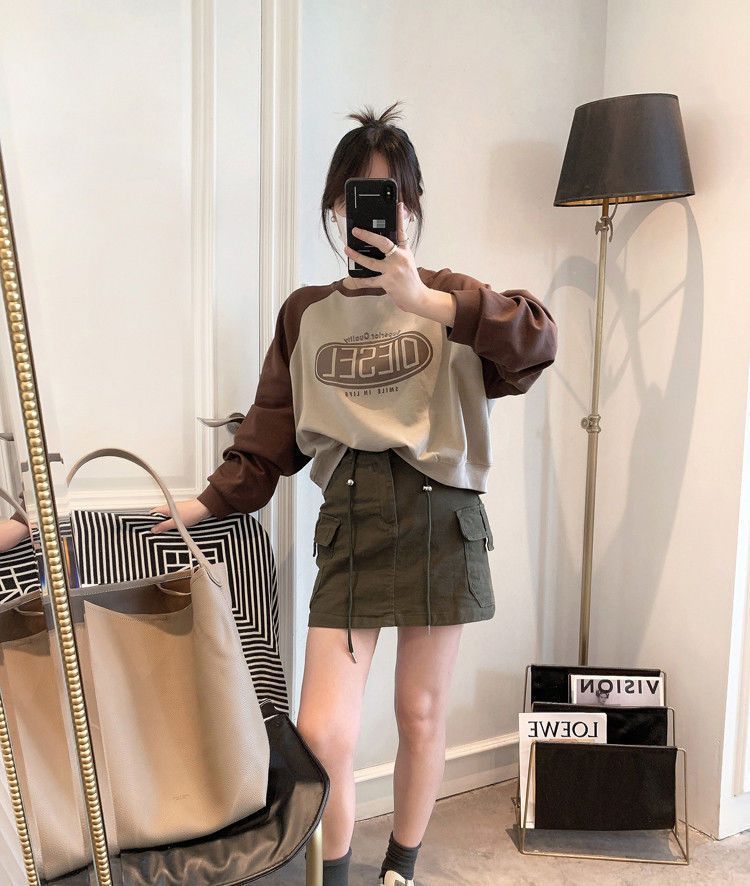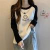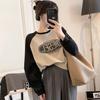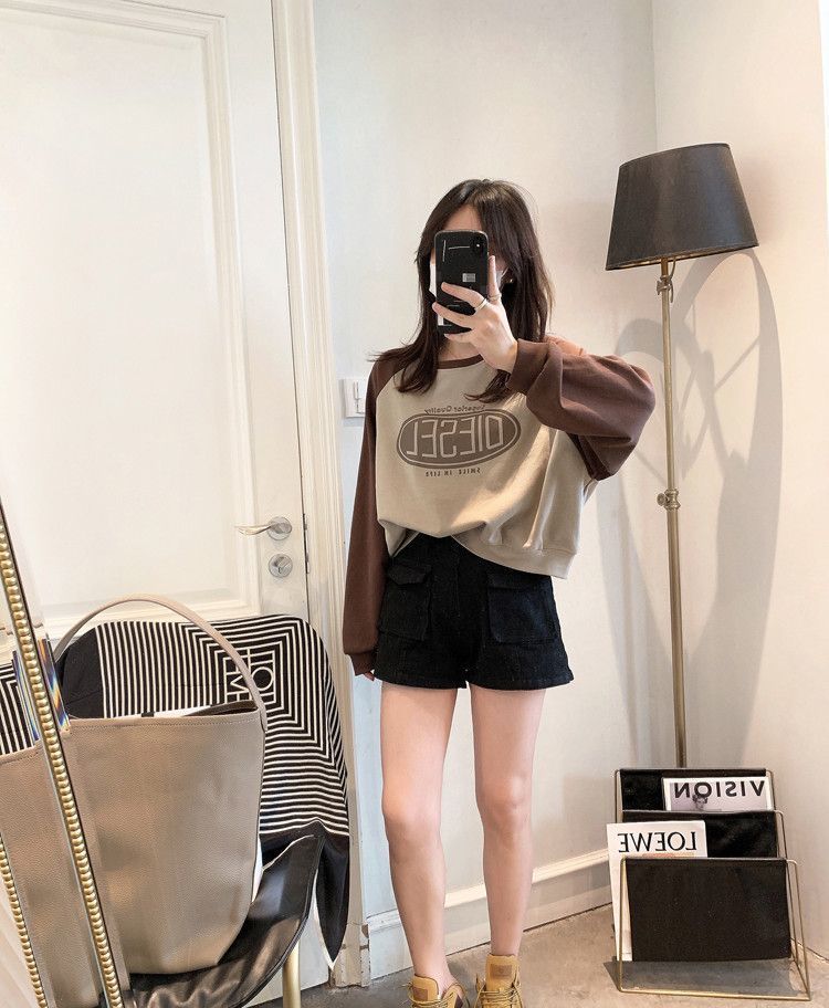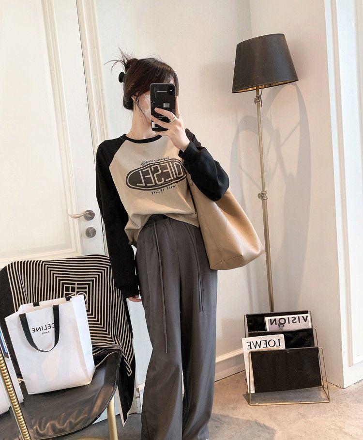 Nueva Camiseta de Primavera y Otoño para Mujer Bloque de Color Raglán Manga Larga Hombro Recto Sudadera para Mujer Otoño Delgada Suelta Corta Adelgazante