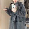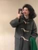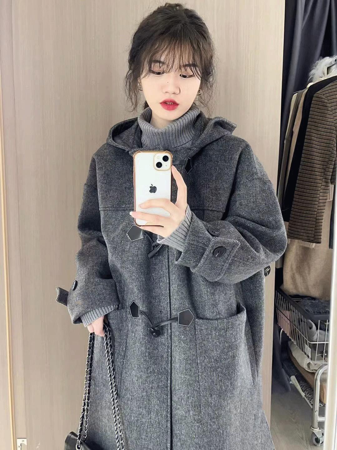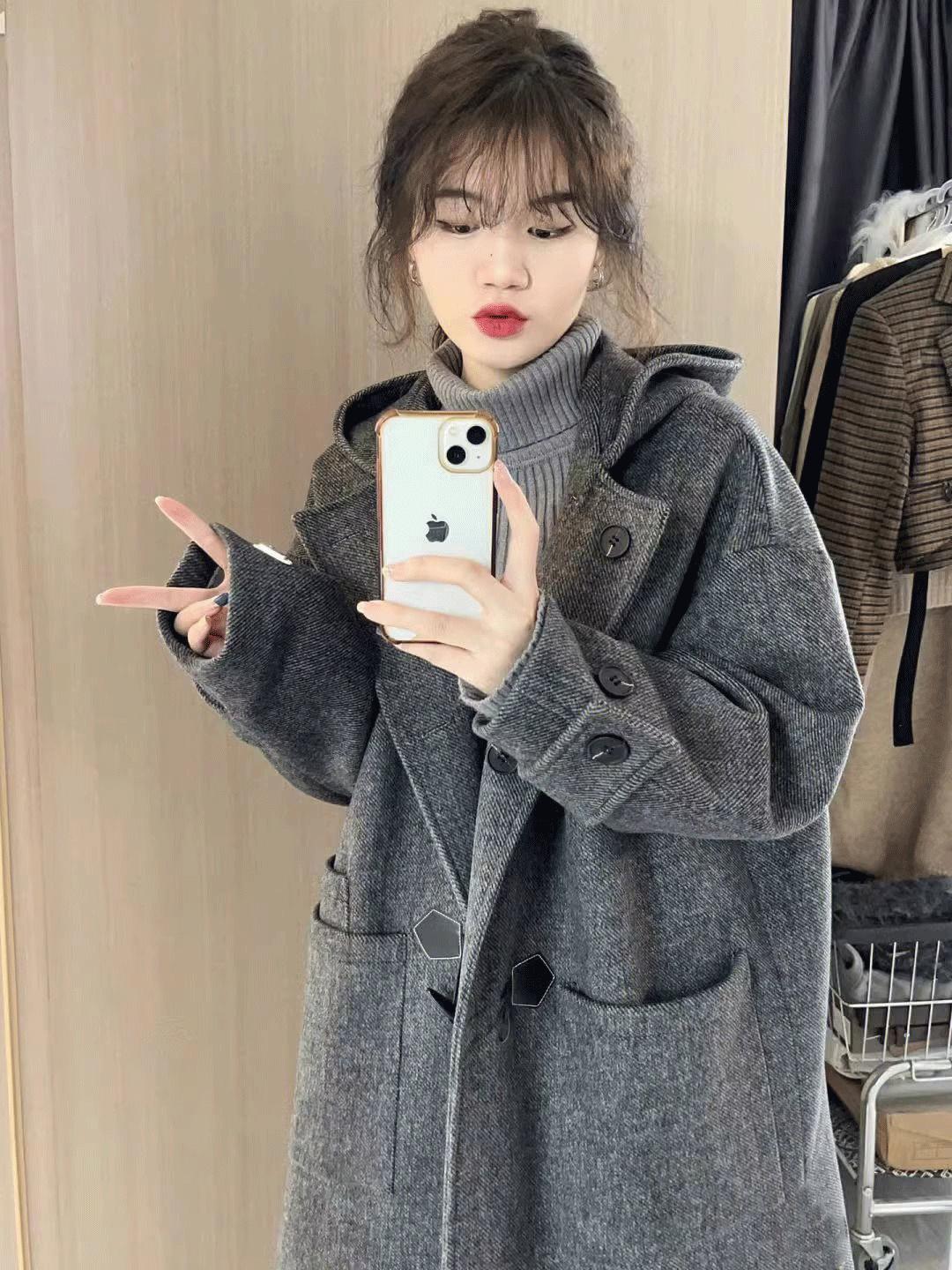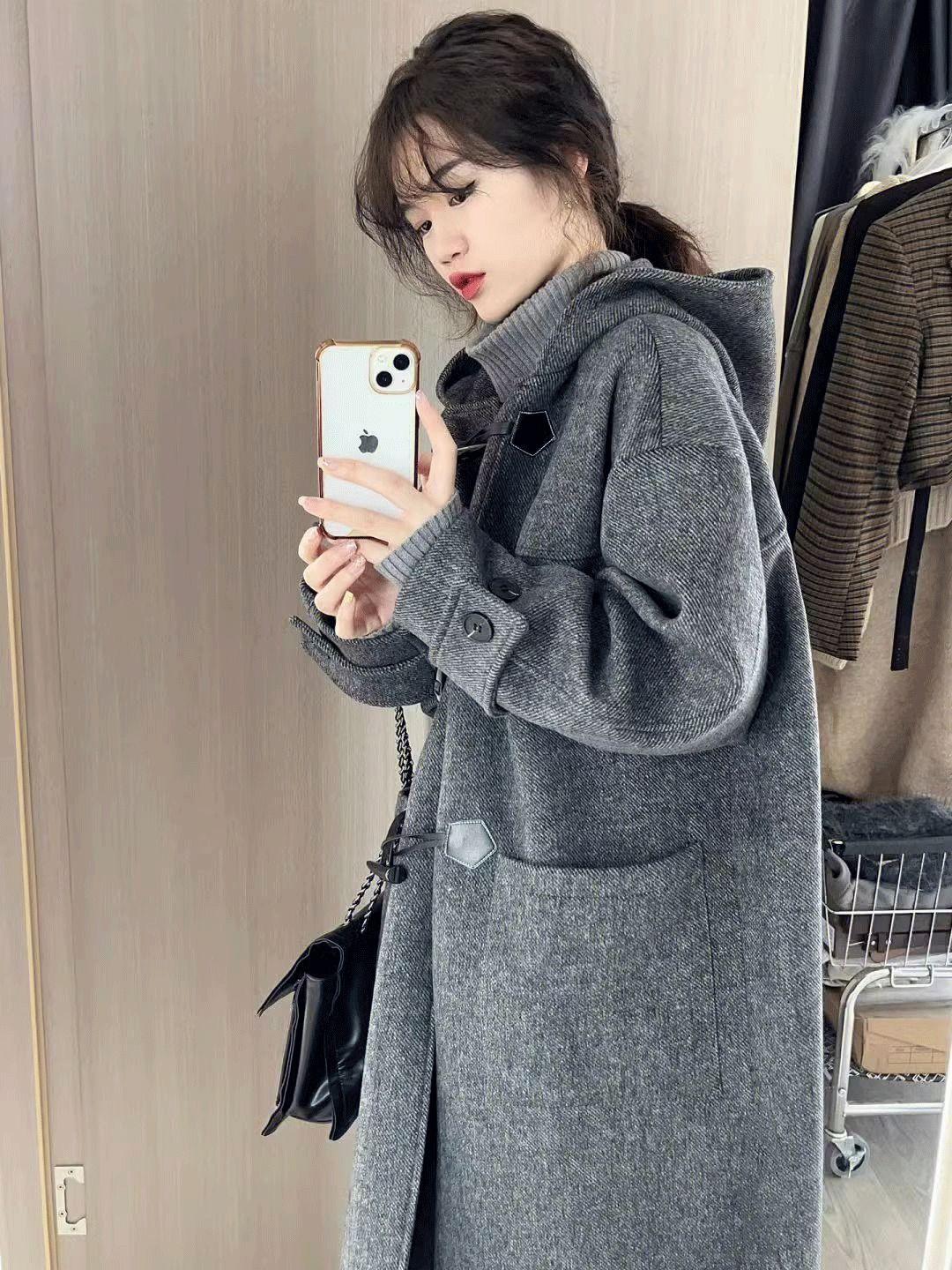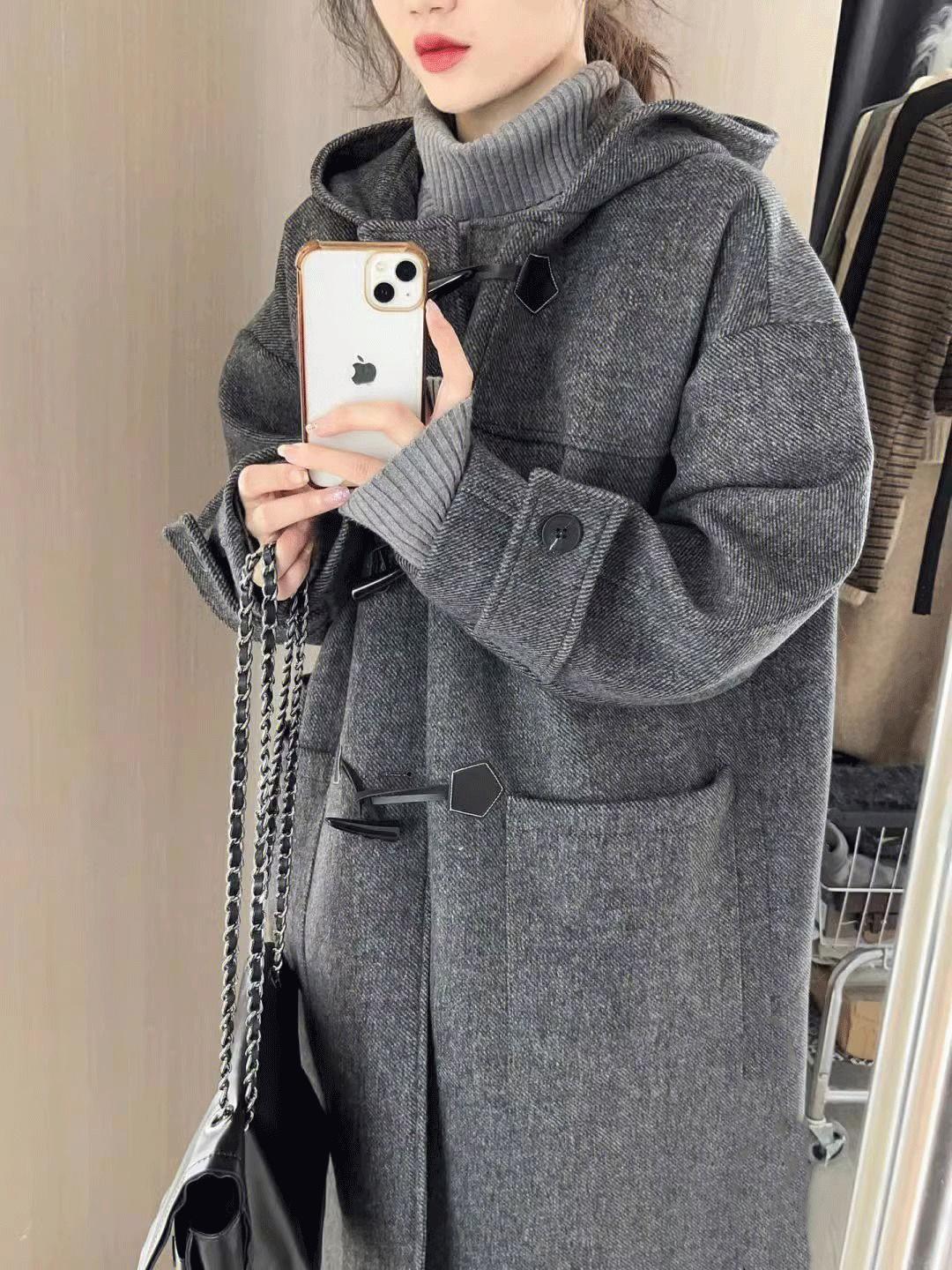 Abrigo de Lana Simple con Botones de Cuerno Estilo Coreano para Mujer 2025 Otoño e Invierno Nuevo Estilo Forrado de Vellón de Gama Alta con Capucha Abrigo de Lana a la Moda