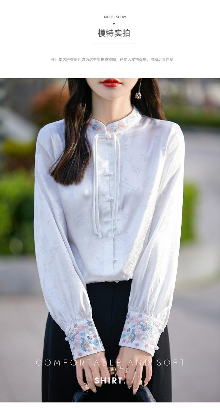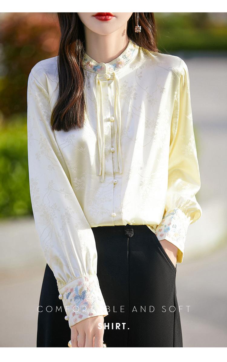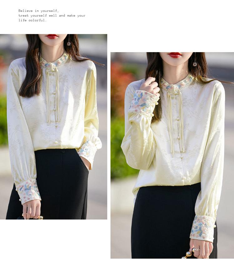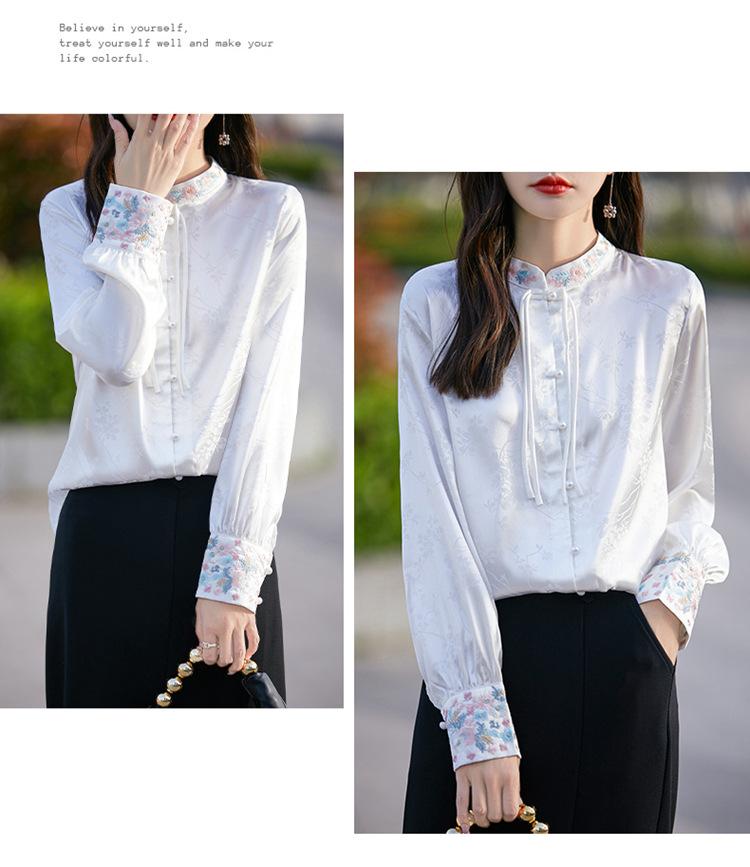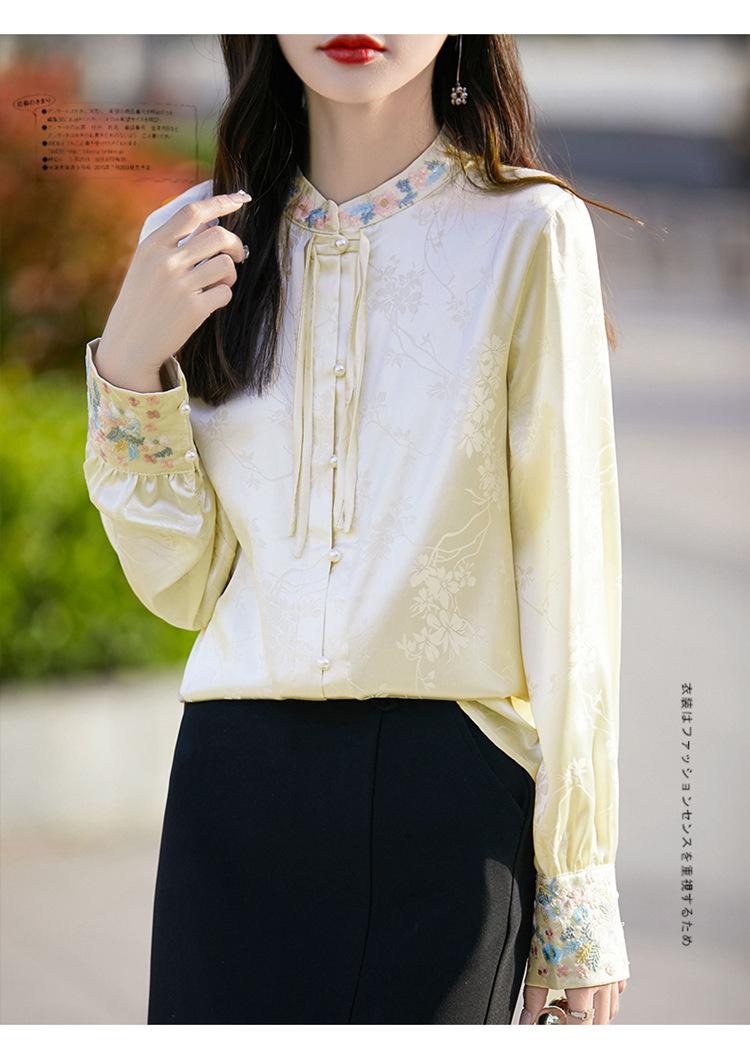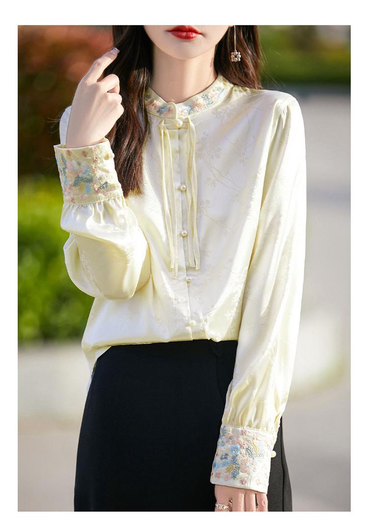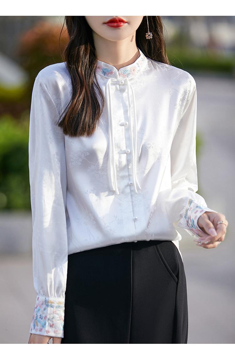 Camisa de cuello vertical estilo nacional chino para mujer, nueva primavera 2025, con diseño de hebilla bordada y manga larga.